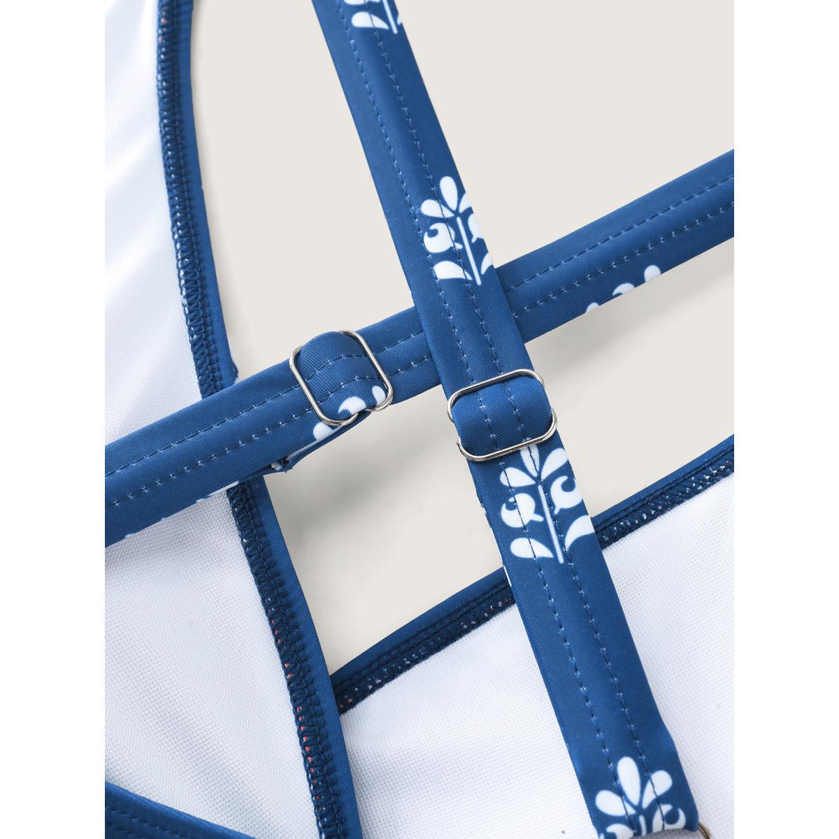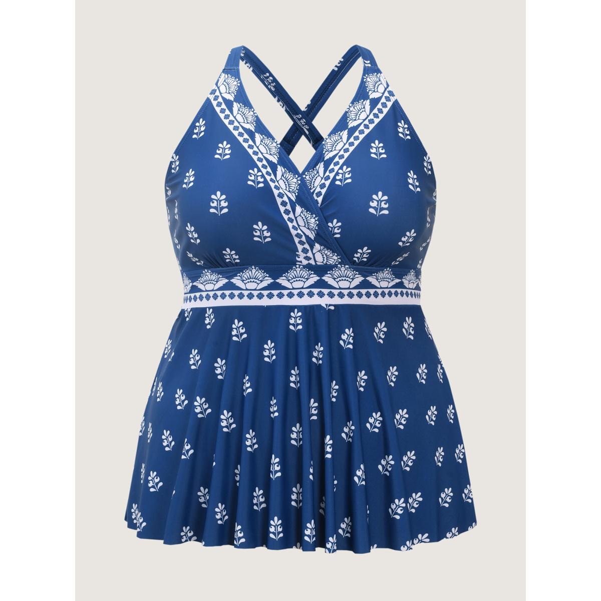 Plus Size Boho Print A-Line Adjustable Swim Top Women's Swimwear Mediumblue Resort High stretch Bodycon Overlap Collar Curve Swim Tops BloomChic 26/4X