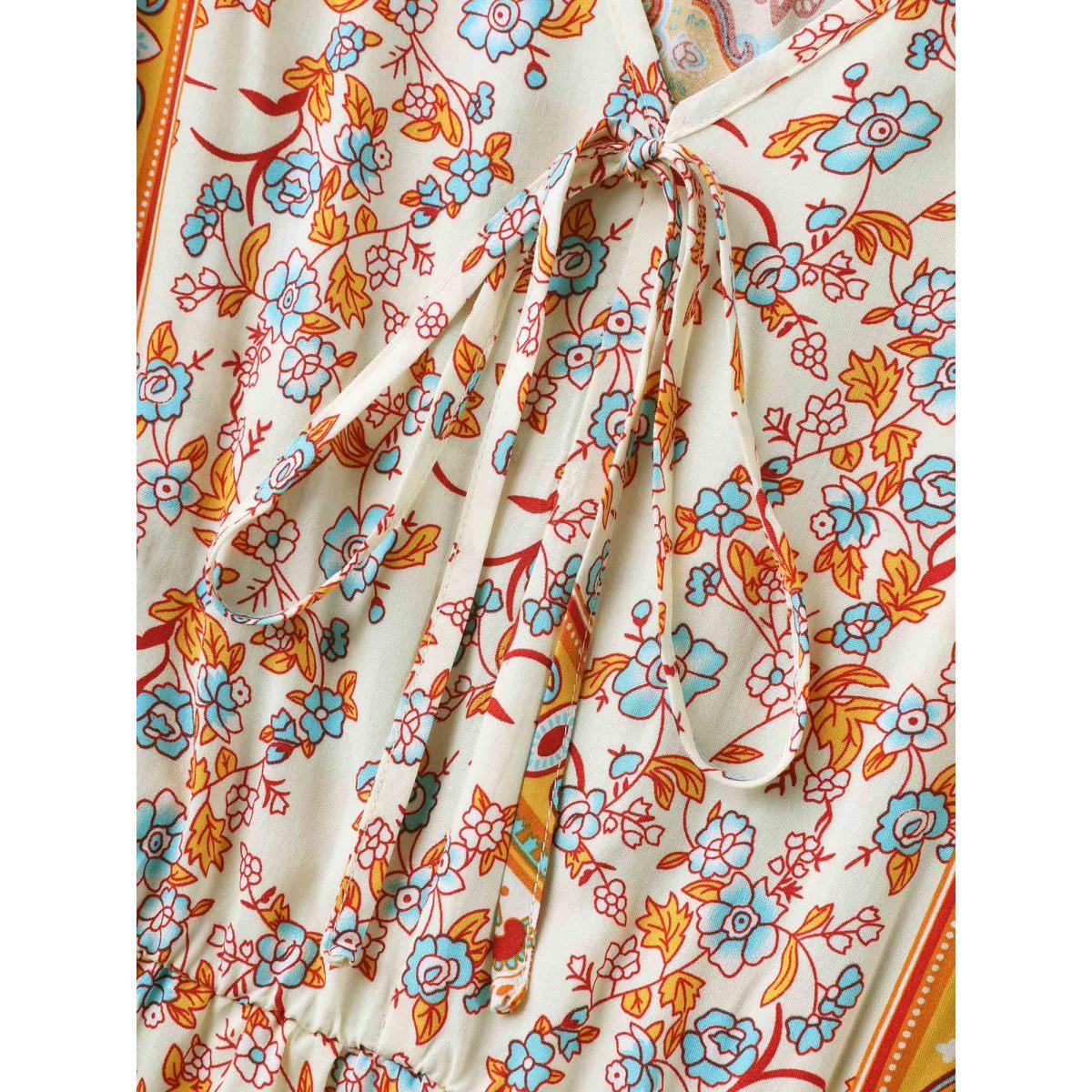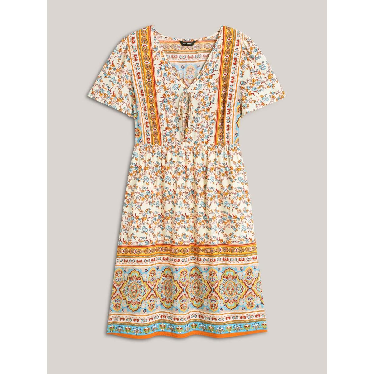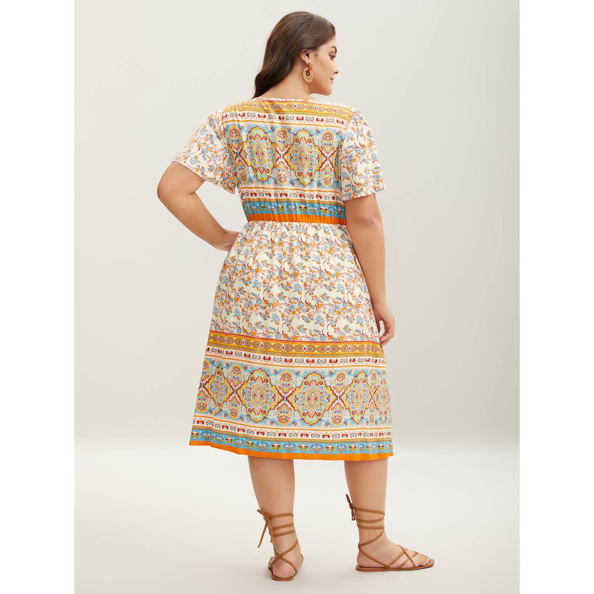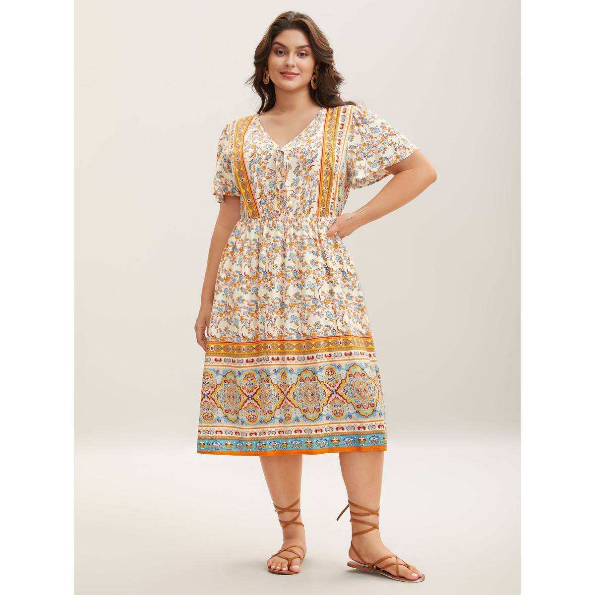 Plus Size Boho Print Adjustable Neck Ties Midi Dress Lightyellow Women V-neck Short sleeve Curvy BloomChic 12/L