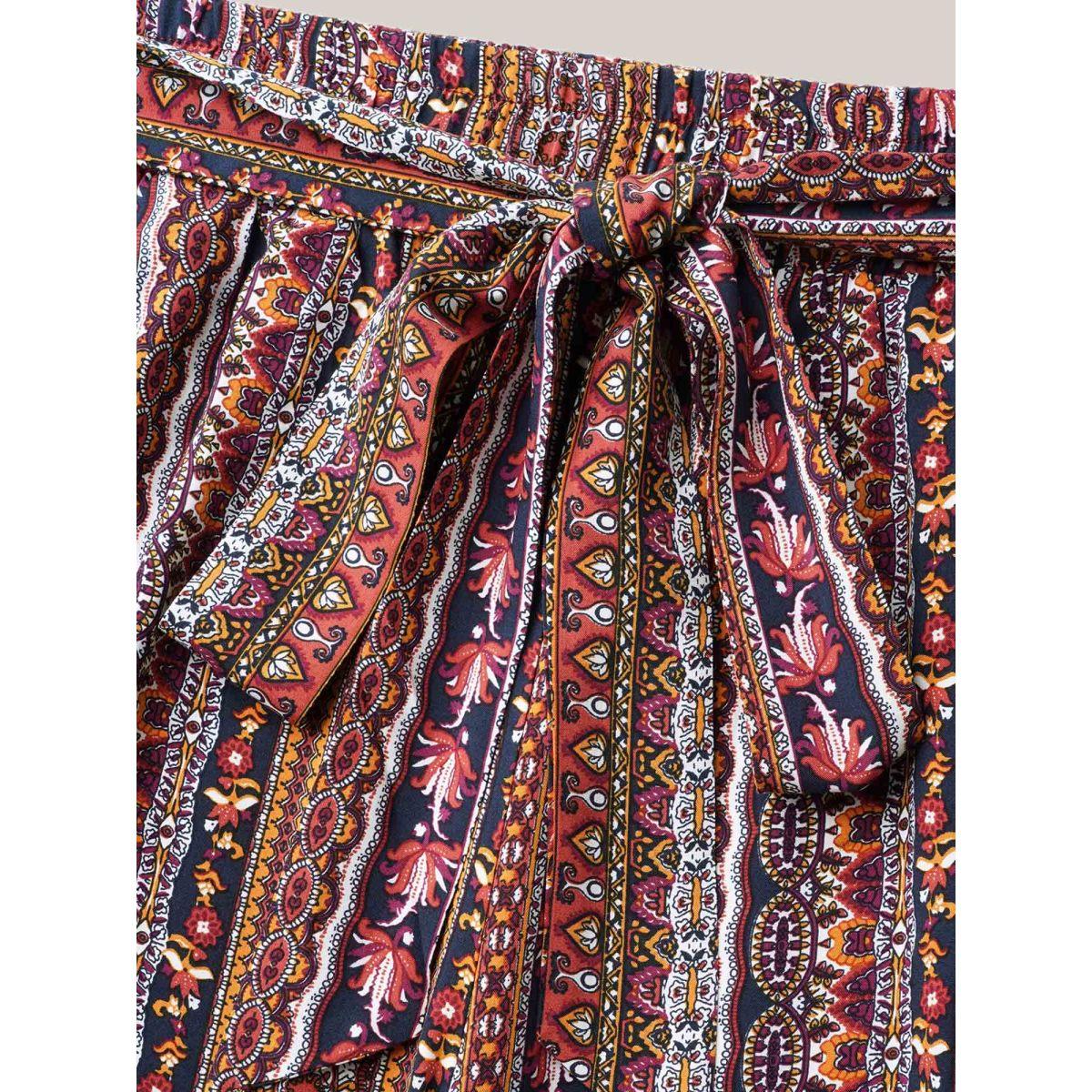 Plus Size Boho Print Belted Flared Pants Women Multicolor Boho Wide Leg Mid Rise Vacation Pants BloomChic 28/5X