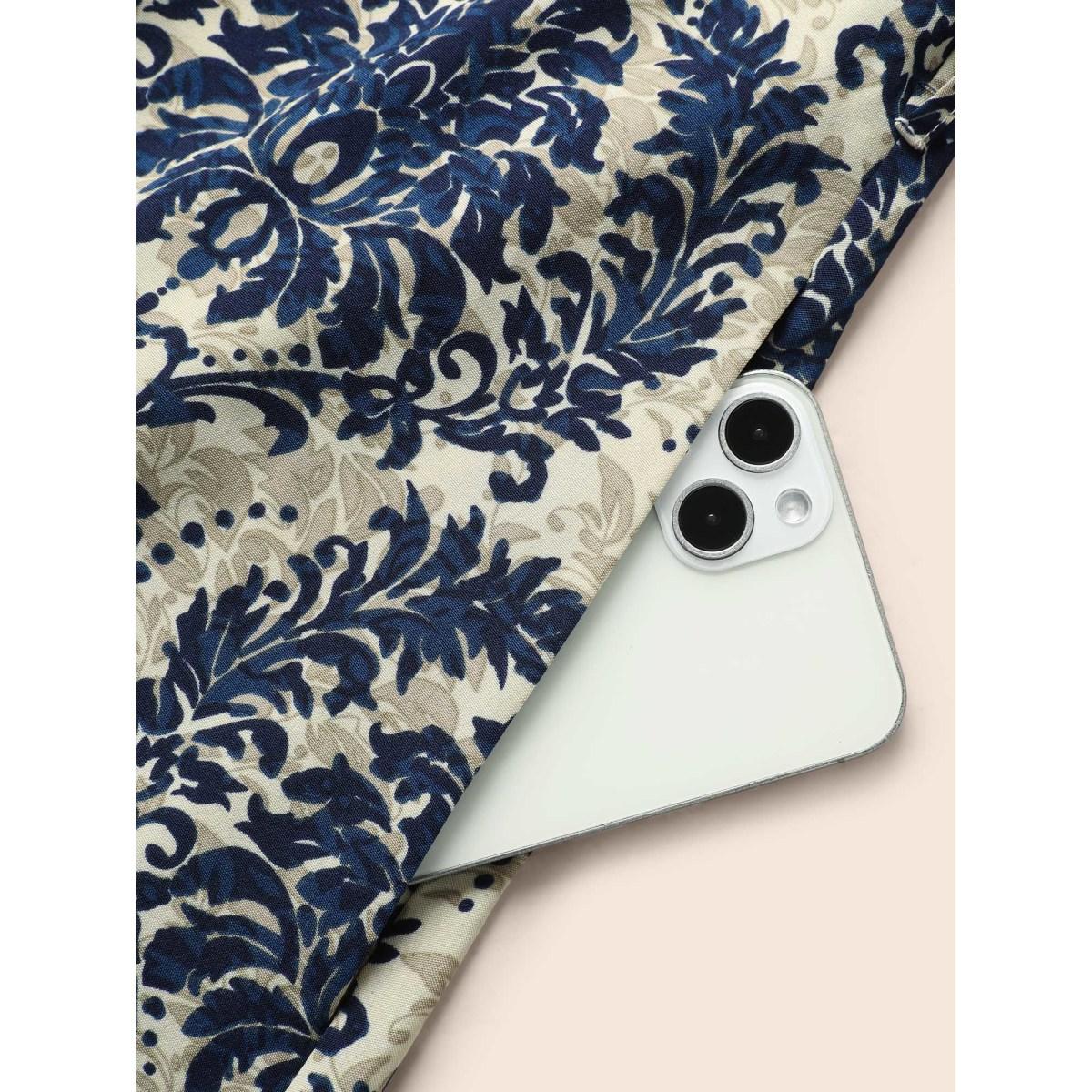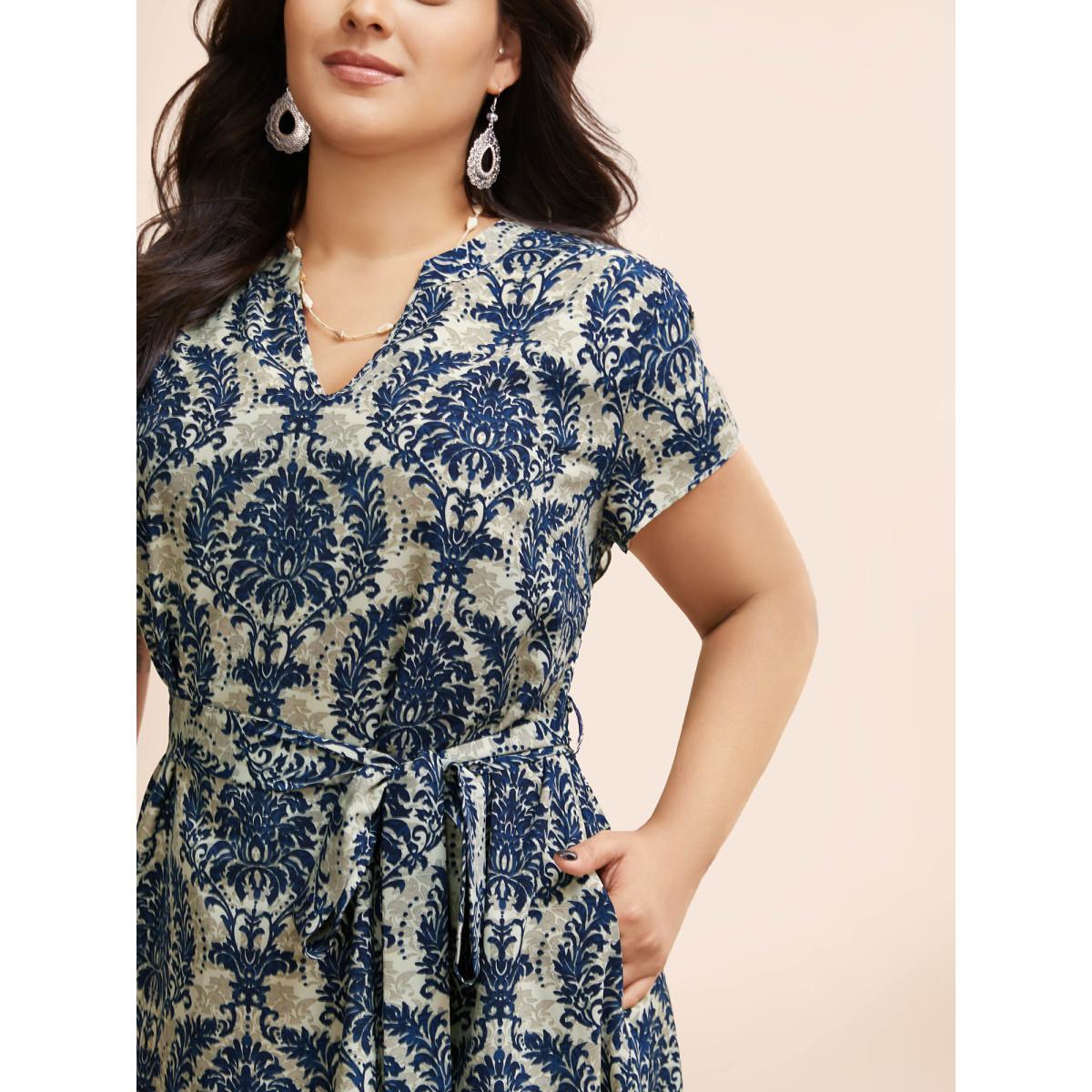 Plus Size Boho Print Belted Pocket Split Side Dress DarkBlue Women Resort Belted V-neck Elbow-length sleeve Curvy Midi Dress BloomChic 10/M