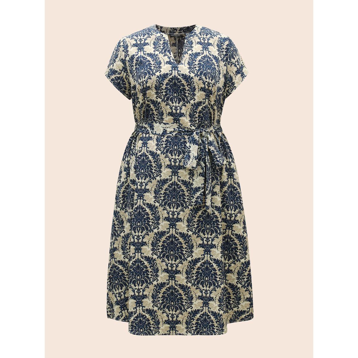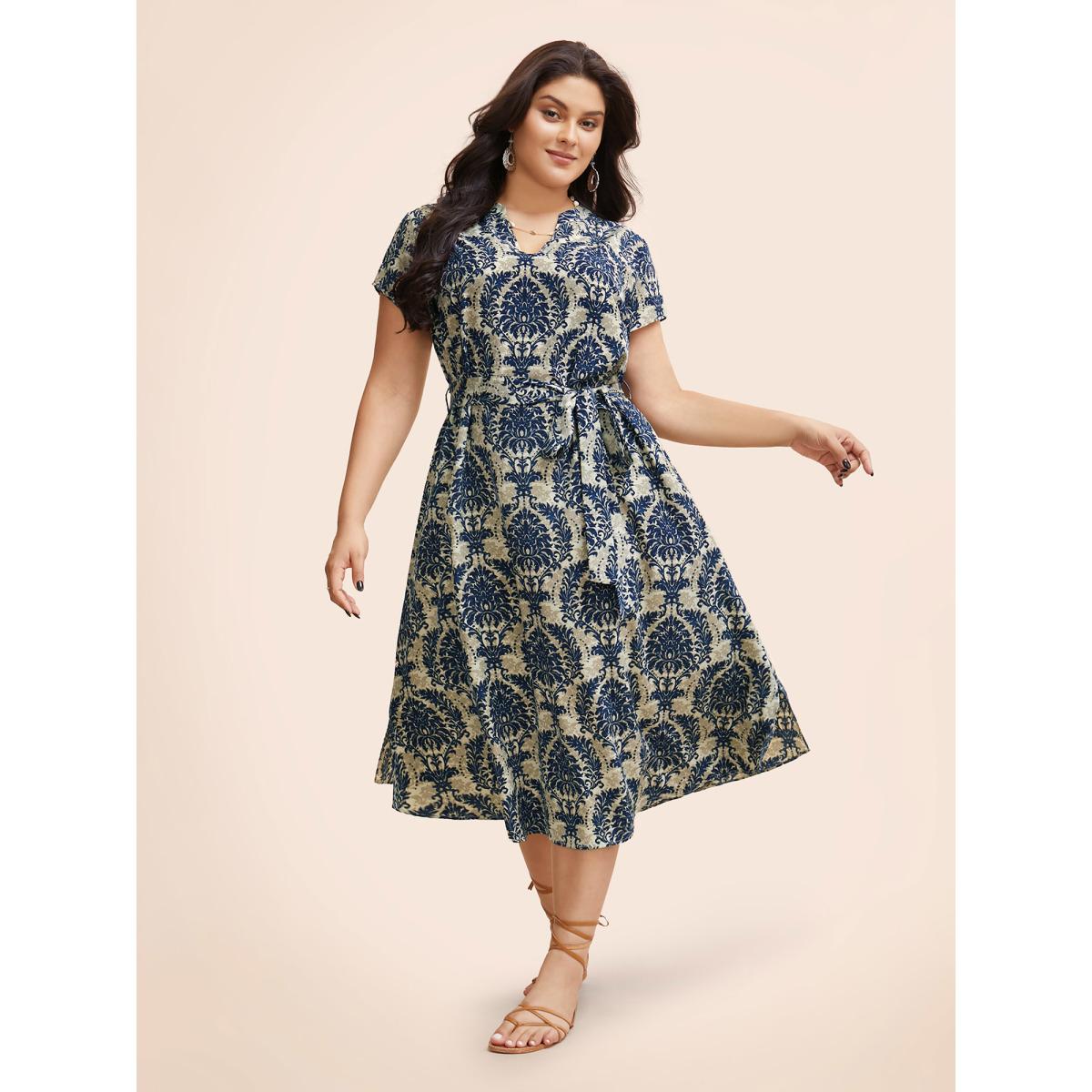 Plus Size Boho Print Cap Sleeve Belted Dress Aegean Women Resort Belted Flat collar with V-notch Cap Sleeve Curvy BloomChic 14-16/1X