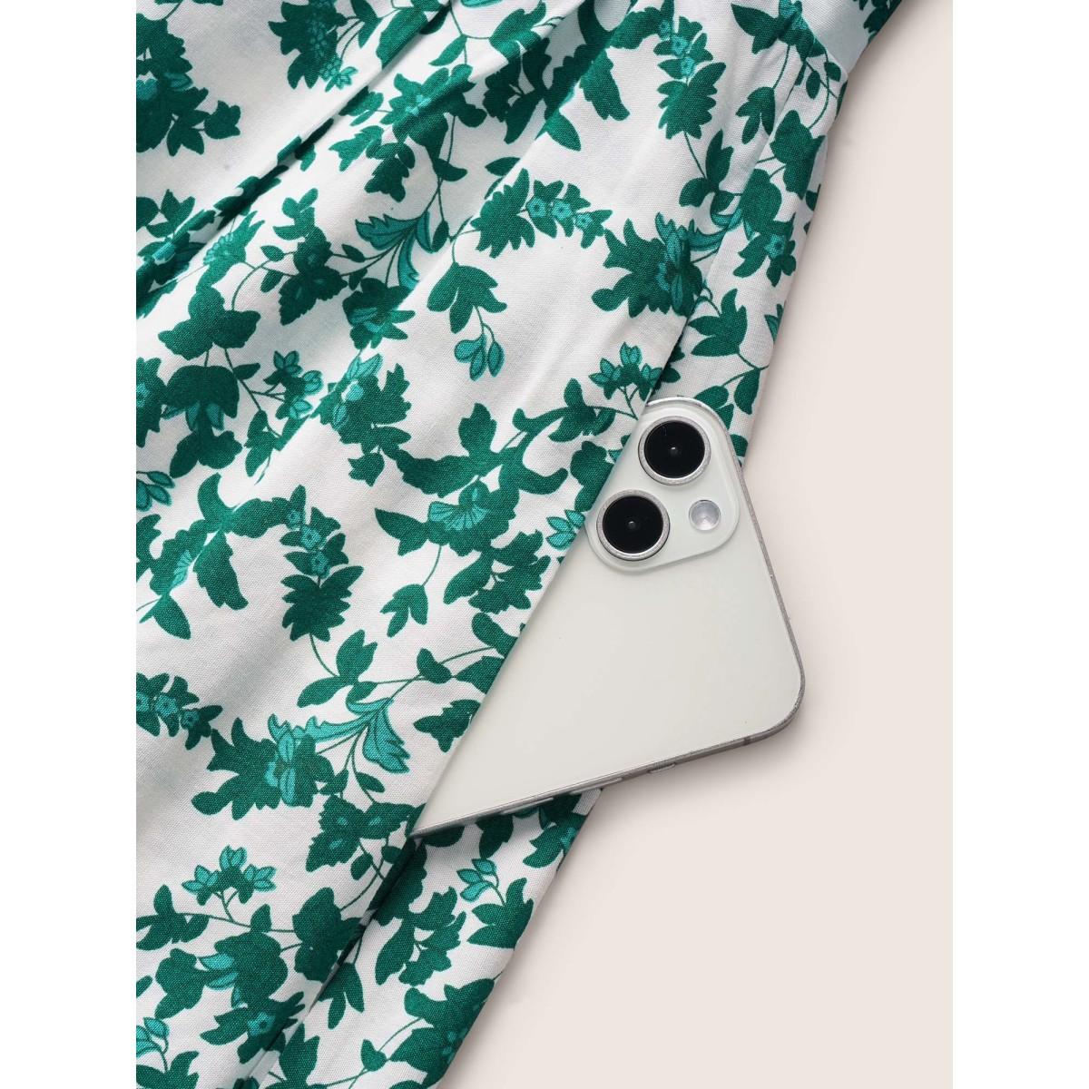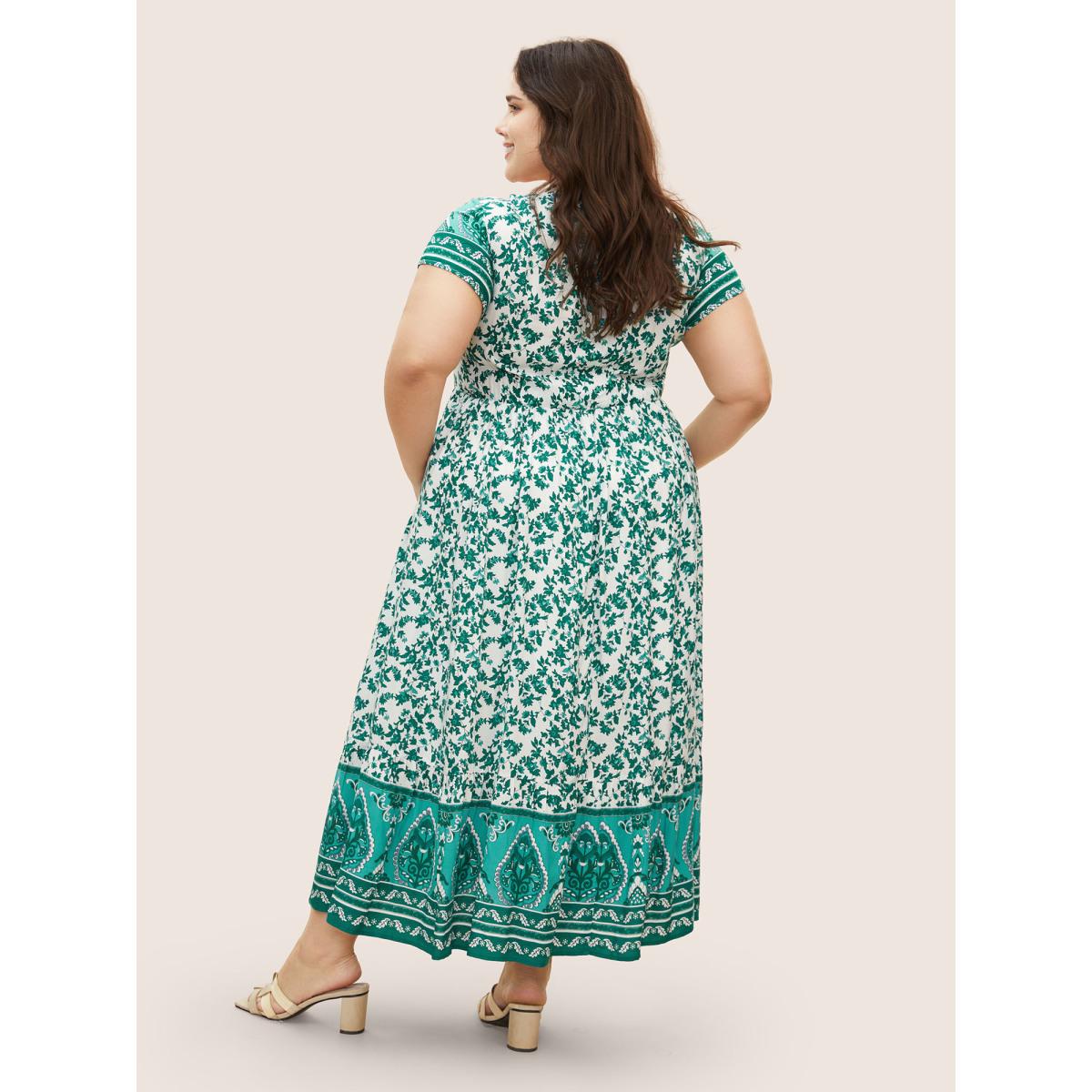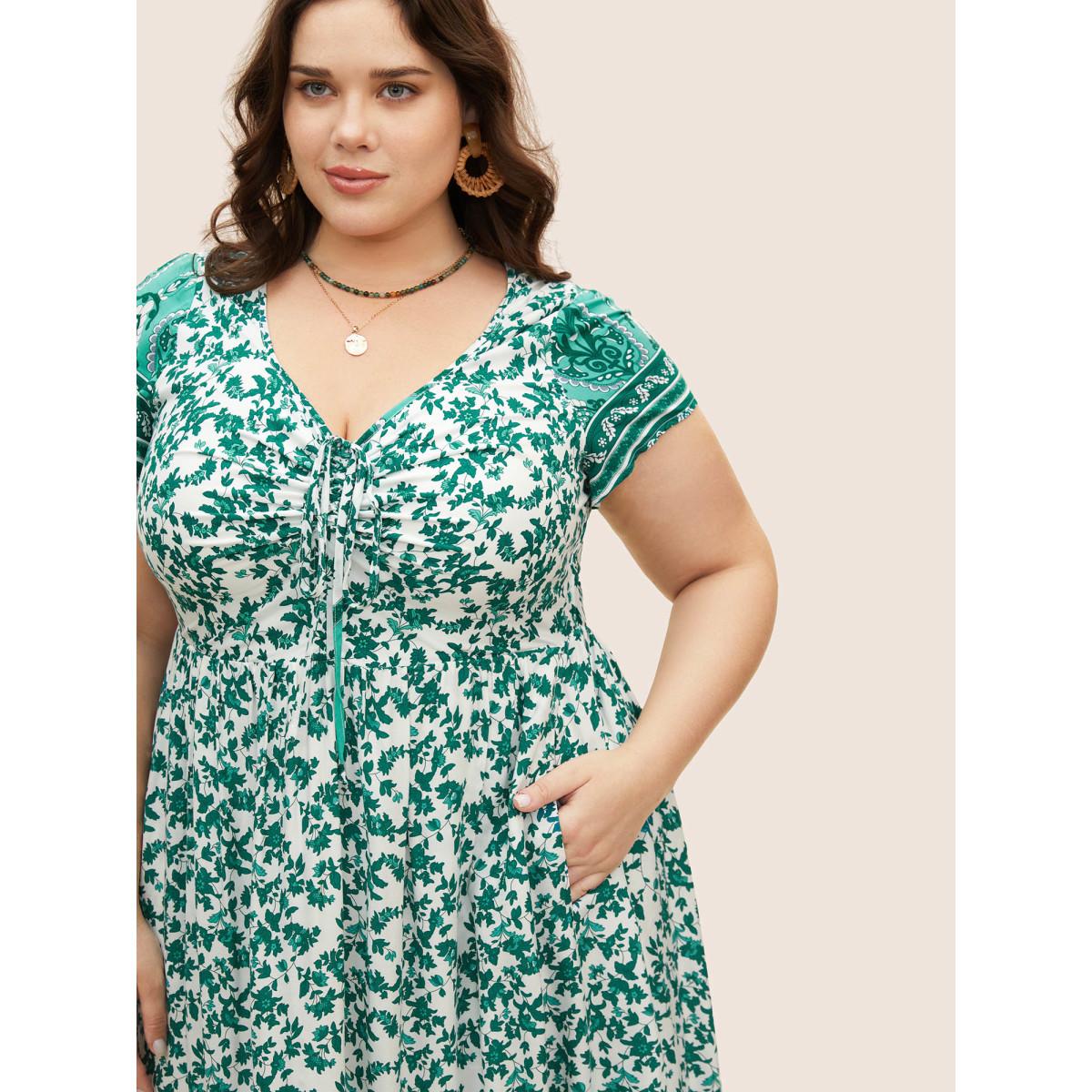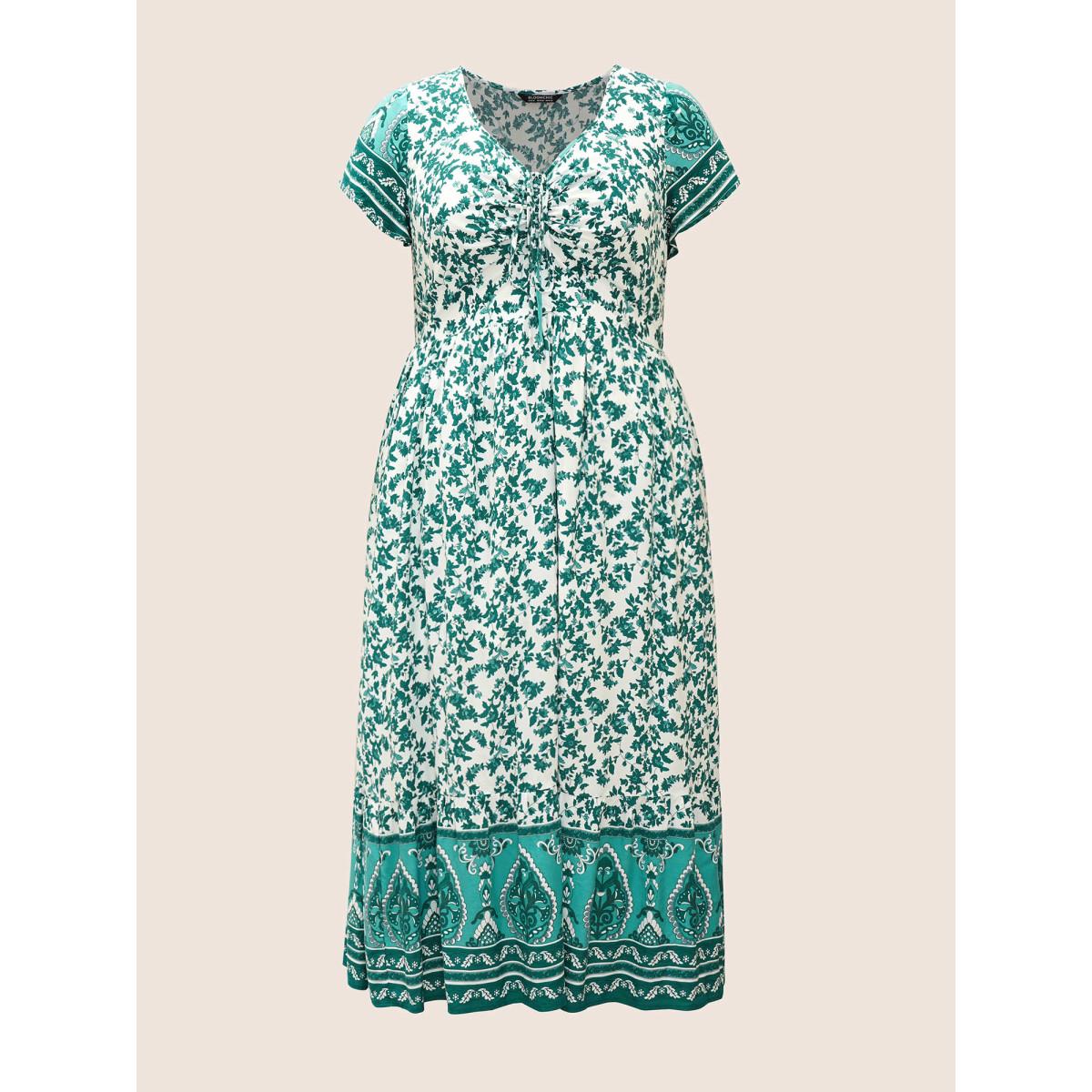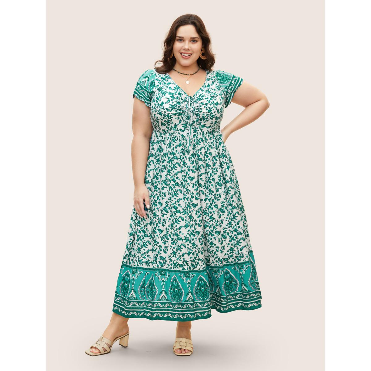 Plus Size Boho Print Drawstring Cap Sleeve Dress Malachitegreen Women Resort Drawstring Heart neckline Cap Sleeve Curvy BloomChic 22-24/3X