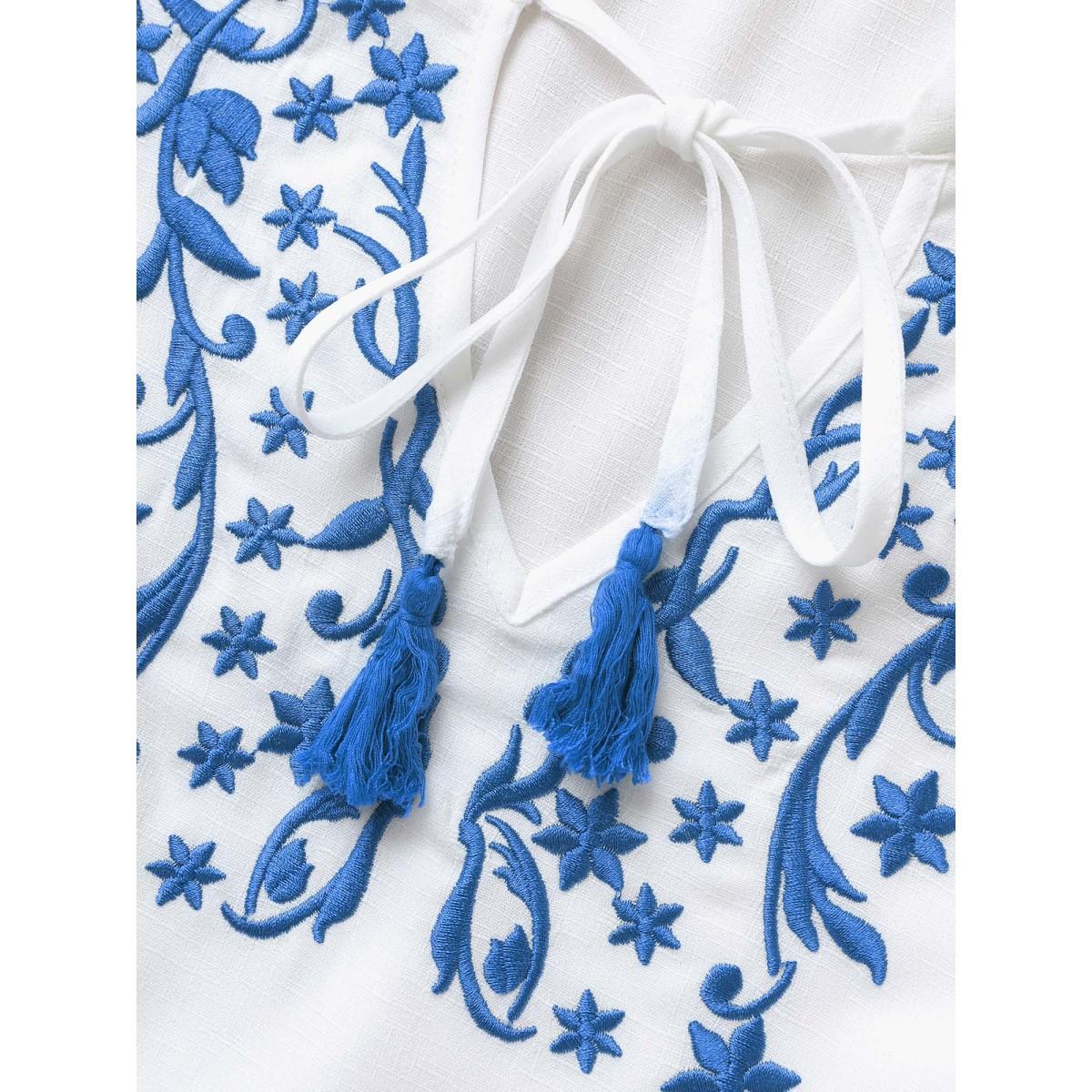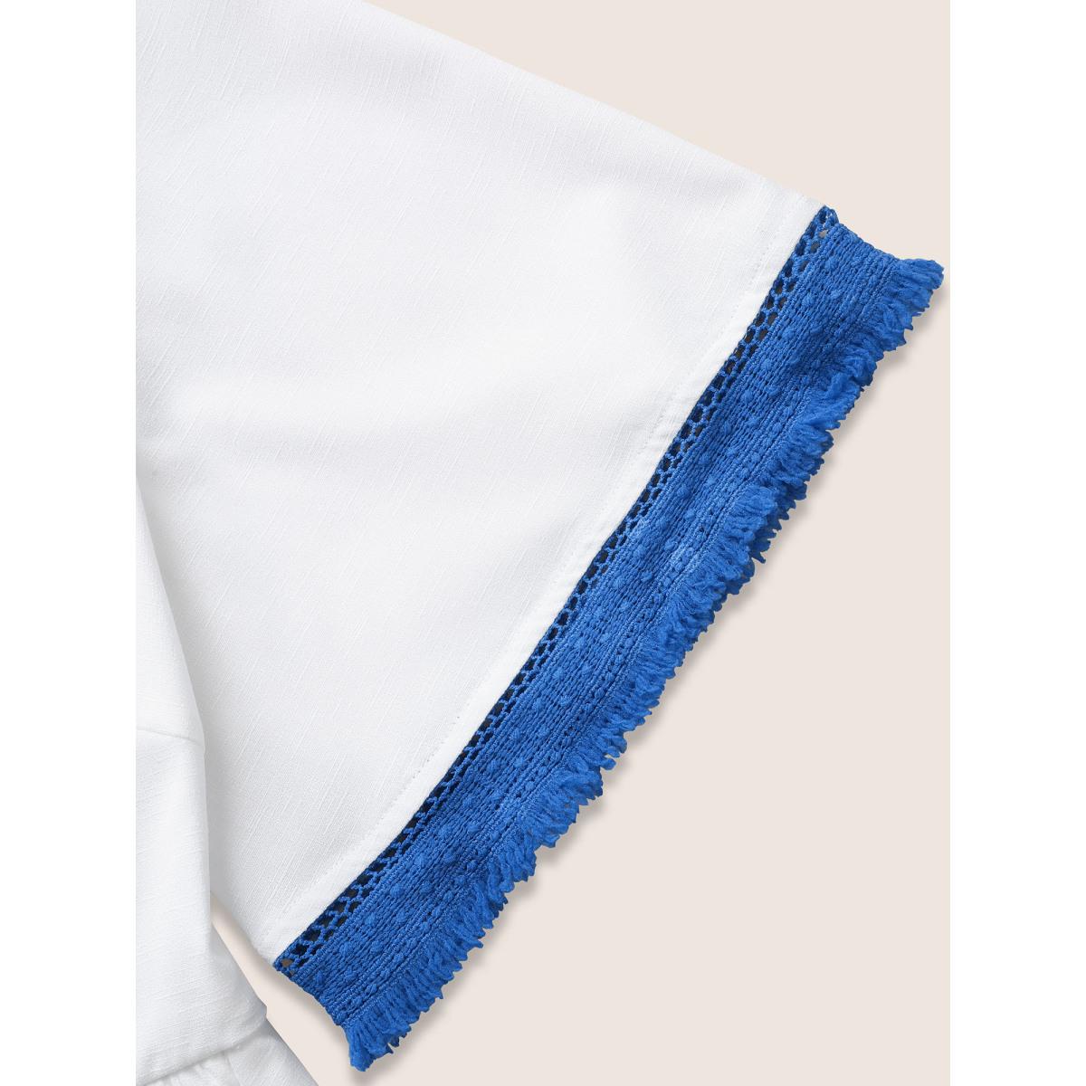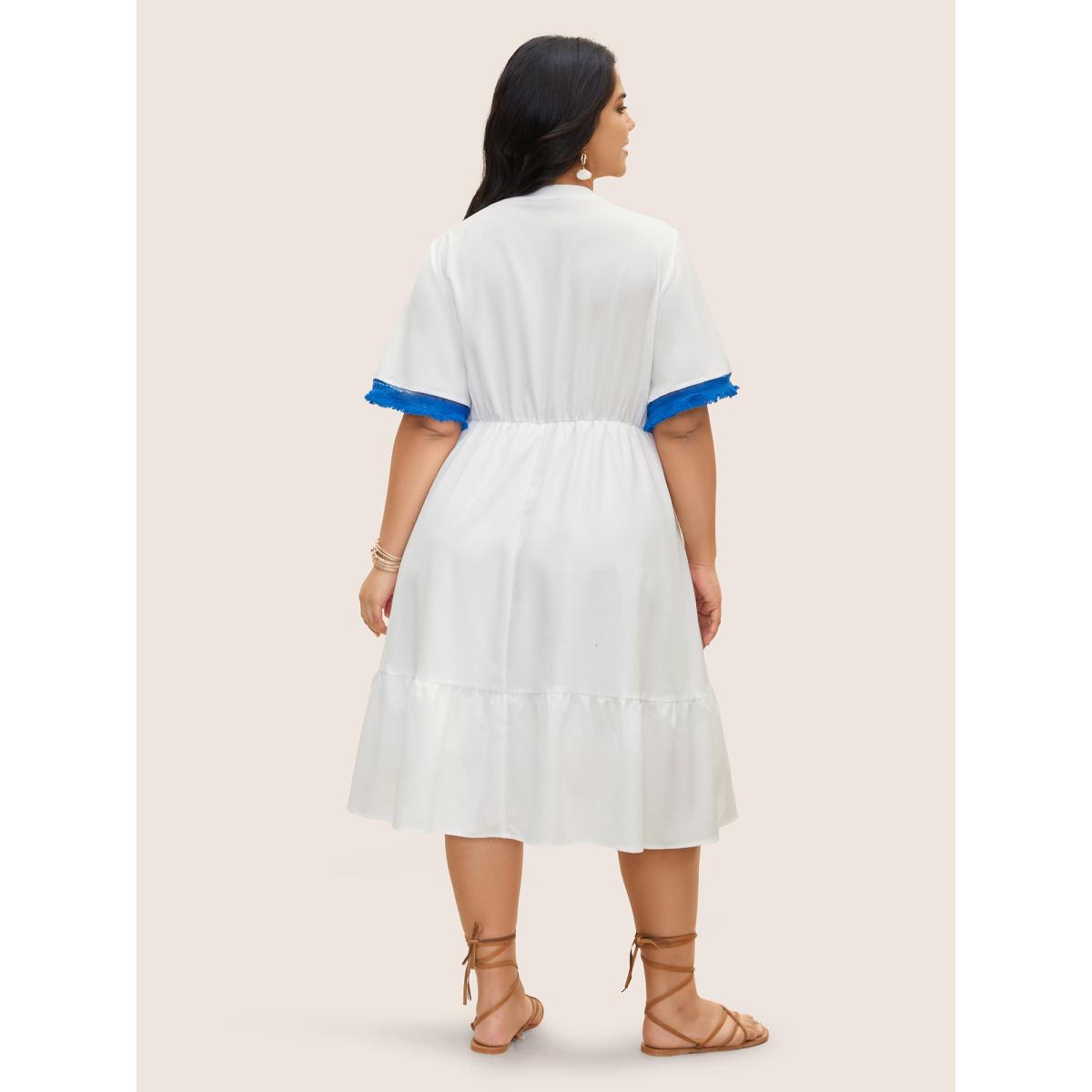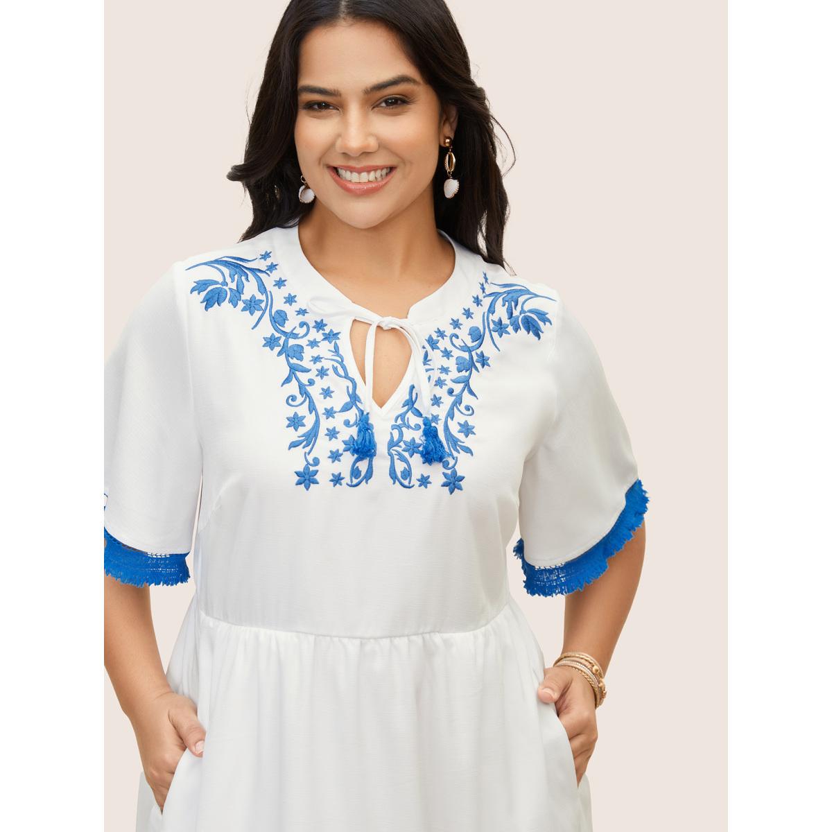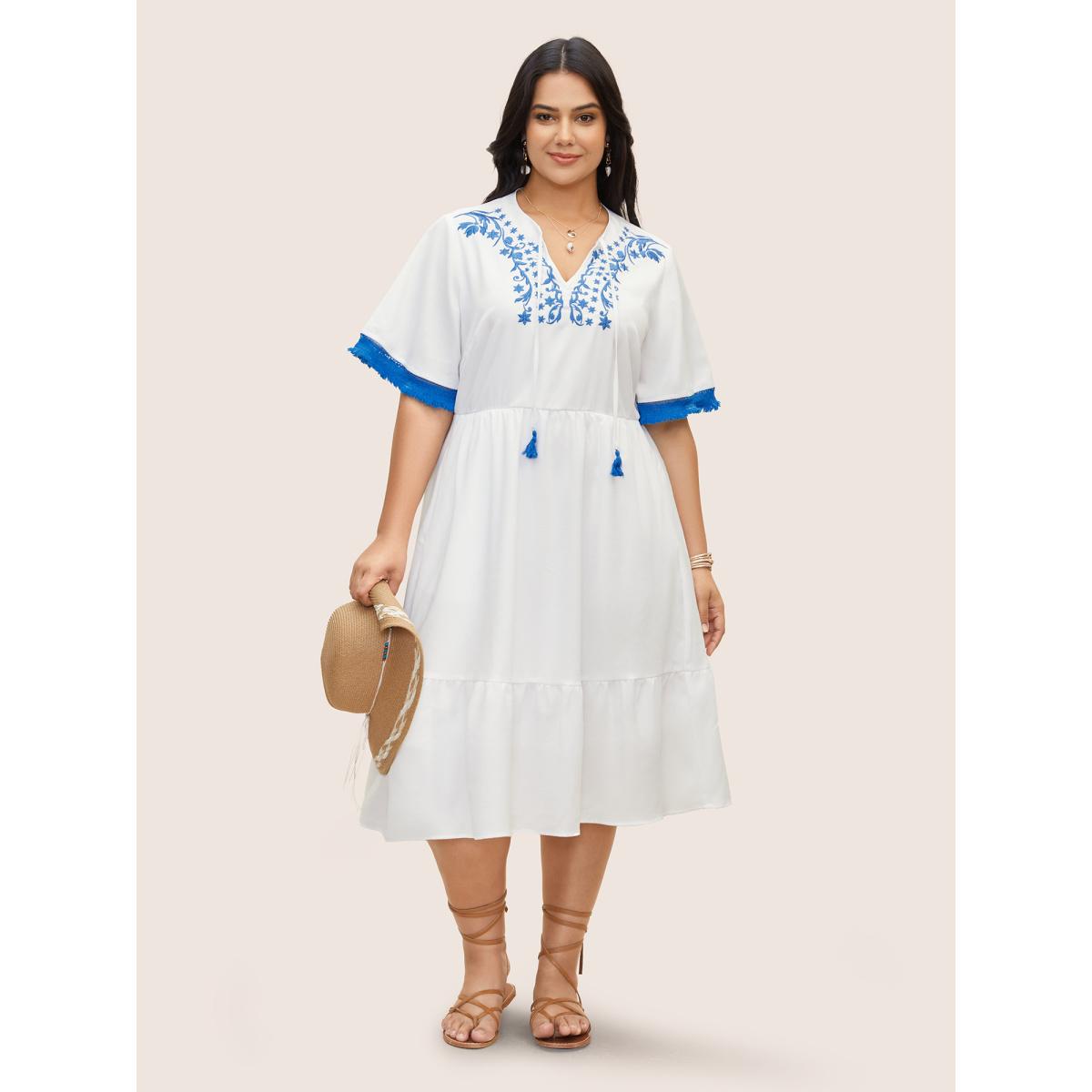 Plus Size Boho Print Embroidered Tassel Trim Midi Dress White Women Elegant Woven ribbon&lace trim Flat collar with V-notch Half Sleeve Curvy BloomChic 26/4X