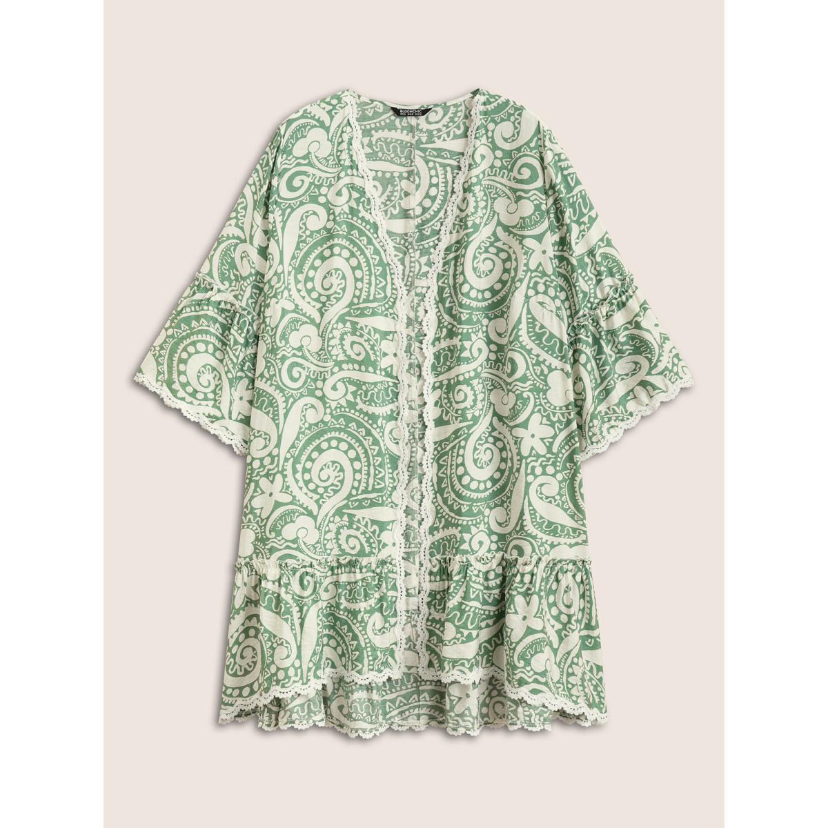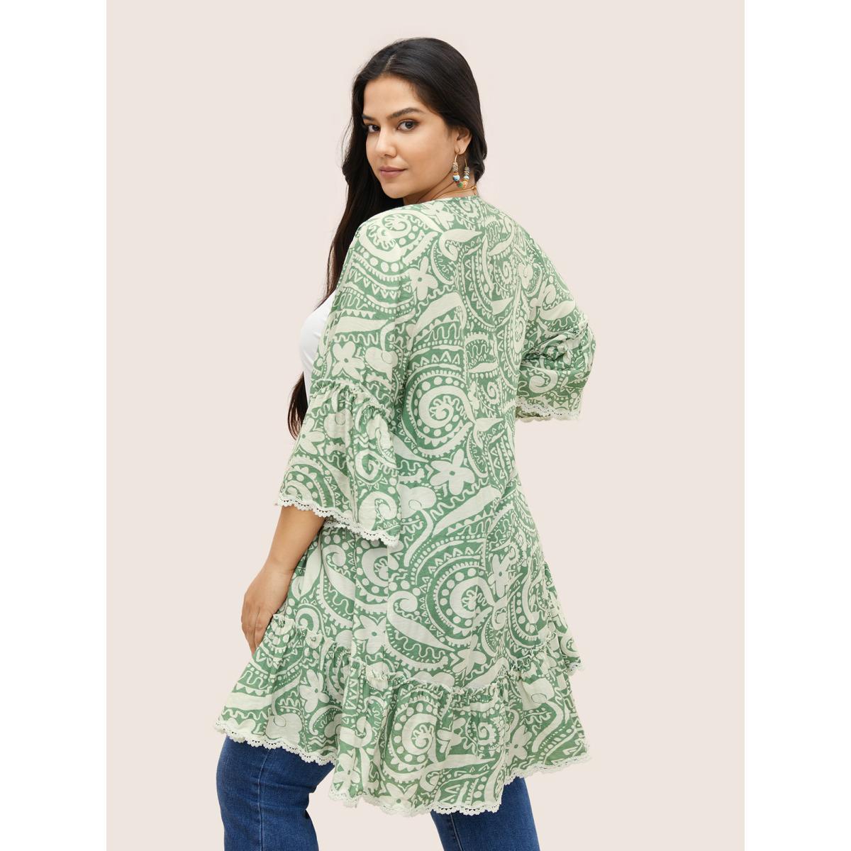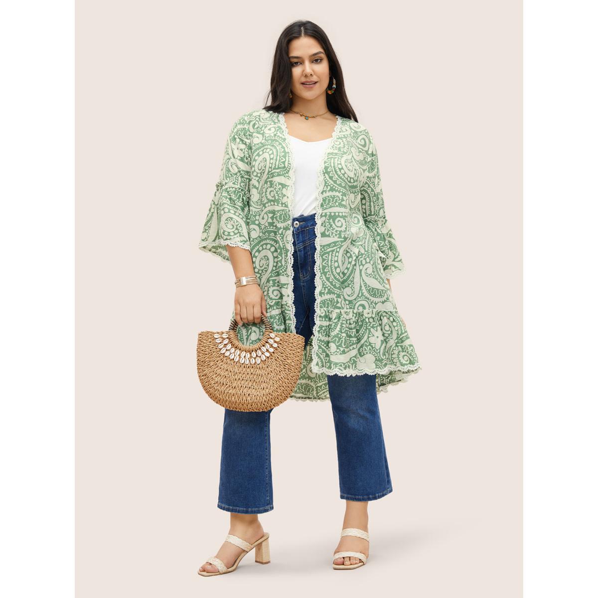 Plus Size Boho Print Lace Trim Frill Trim Kimono Women Green Resort Woven ribbon&lace trim Vacation Kimonos BloomChic 28/5X Product Image