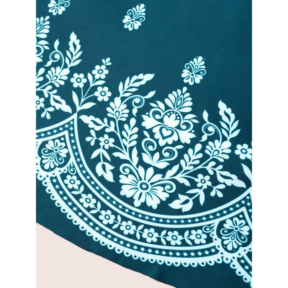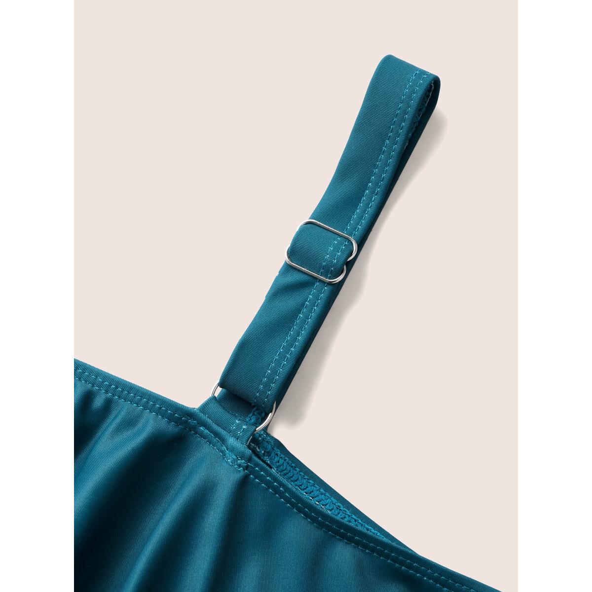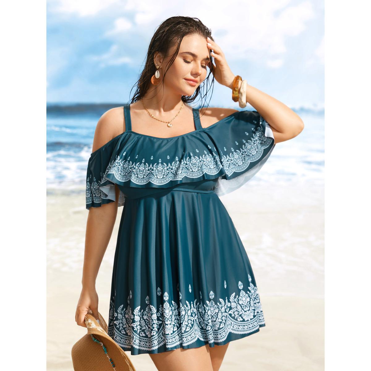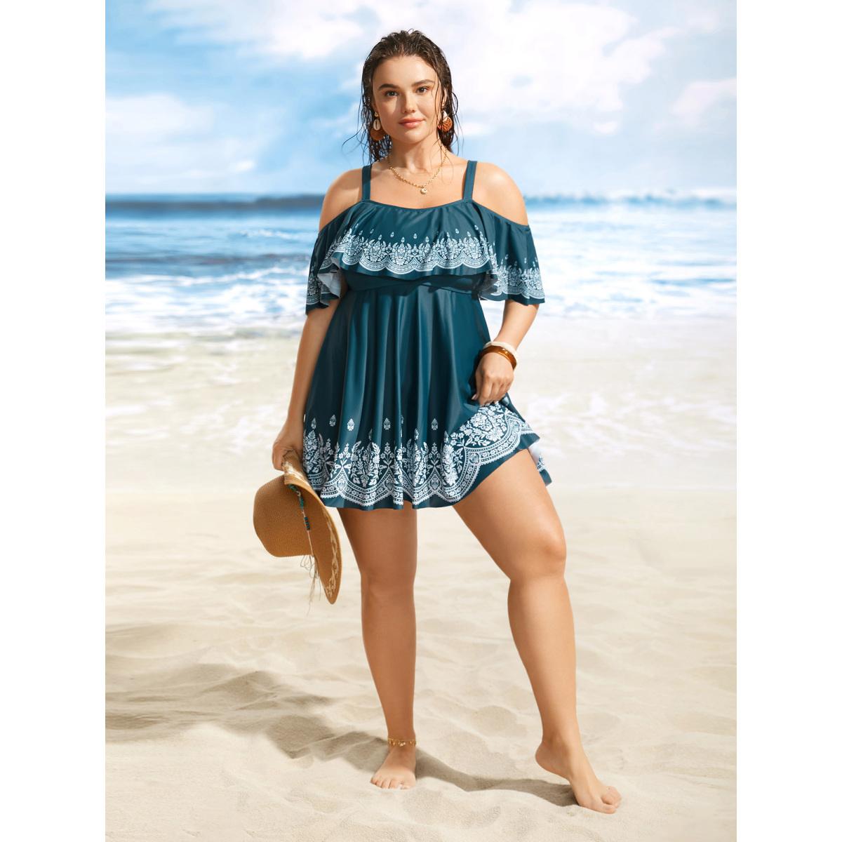 Plus Size Boho Print Off Shoulder Ruffle Trim Swim Dress Women's Swimwear Cyan Beach Bodycon One-shoulder neck High stretch Curve Swim Dresses BloomChic 12/L