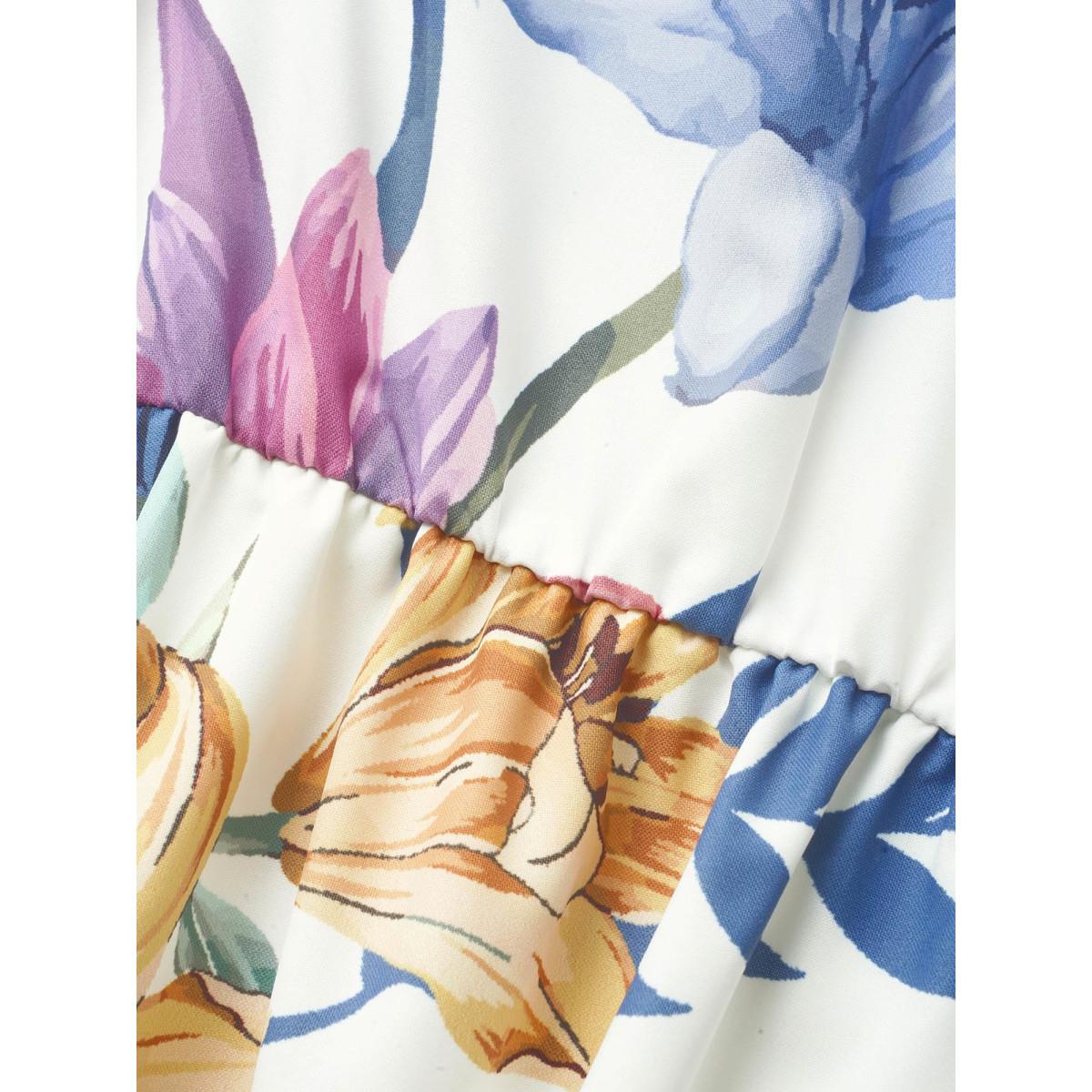Plus Size Floral Print Ruffles Elastic Waist Cami Dress Mediumblue Women Elegant Non Sleeveless Curvy BloomChic 14-16/1X