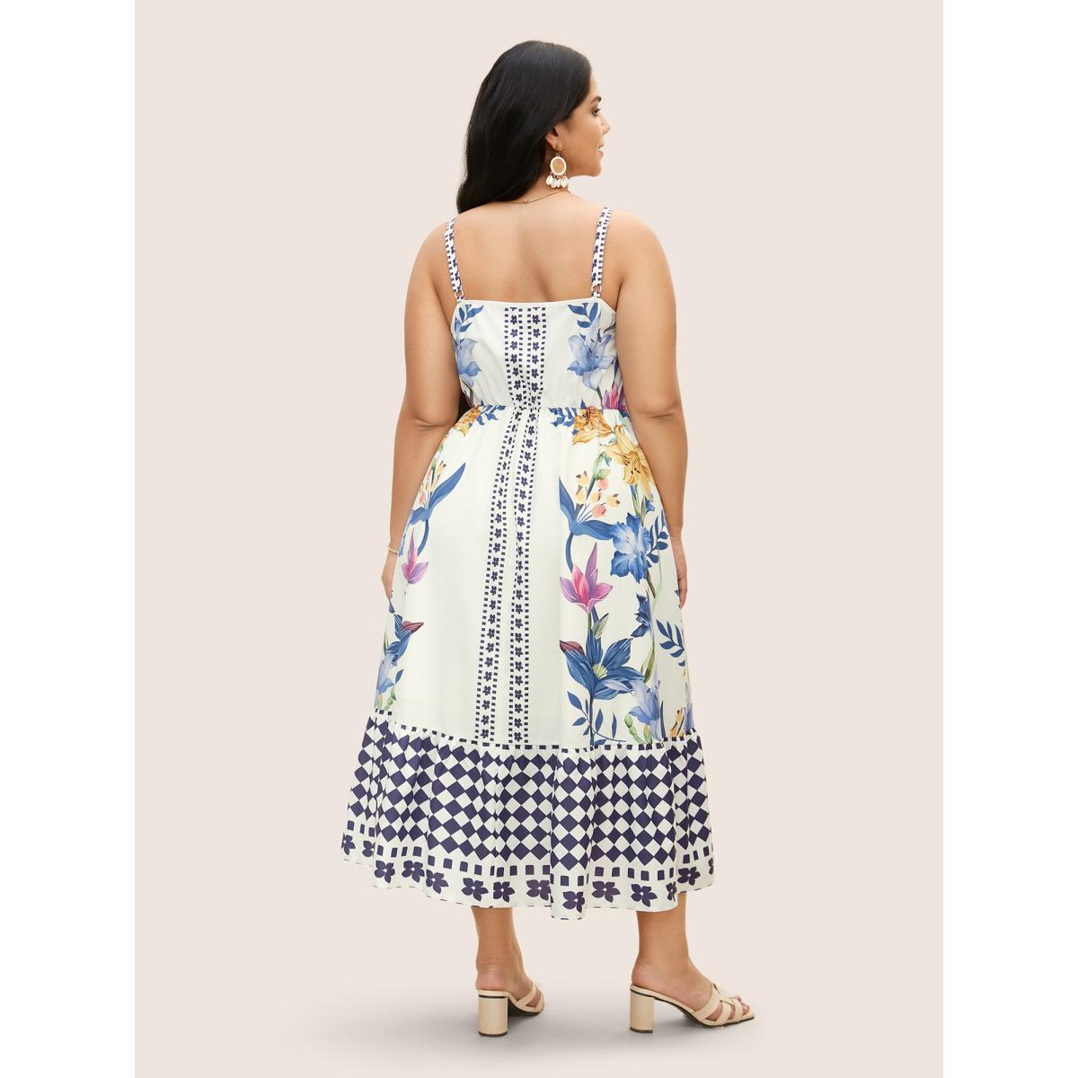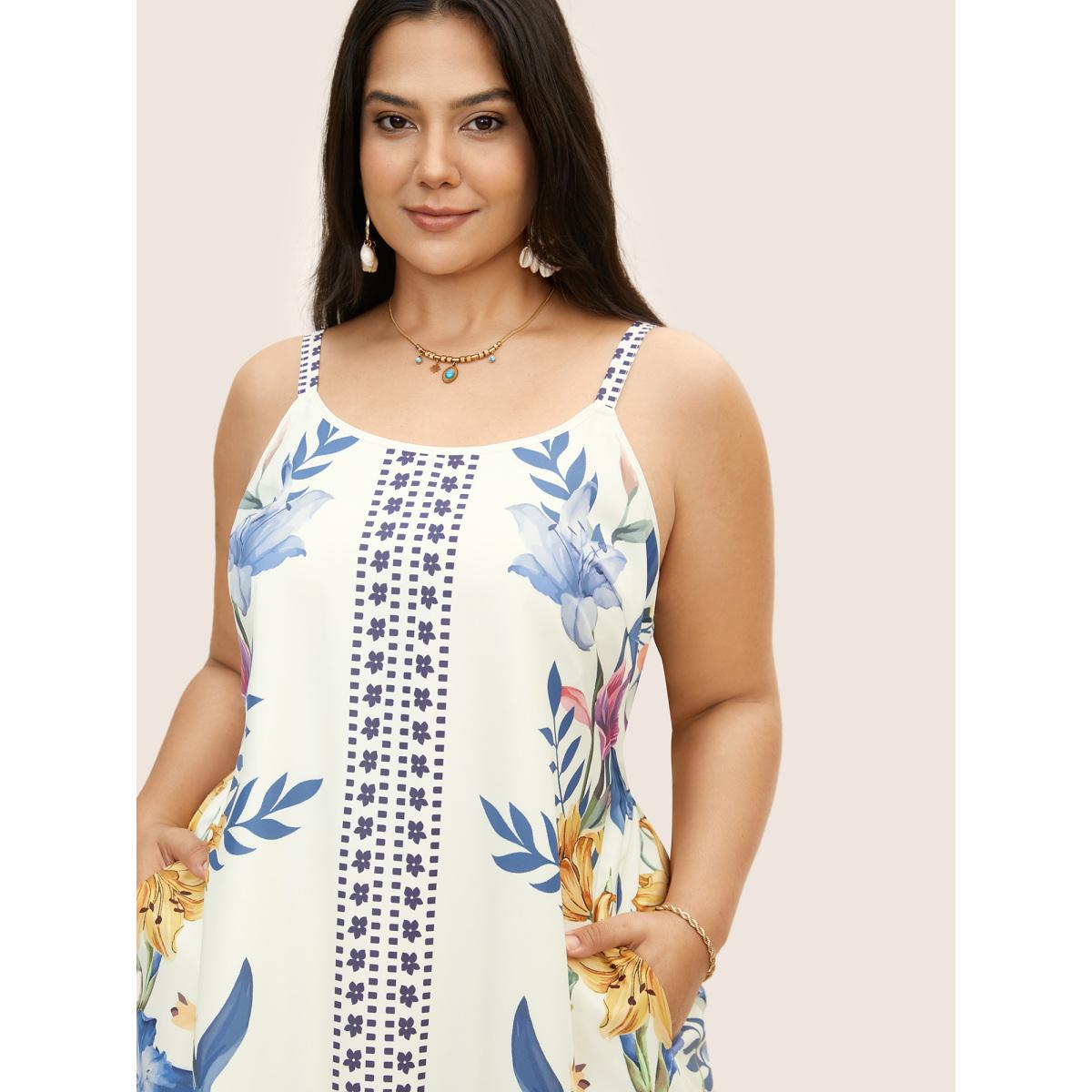 Plus Size Floral Print Patchwork Pocket Spaghetti Strap Dress White Women Elegant Printed Spaghetti Strap Sleeveless Curvy Midi Dress BloomChic 26/4X
