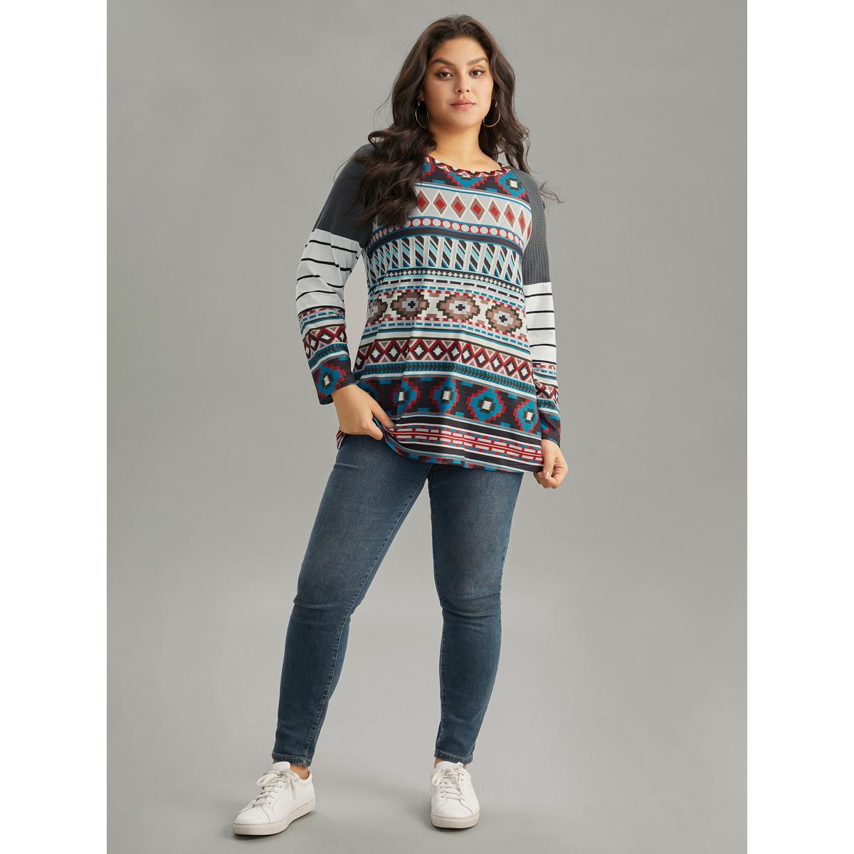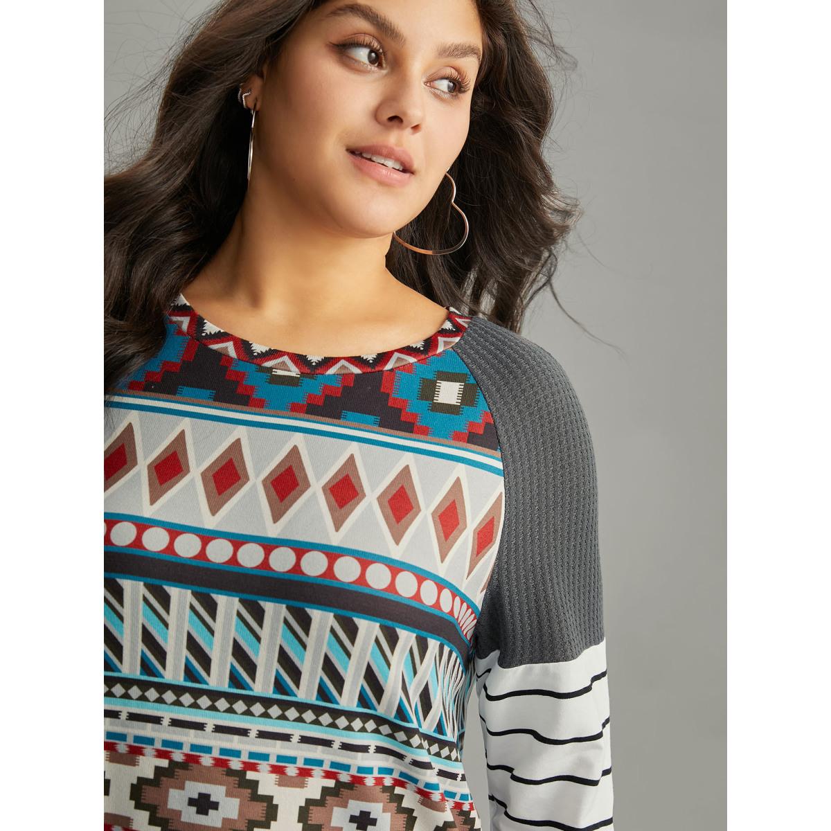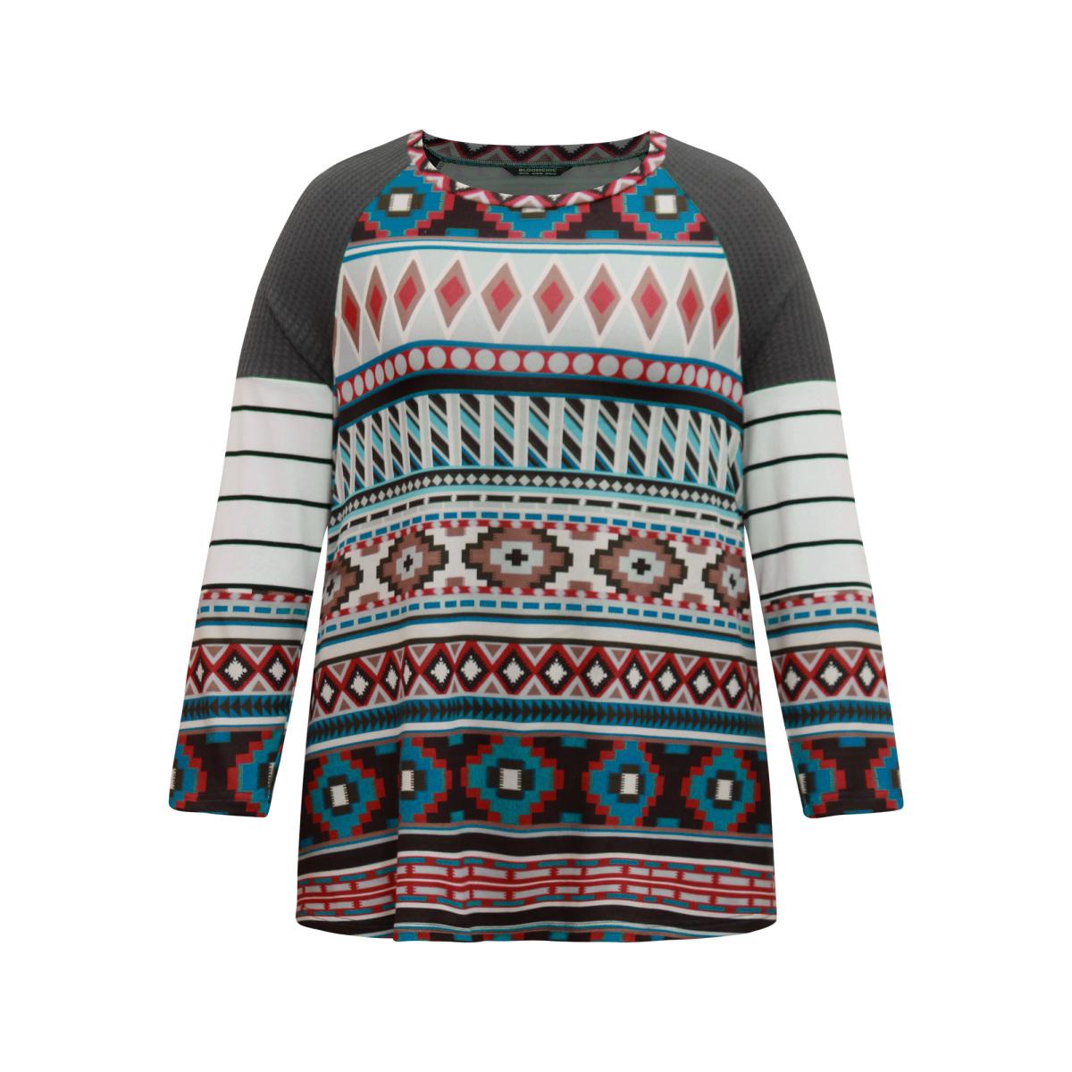 Plus Size Boho Print Patchwork Waffle Knit Raglan Sleeve T-shirt Multicolor Women Casual Waffle Knit Bohemian Print Round Neck Dailywear T-shirts BloomChic 22-24/3X