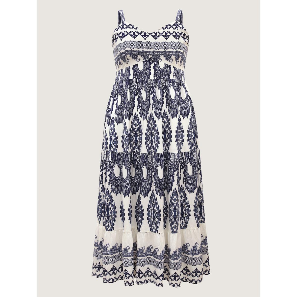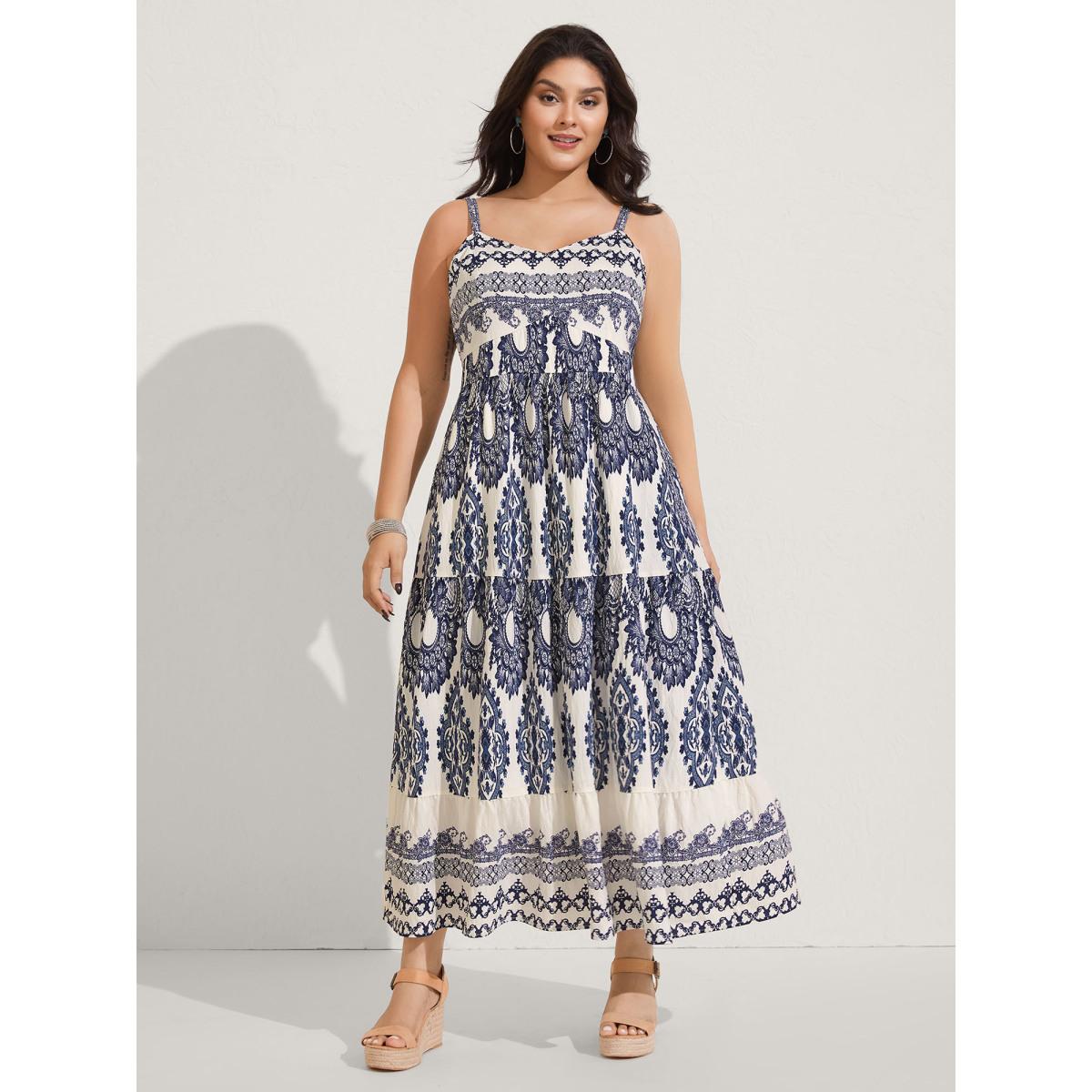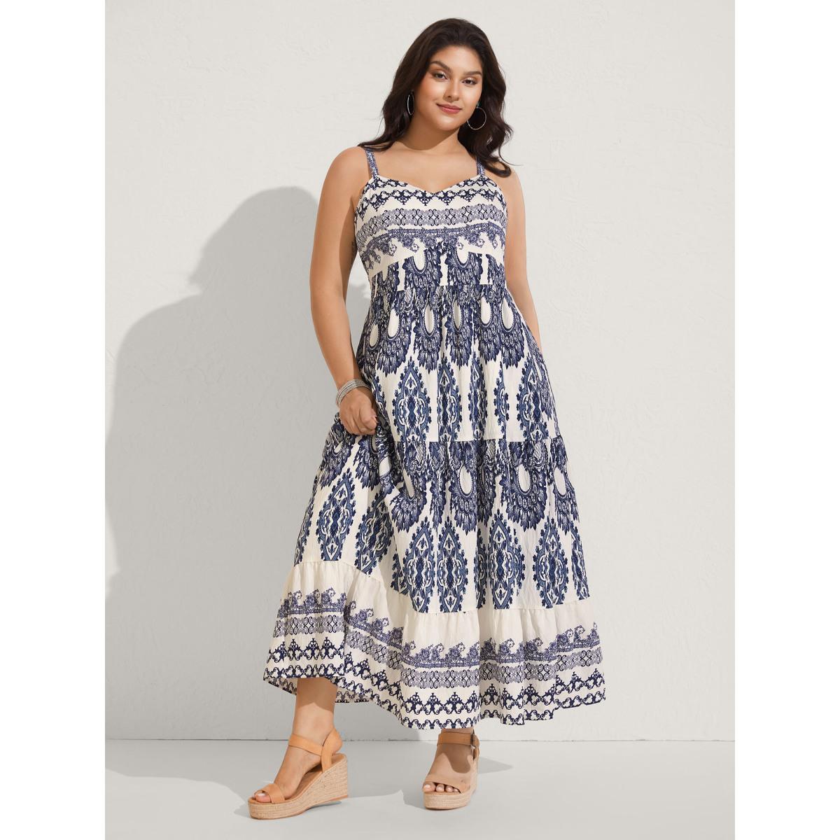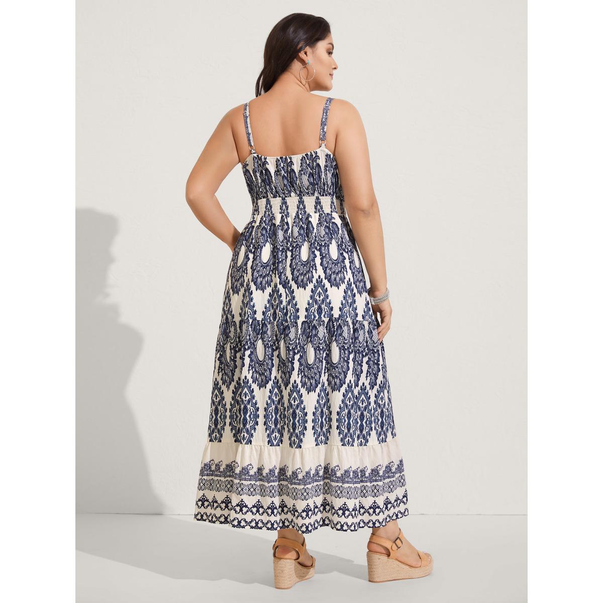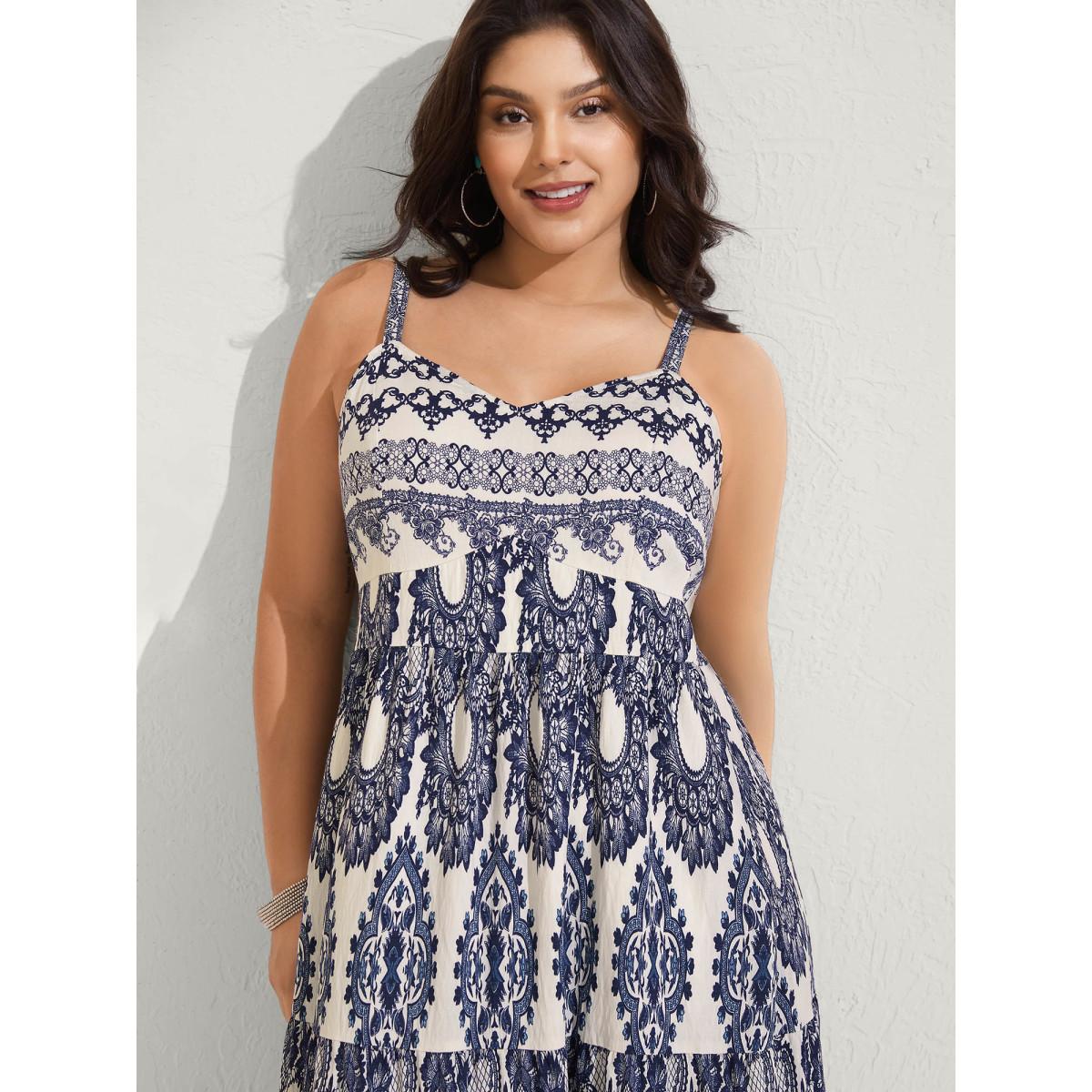 Plus Size Boho Print Shirred Cami Midi Dress DarkBlue Women Boho Printed V-neck Sleeveless Curvy BloomChic 22-24/3X