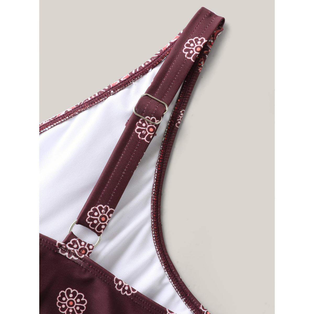 Plus Size Boho Print Surplice Neck Swim Top Women's Swimwear Plum Resort Patchwork High stretch Bodycon Overlap Collar Curve Swim Tops BloomChic 10/M