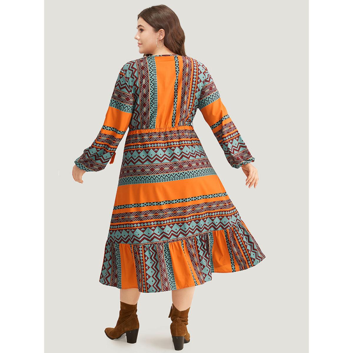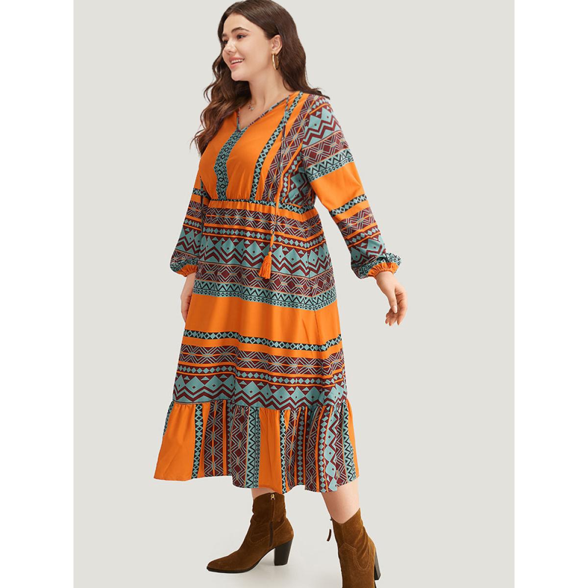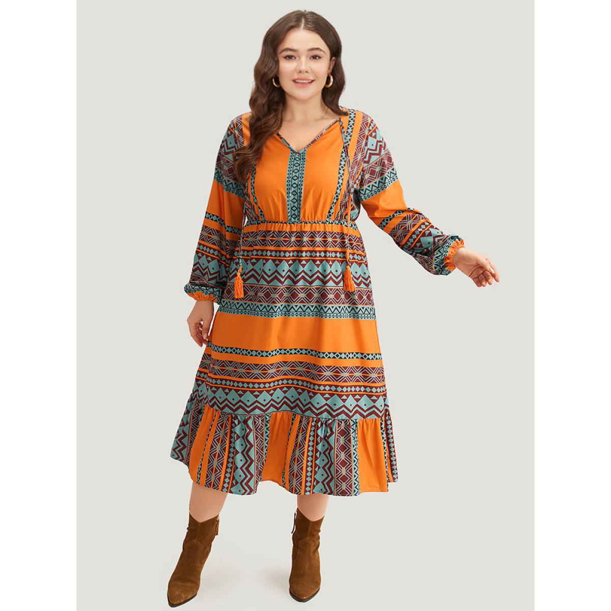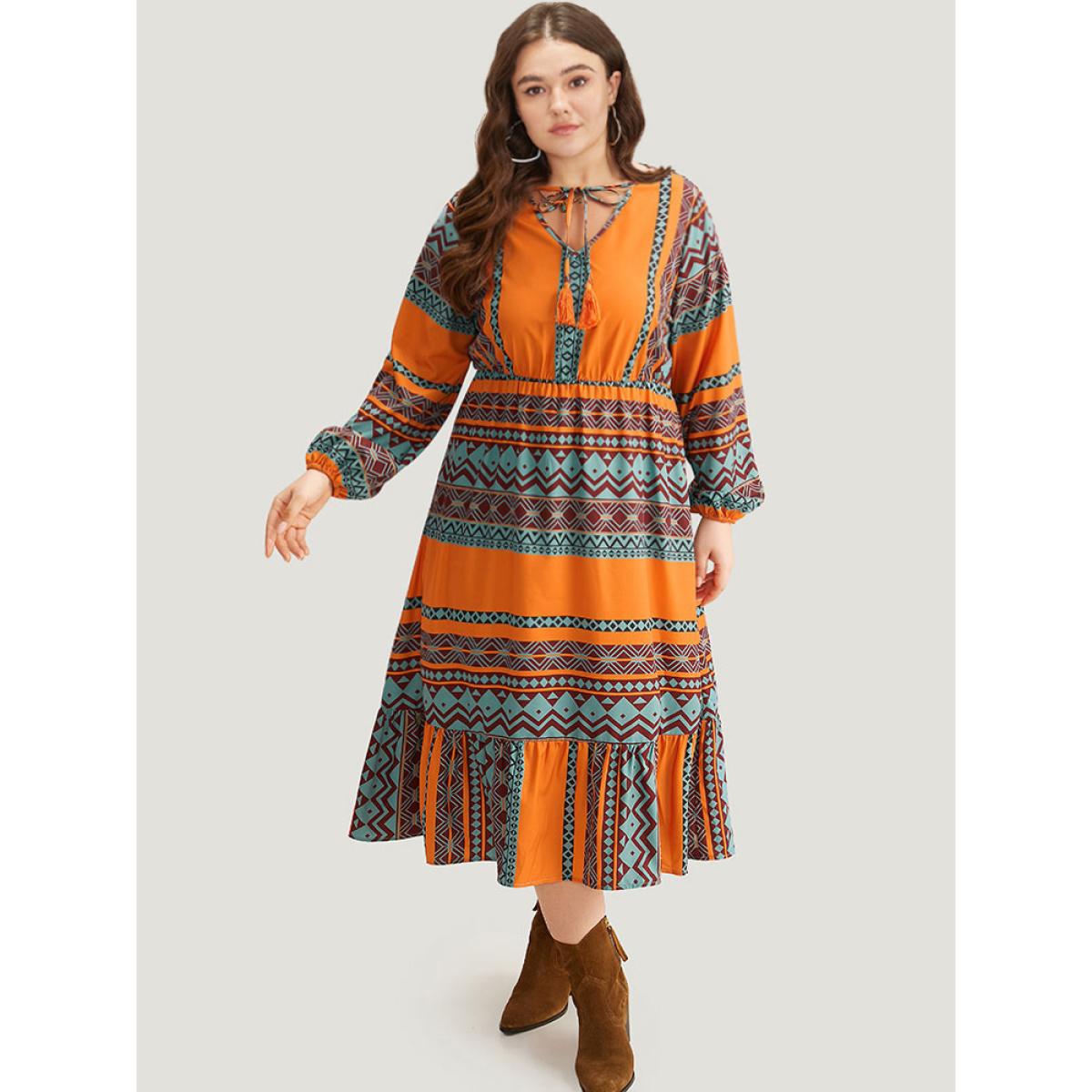 Plus Size Boho Print Tassel Tie Neck Dress OrangeRed Women Vacation Elastic cuffs Tie Neck Long Sleeve Curvy Midi Dress BloomChic 30/6X