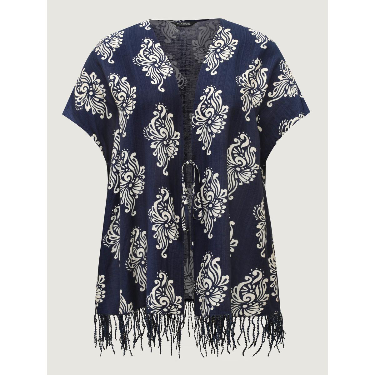 Plus Size Boho Print Tassels Hem Kimono Women Indigo Tie knot Loose Vacation Kimonos BloomChic 30/6X