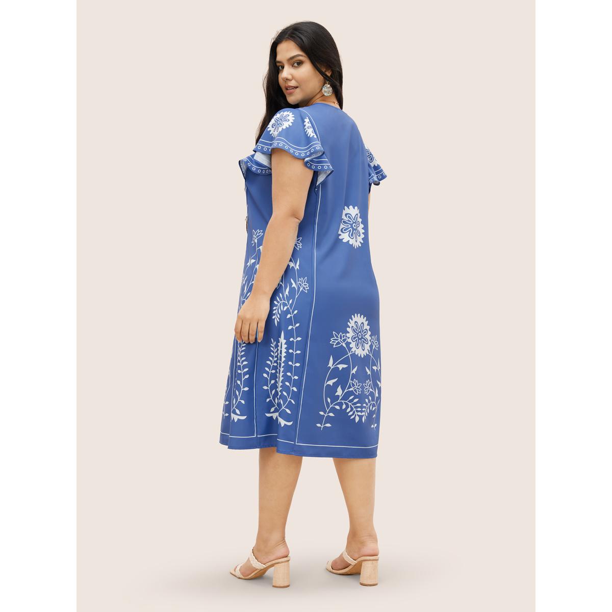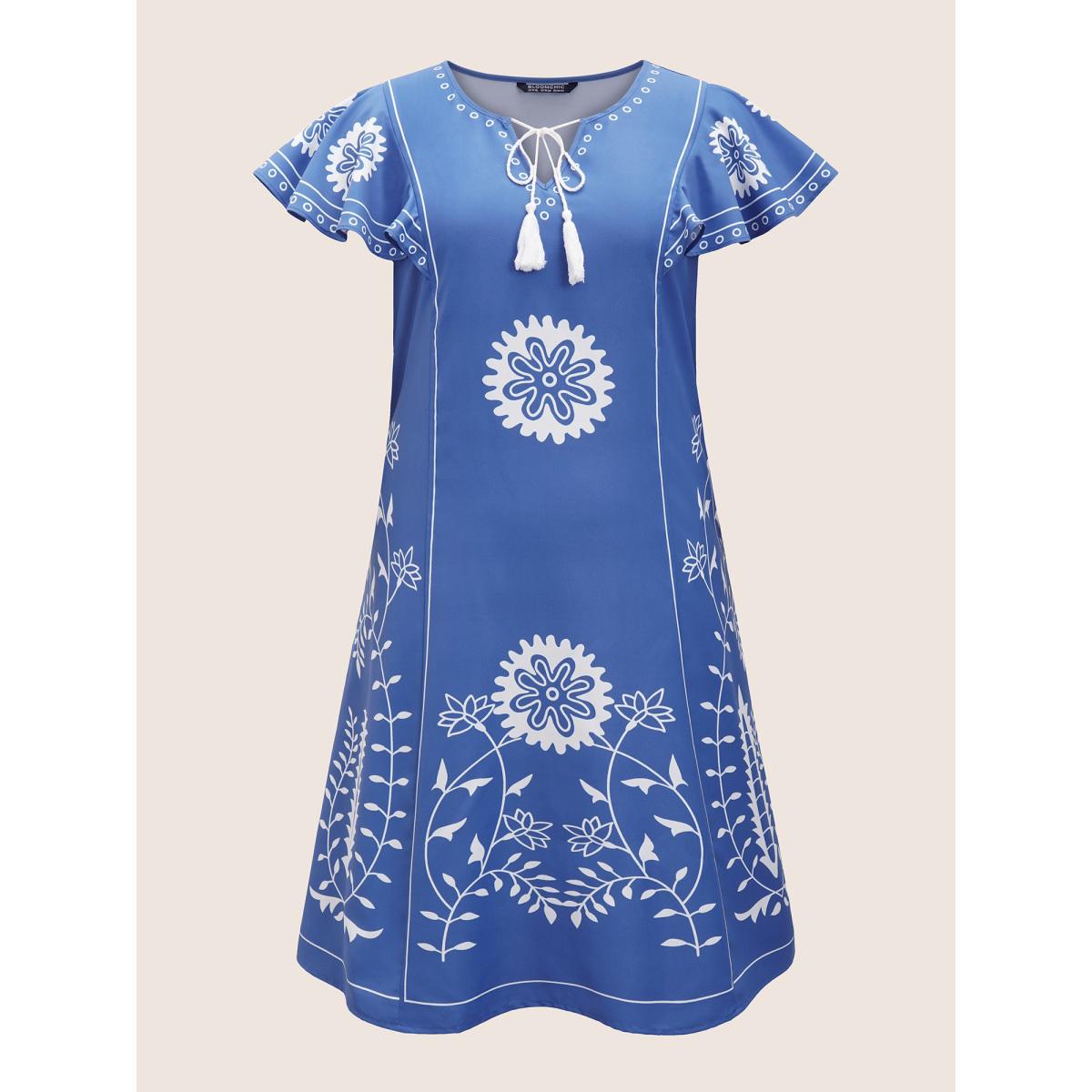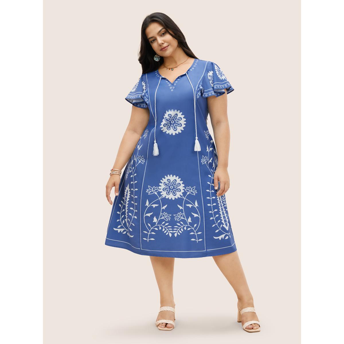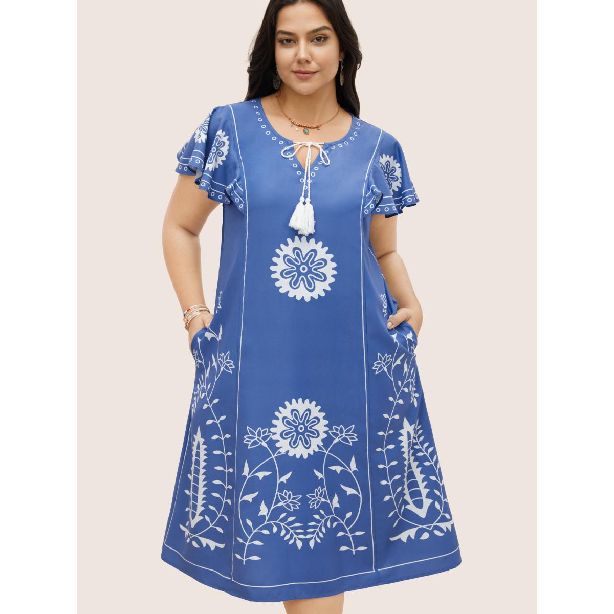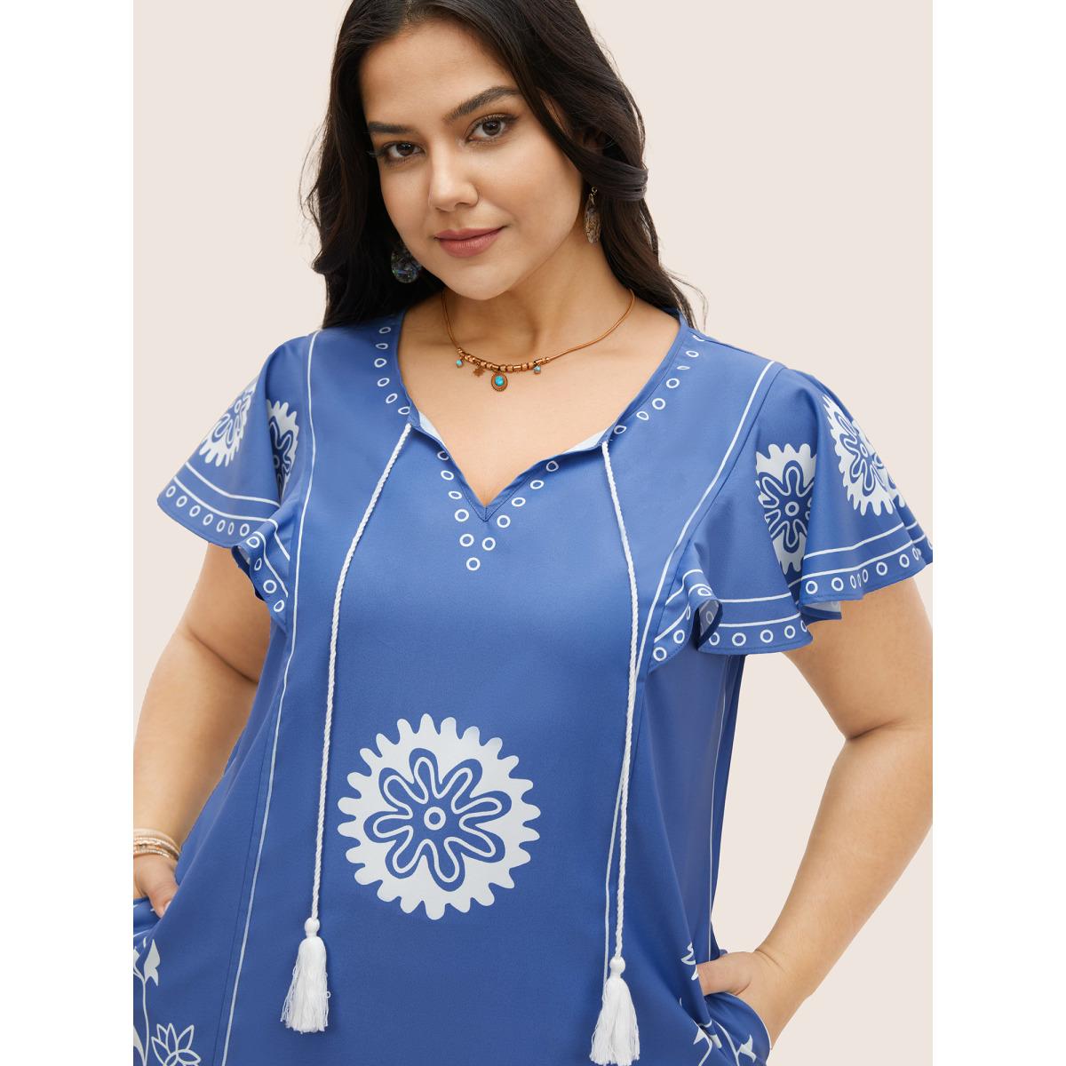 Plus Size Boho Print Tassels Ruffle Sleeve Dress LightBlue Women Resort Tassels Notched collar Cap Sleeve Curvy Midi Dress BloomChic 10/M