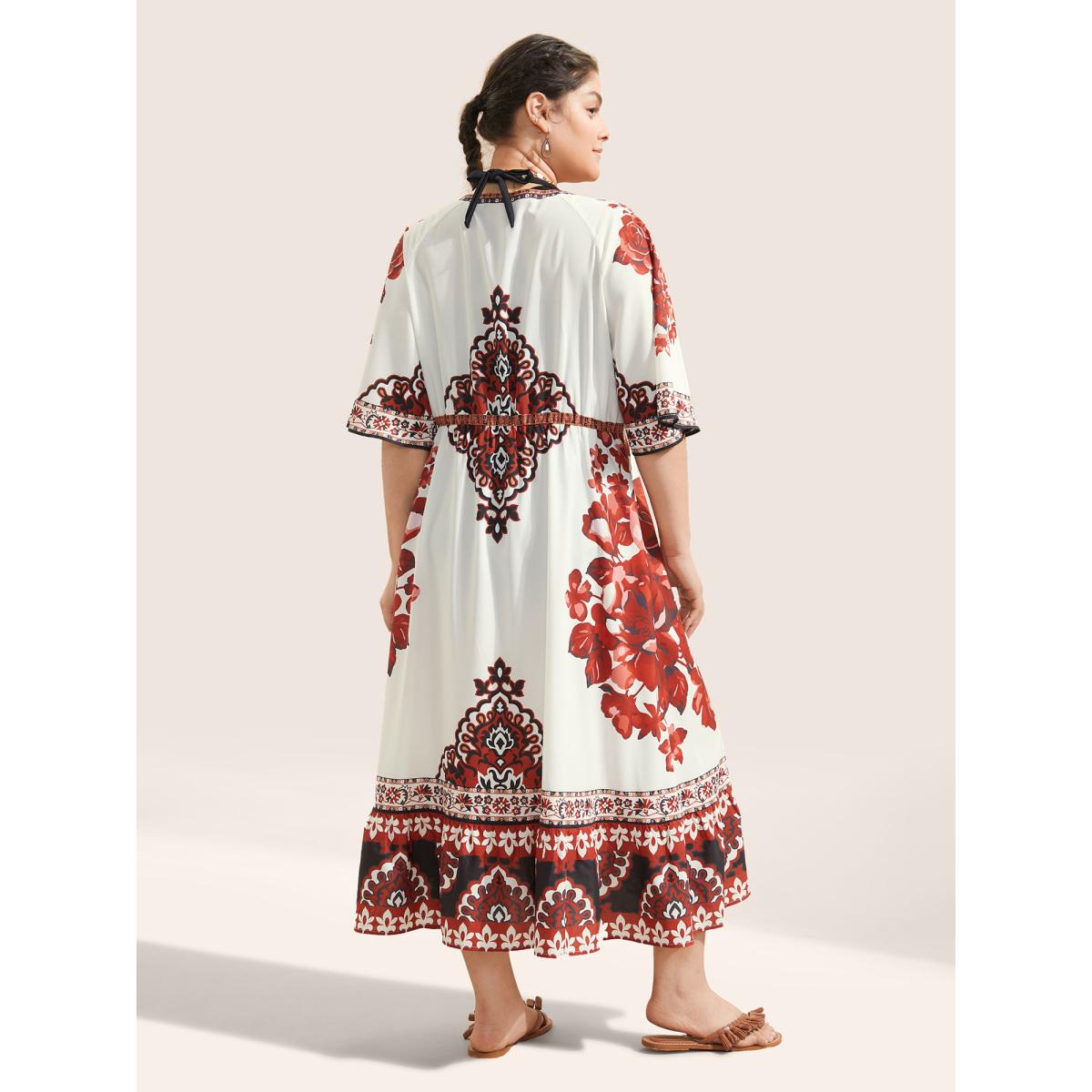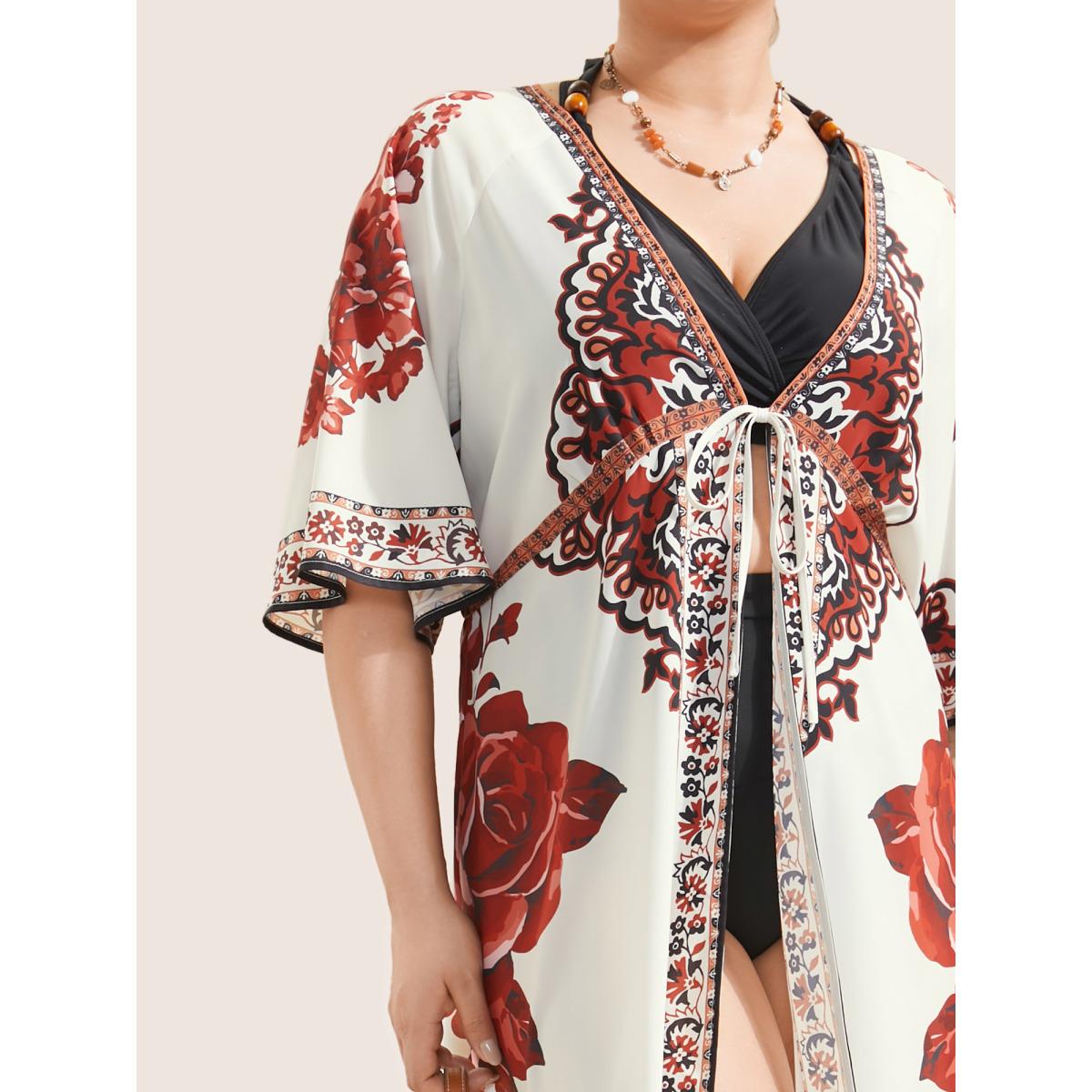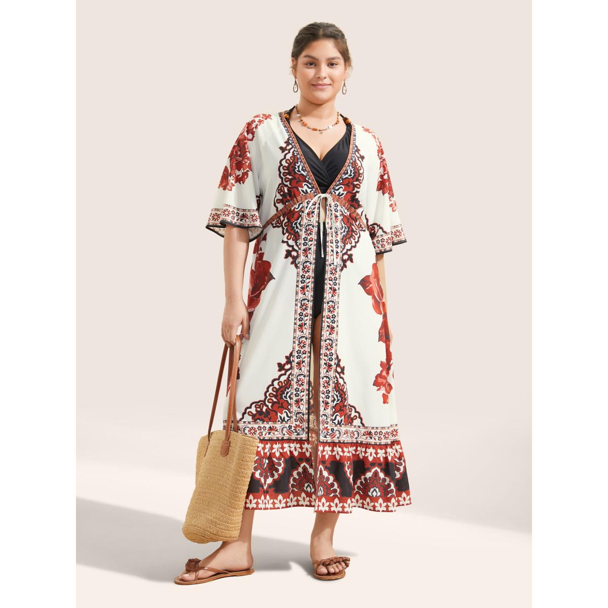 Plus Size Boho Print Ties Raglan Sleeve Flutter Hem Kimono Women White Resort Cross straps Vacation Kimonos BloomChic 18-20/2X