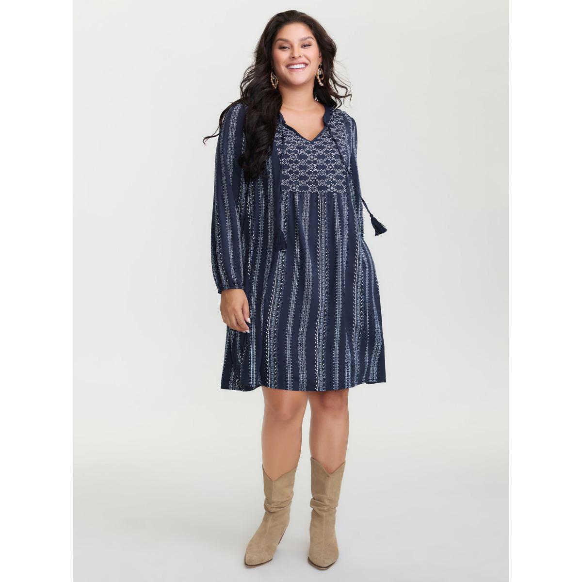 Plus Size Boho Stripe Notched Collar Ties Midi Dress DarkBlue Women Boho Flat collar with V-notch Long Sleeve Curvy BloomChic 28/5X