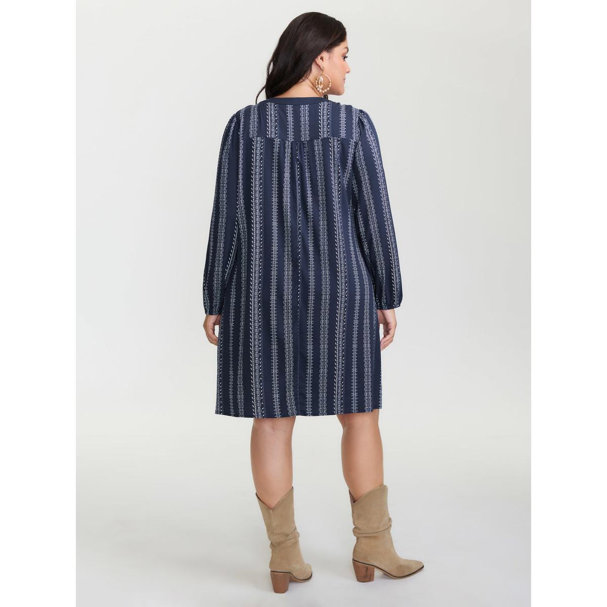 Plus Size Boho Stripe Notched Collar Ties Midi Dress DarkBlue Women Boho Flat collar with V-notch Long Sleeve Curvy BloomChic 28/5X Product Image