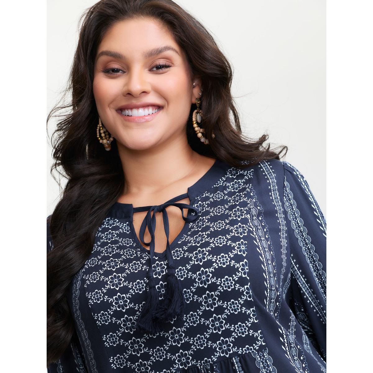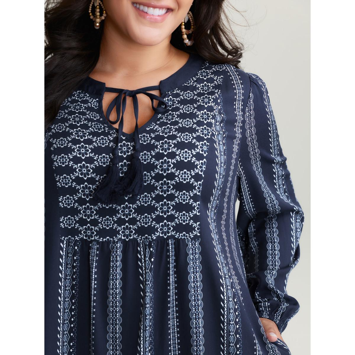 Plus Size Boho Print Tassel-Tie Pockets Midi Dress DarkBlue Women Resort Woven ribbon&lace trim V-neck Short sleeve Curvy BloomChic 18-20/2X