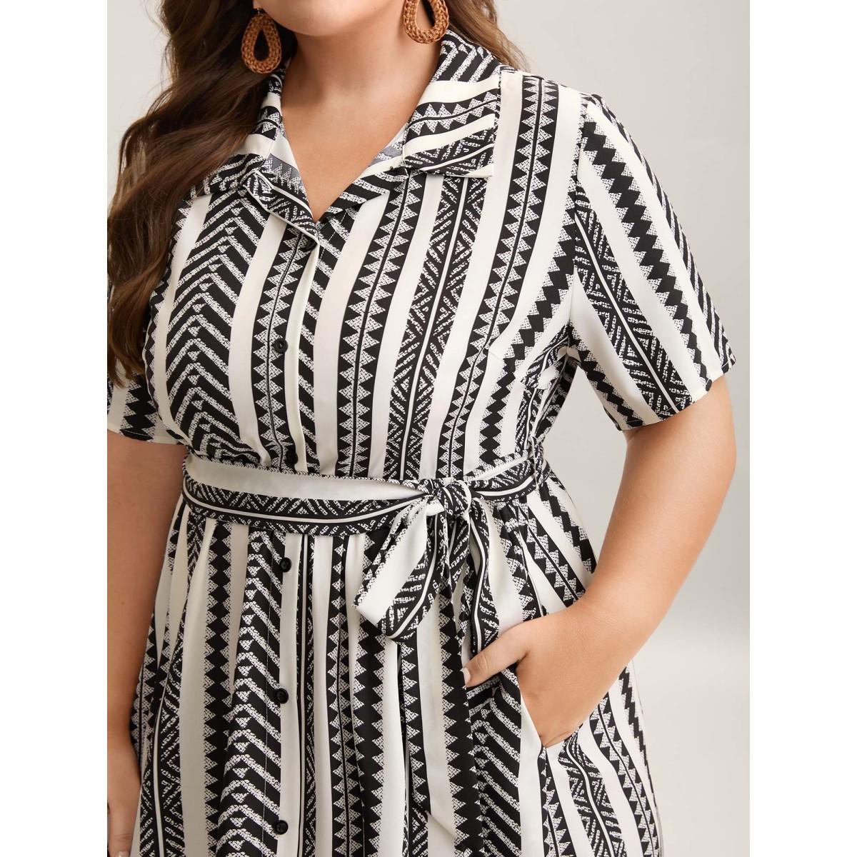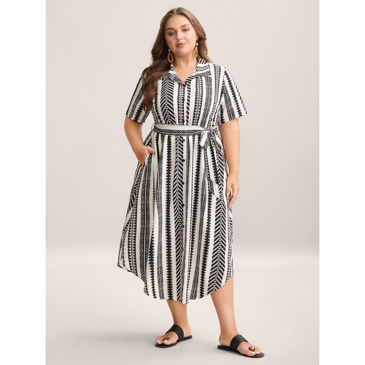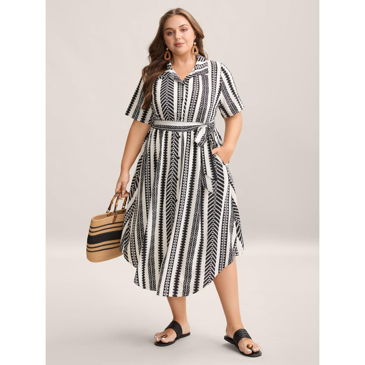 Plus Size Boho Striped Stretchy Waist Shirt Dress WhiteSmoke Women Resort Belted Shirt collar Short sleeve Curvy BloomChic 12/L