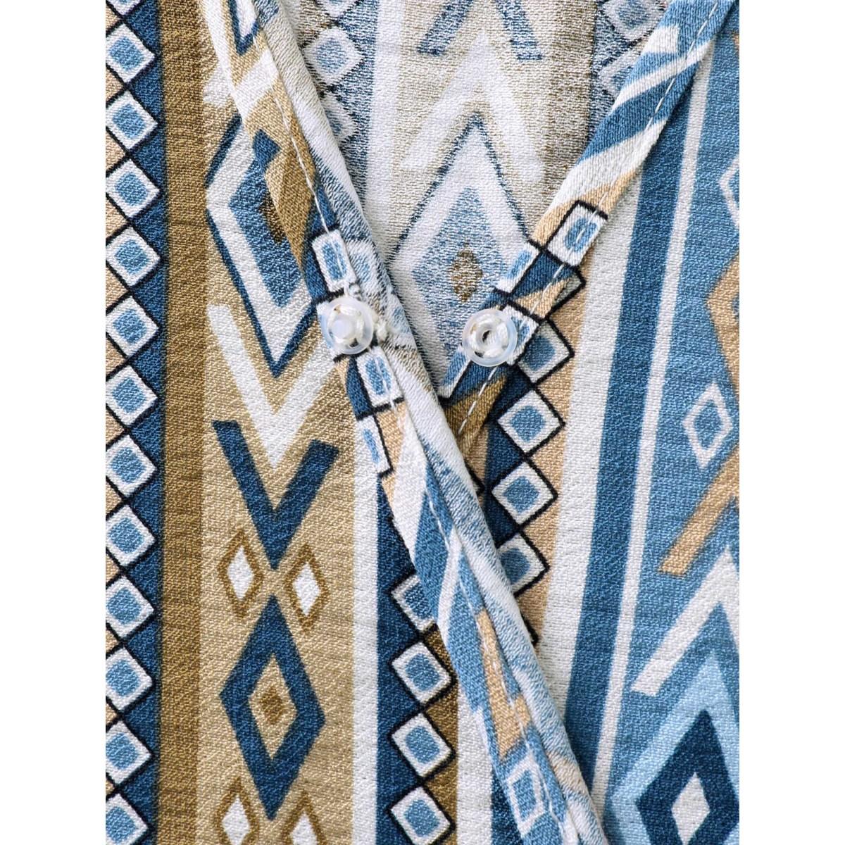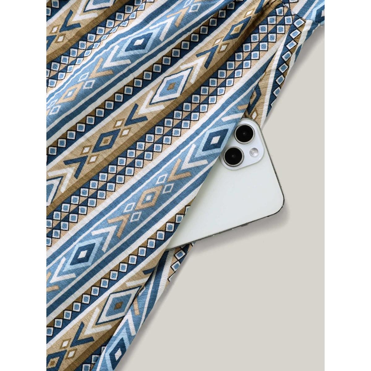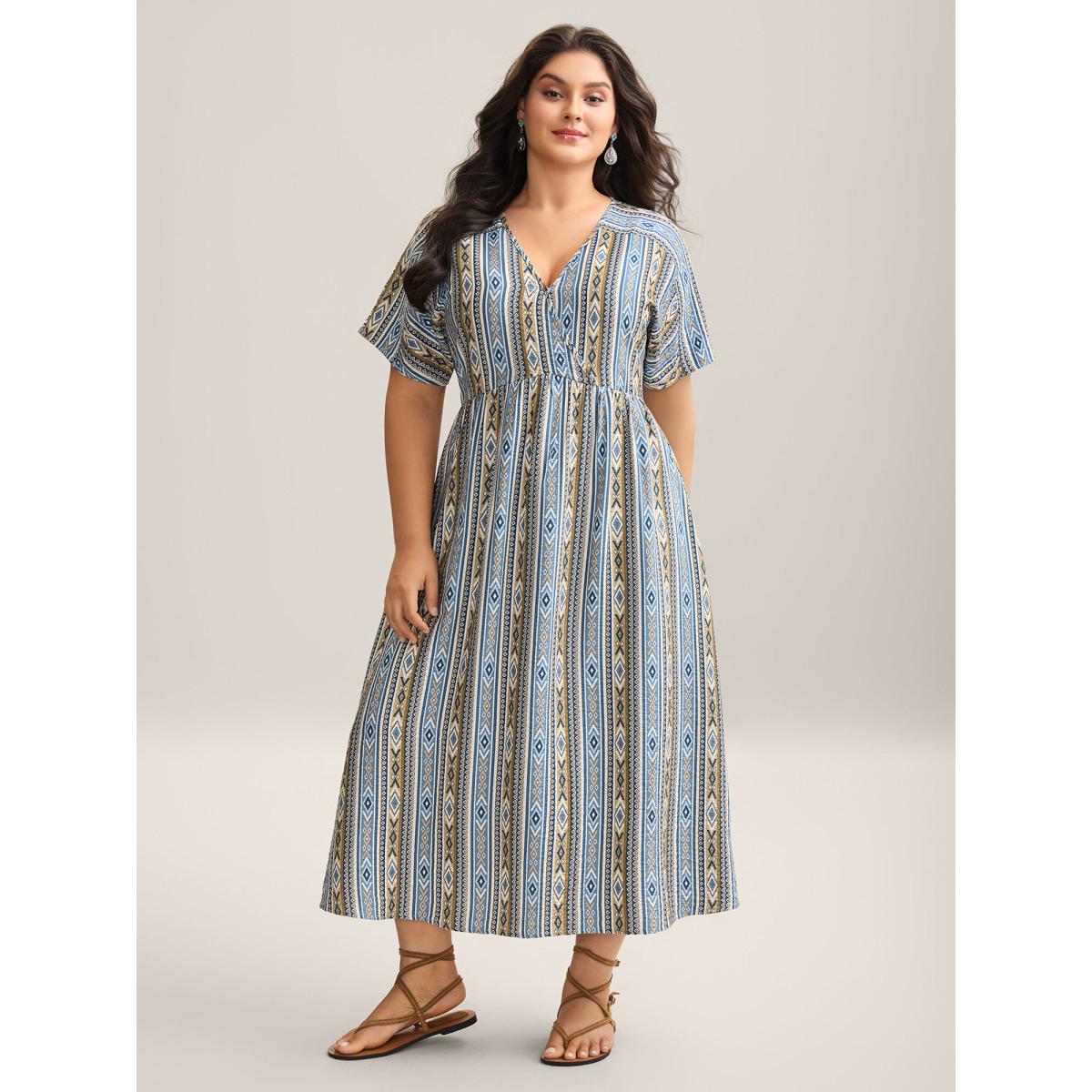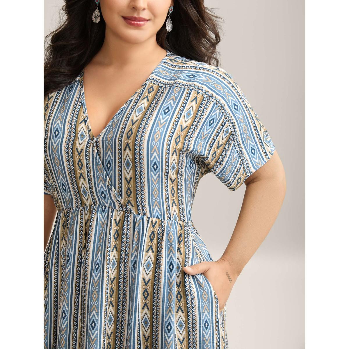 Plus Size Boho Print Pocket Notched Ruffle Hem Dolman Sleeve Dress LightBlue Women Vacation Notched collar Short sleeve Curvy Knee Dress BloomChic 28/5X