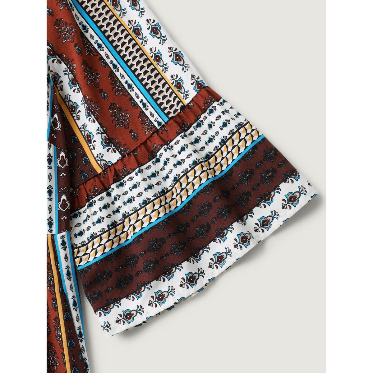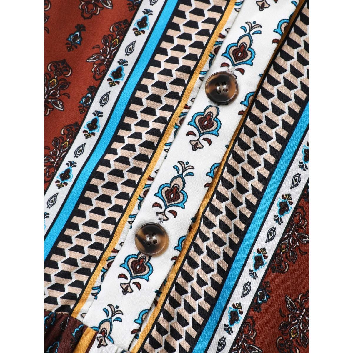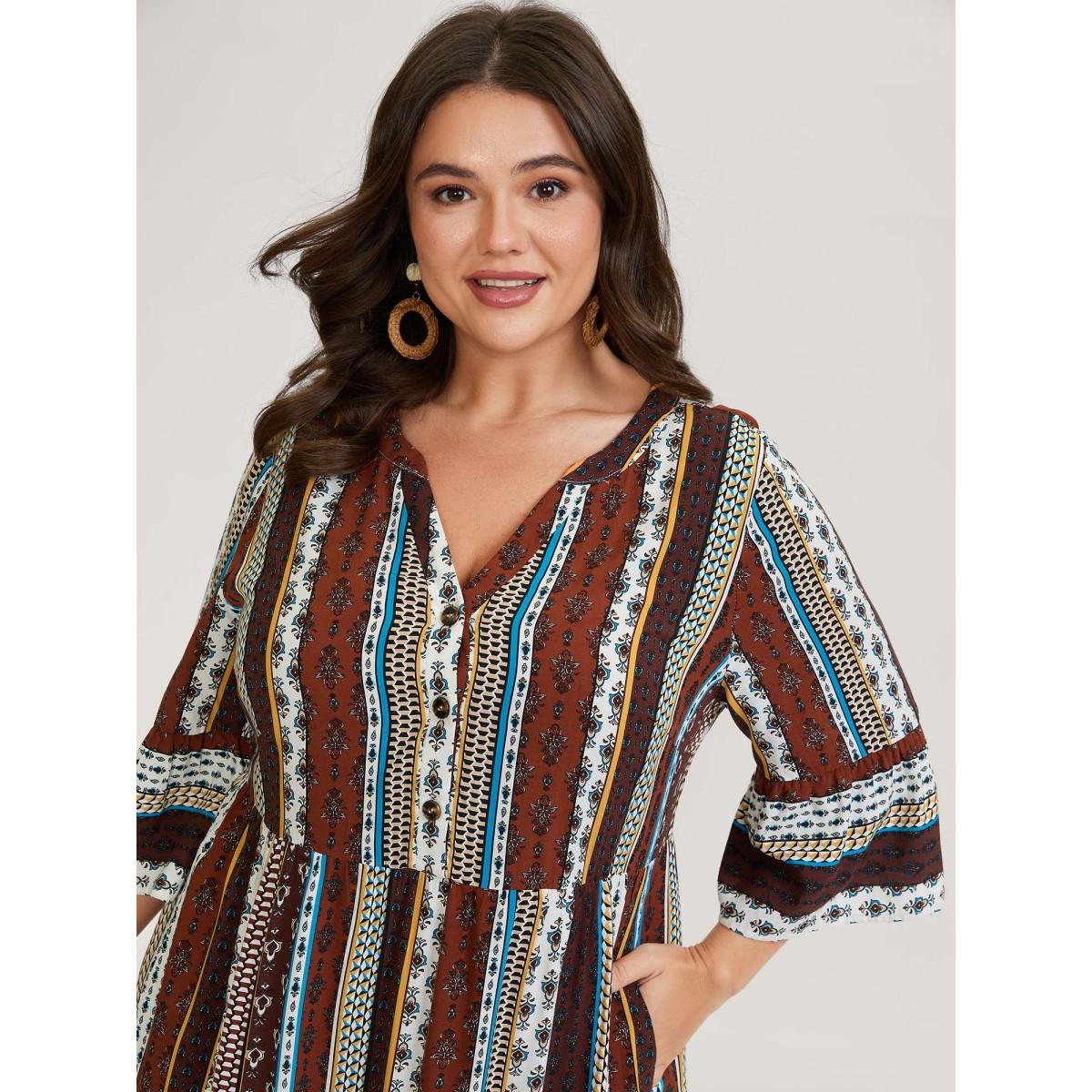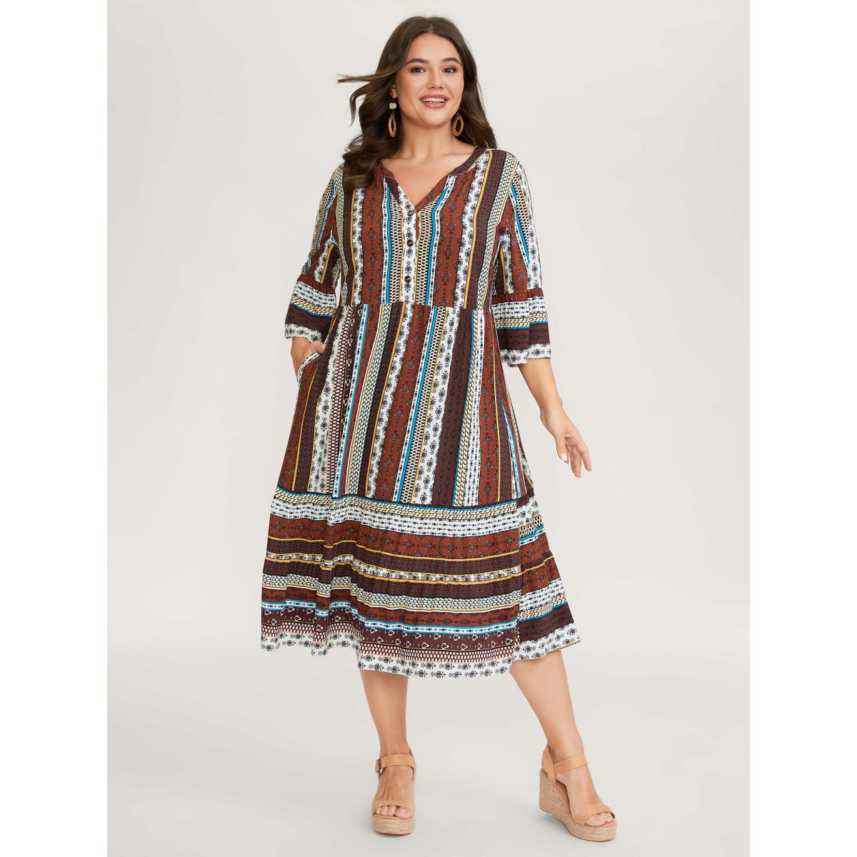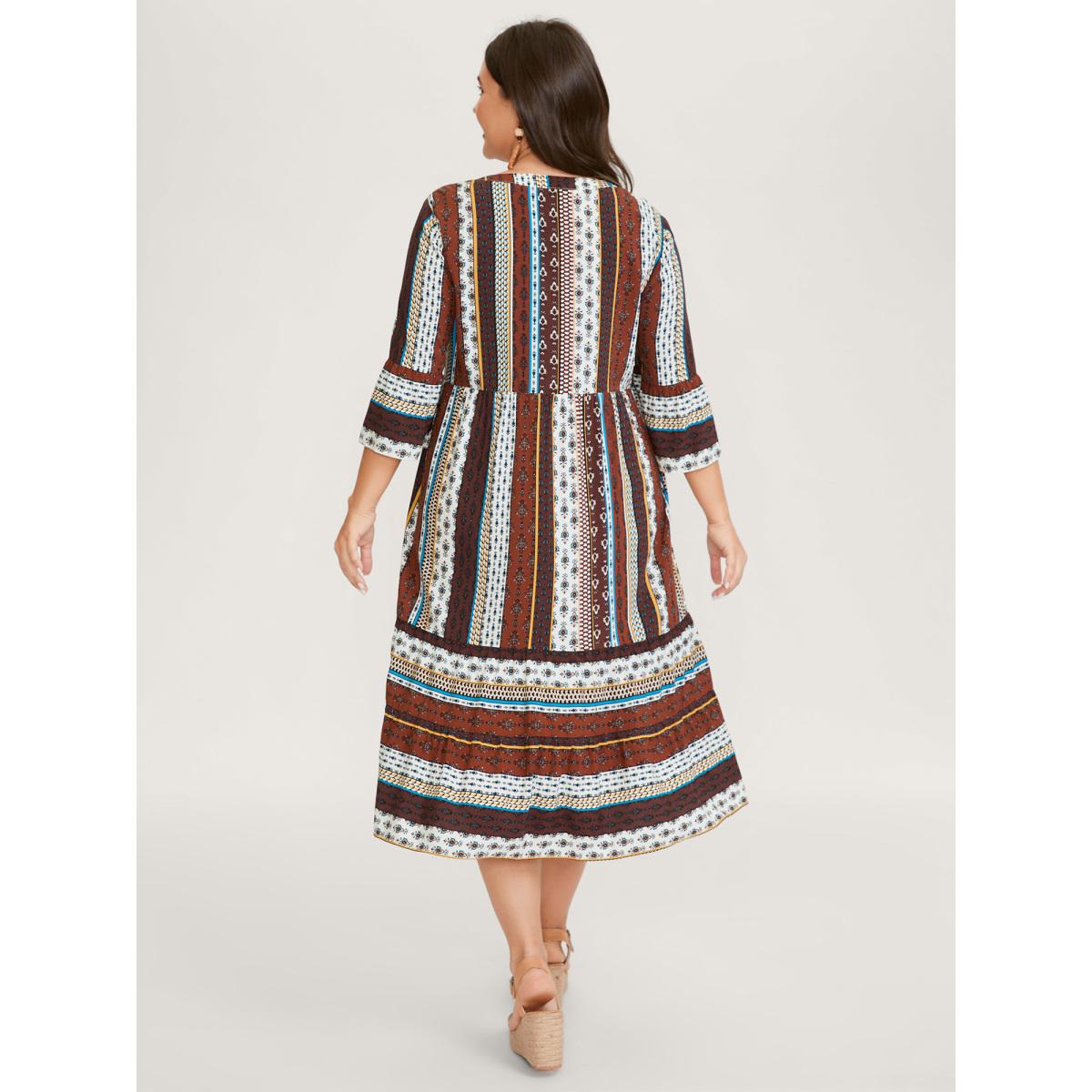 Plus Size Boho Stripes Tiered Midi Dress Multicolor Women Boho Button Flat collar with V-notch Elbow-length sleeve Curvy BloomChic 28/5X