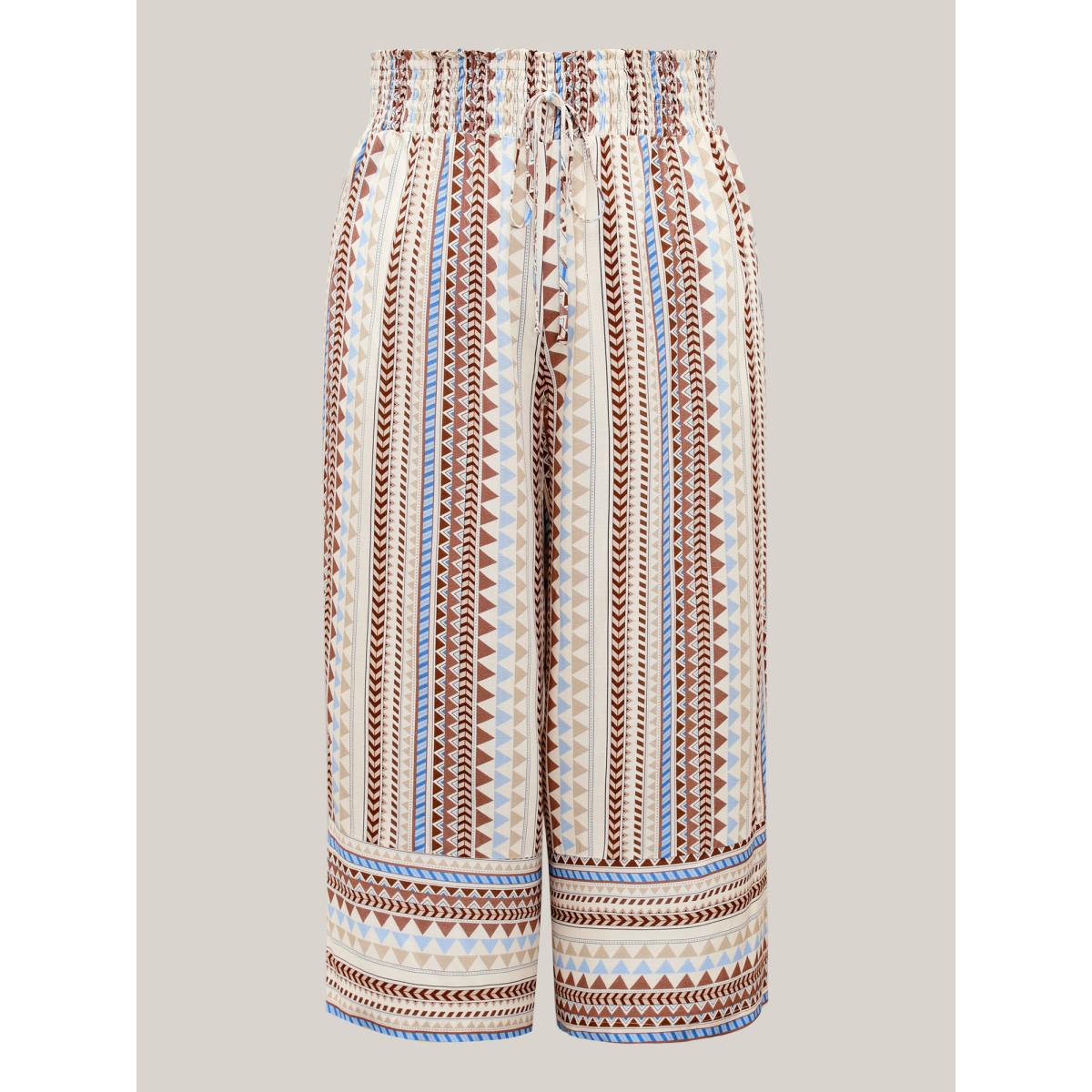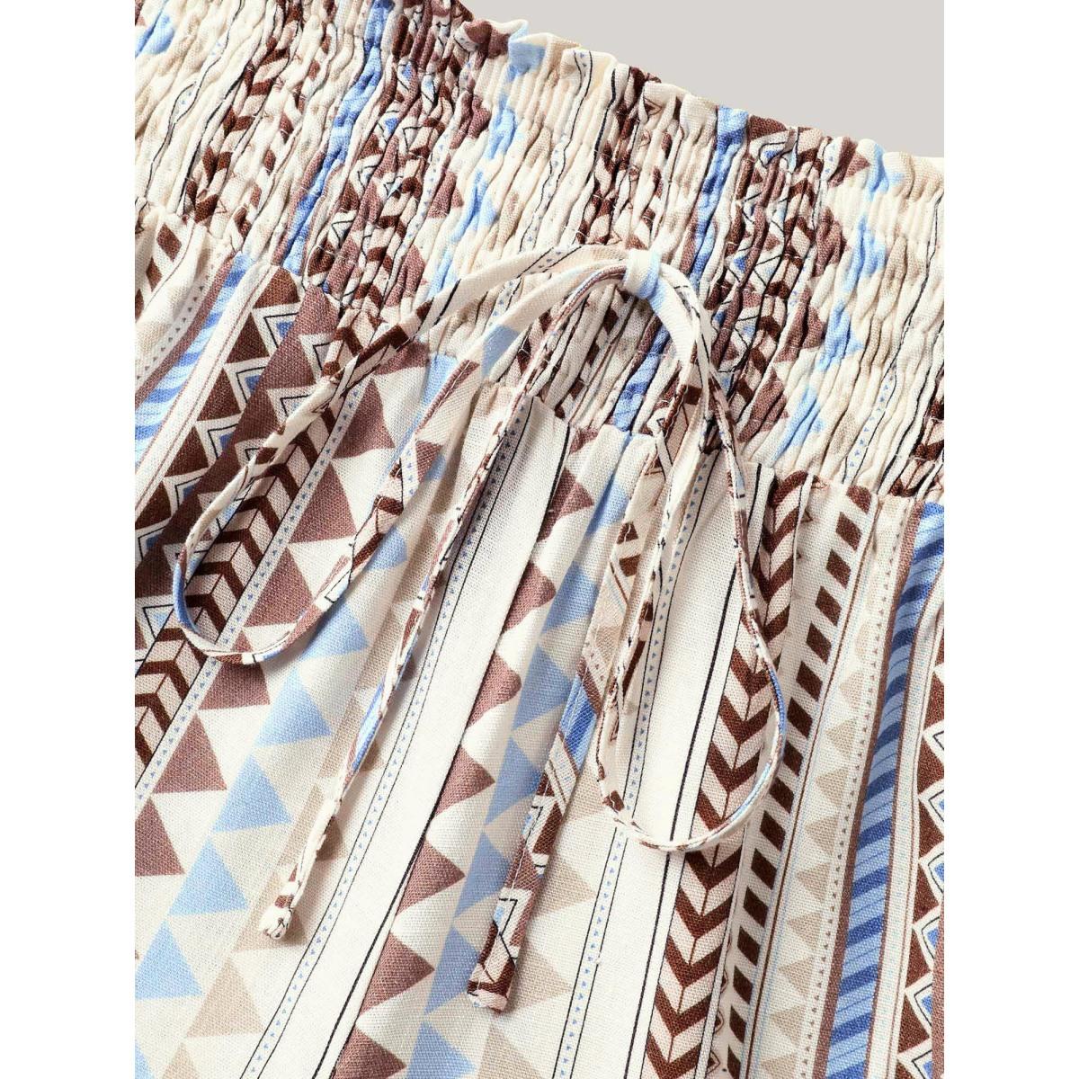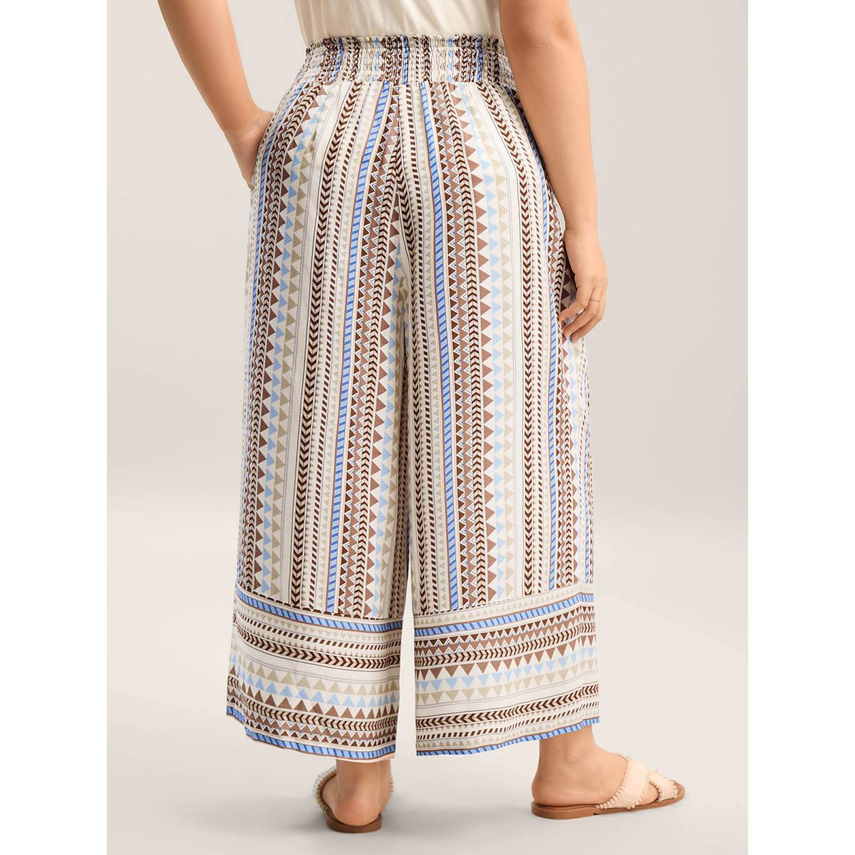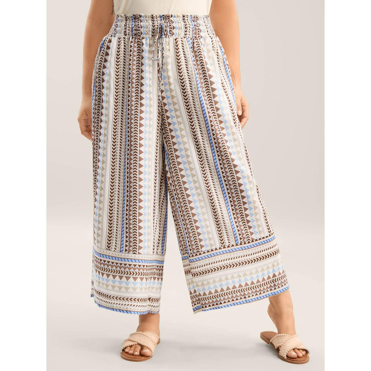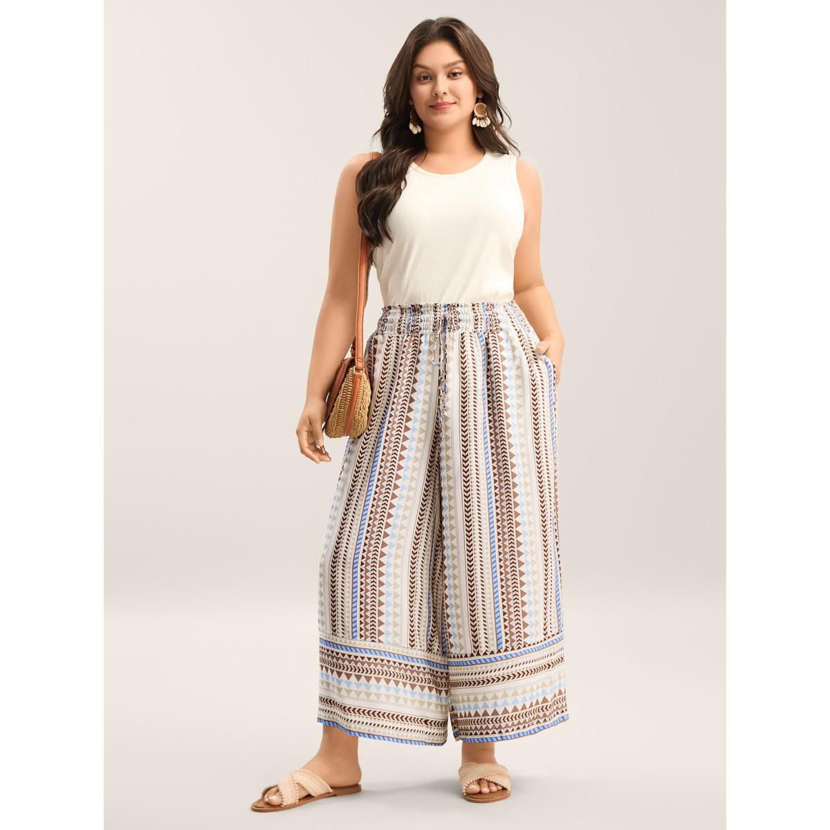 Plus Size Boho Print Shirred Waist Wide-Leg Pants Women Beige Resort Wide Leg Mid Rise Vacation Pants BloomChic 14-16/1X