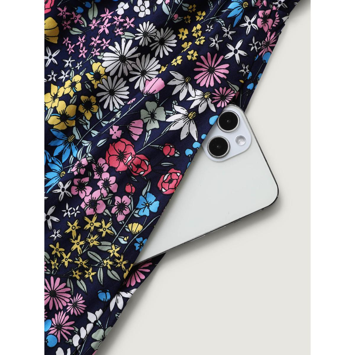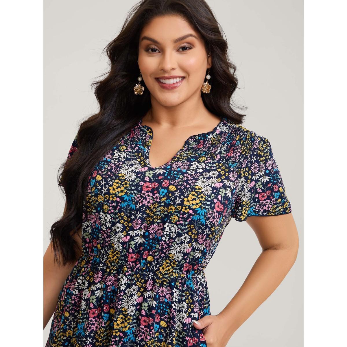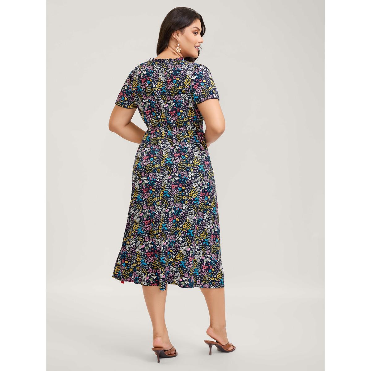 Plus Size Ditsy Floral Shirred Pocket Pleated Frill Trim Dress Indigo Women Leisure Non Round Neck Curvy Midi Dress BloomChic 18-20/2X