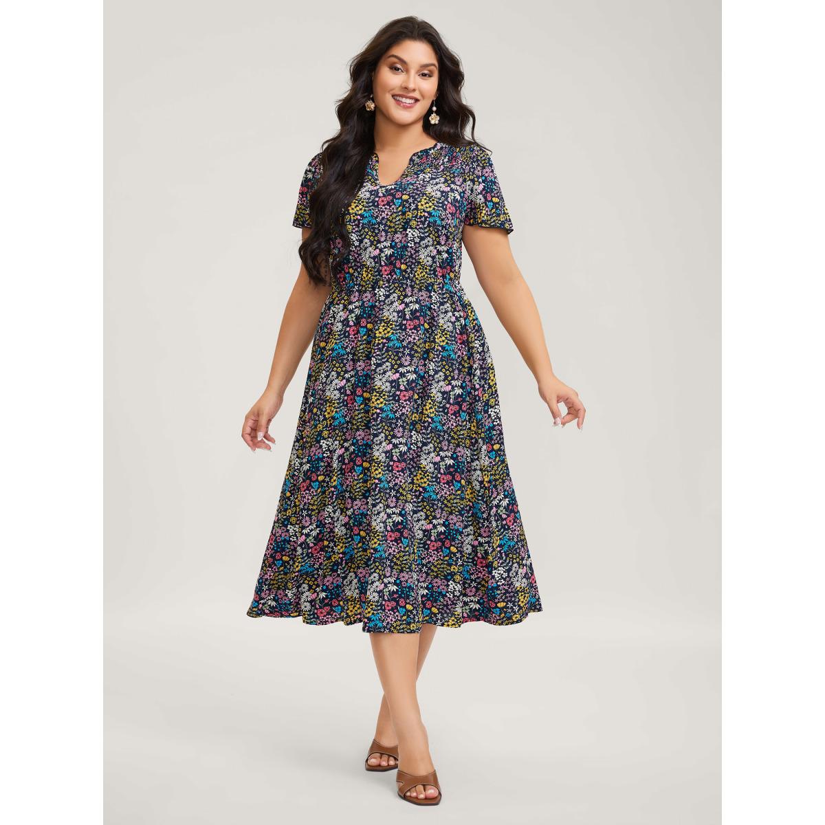 Plus Size Floral Shirred Square Neck Pocket Midi Dress Indigo Women Romantic Non Square Neck Short sleeve Curvy Midi Dress BloomChic 30/6X