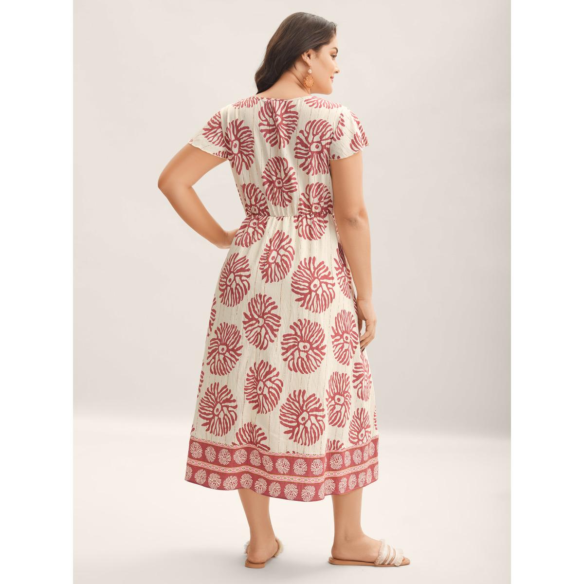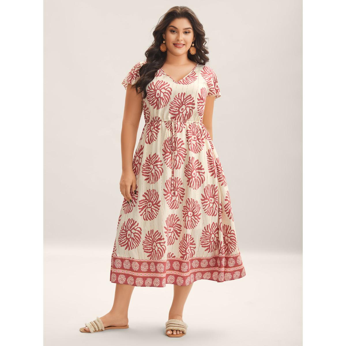 Plus Size Breezy Boho Print Drawstring Waist Midi Dress Dirtypink Women Boho Printed V-neck Cap Sleeve Curvy BloomChic 30/6X