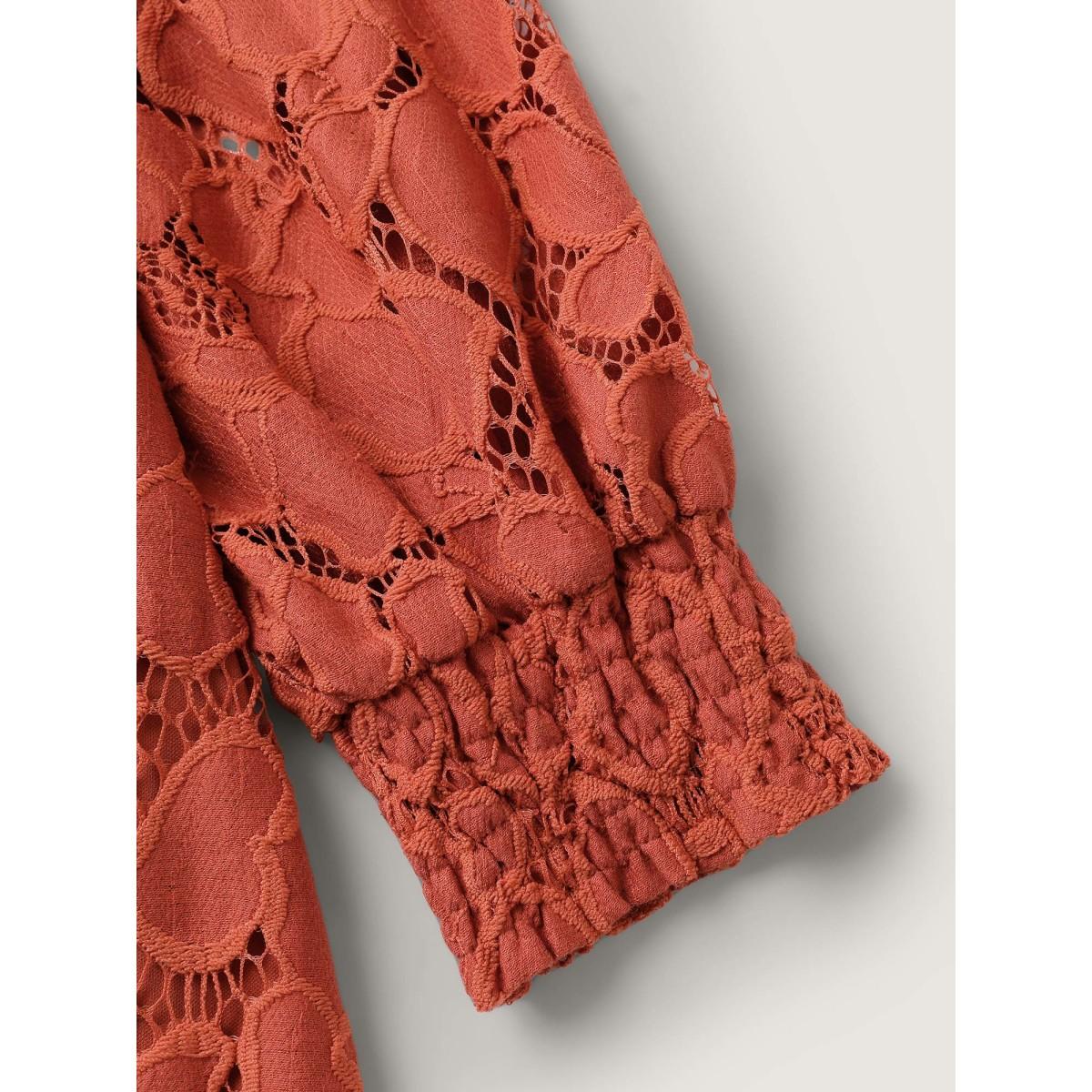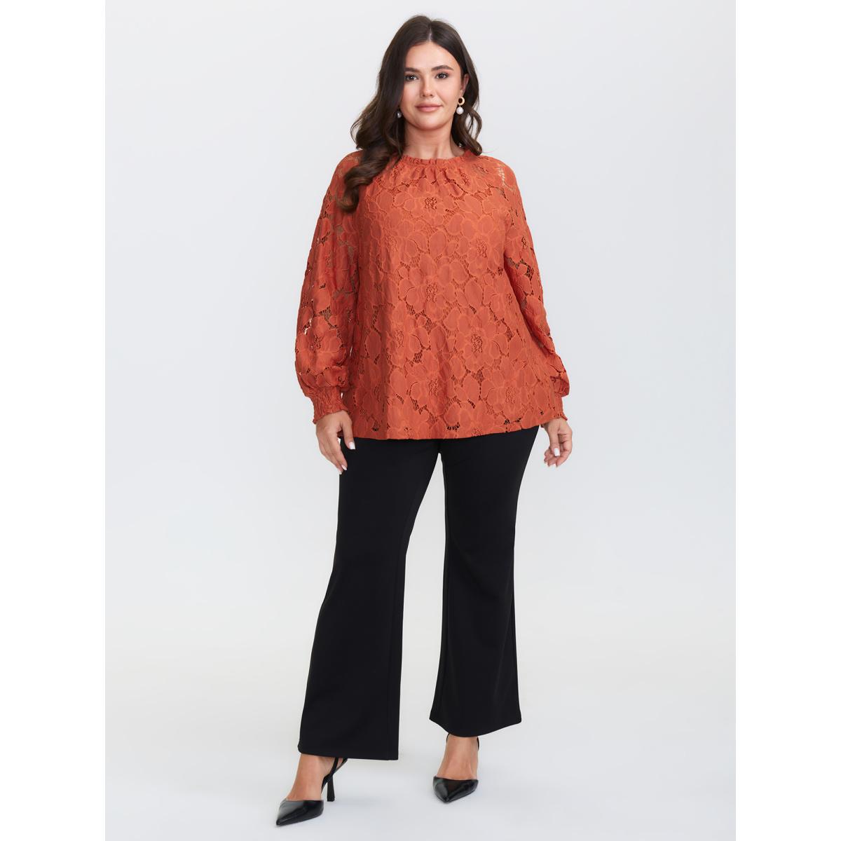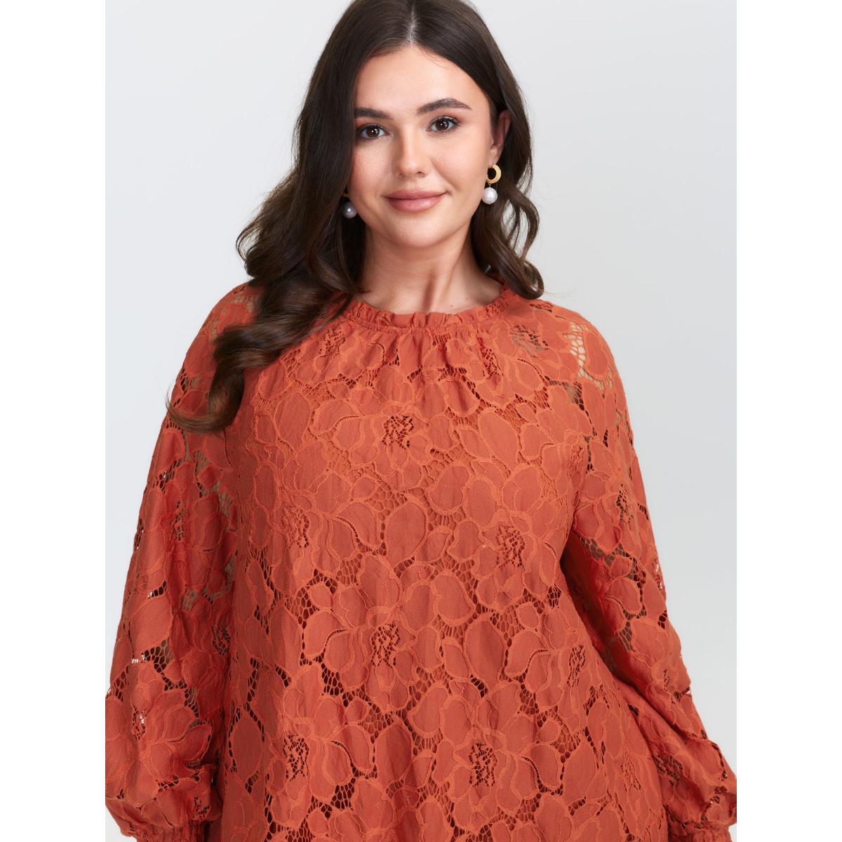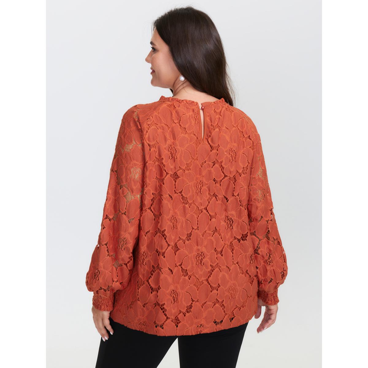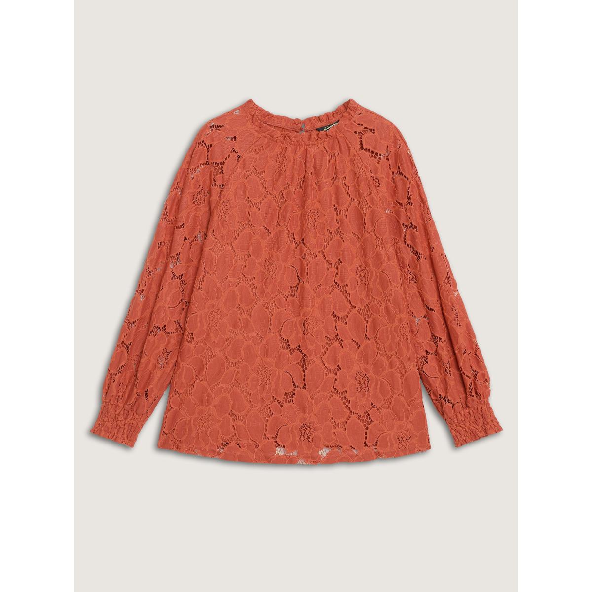 Plus Size Brightorange Lace Ruffled Neckline Shirred Blouse Women Romantic Long Sleeve Stand-up collar Elegant Blouses BloomChic 28/5X