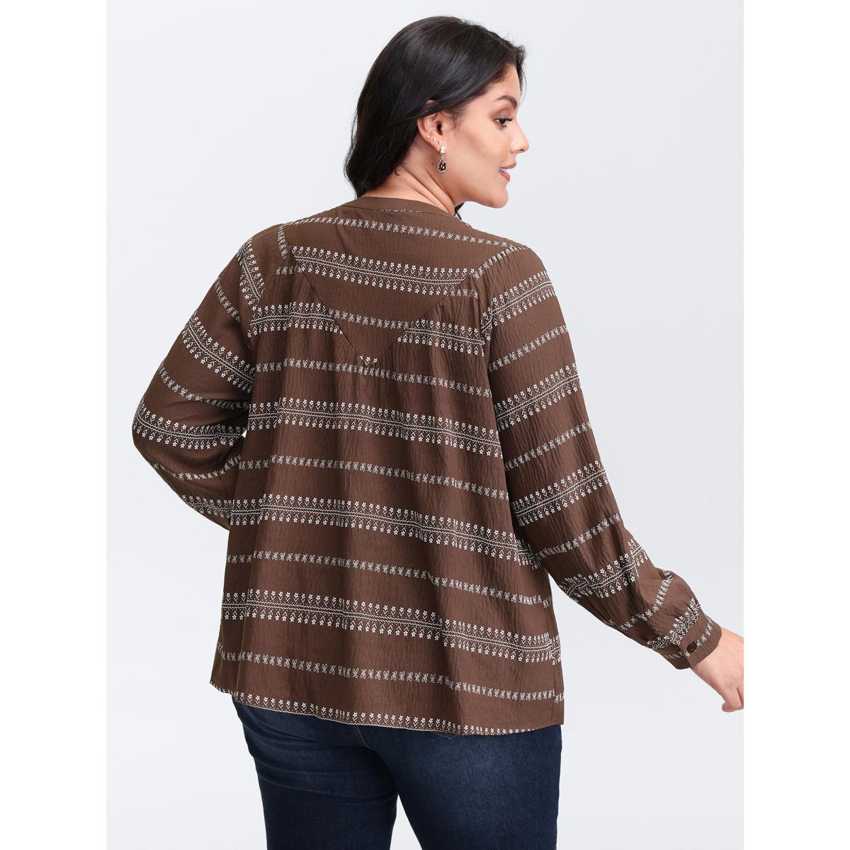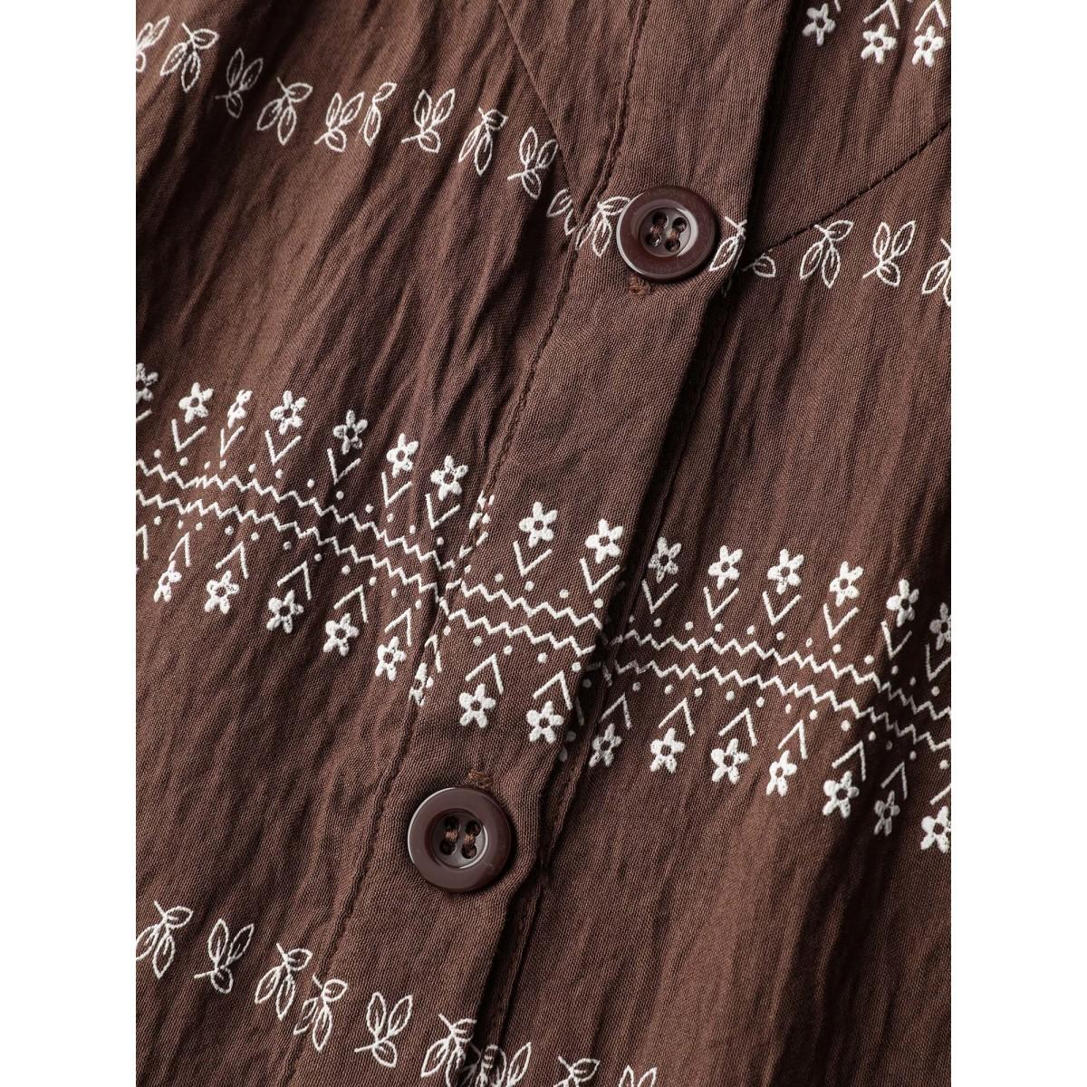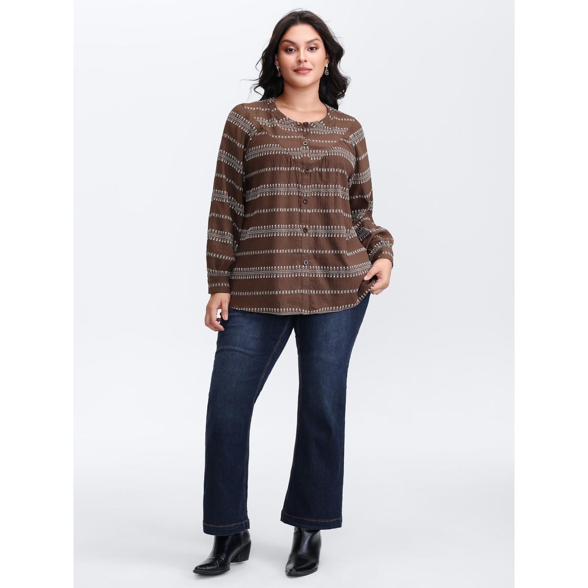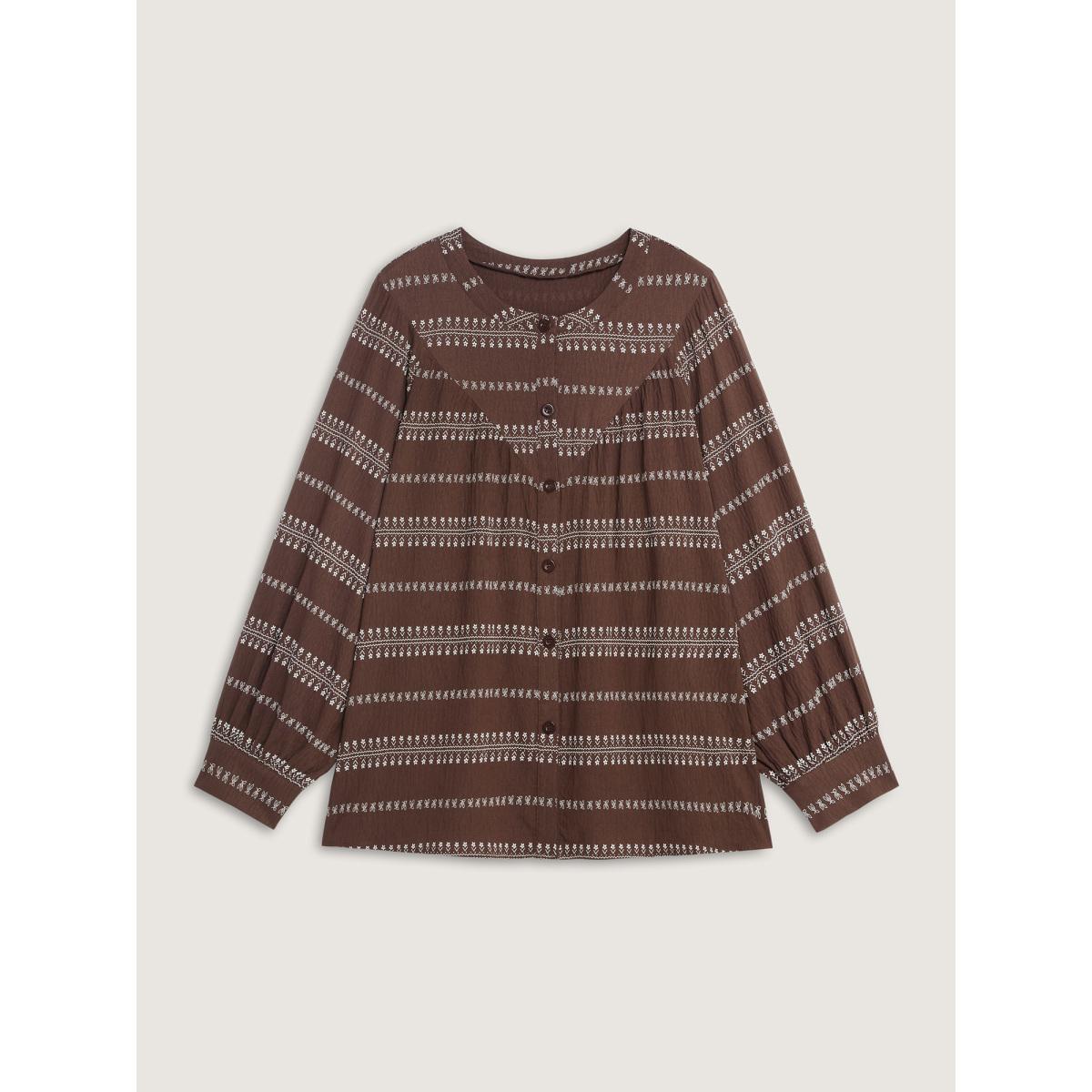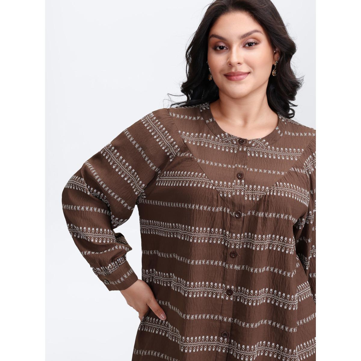 Plus Size Browncoffeecolor Floral Print Button-Front Blouse Women Boho Extra Long Sleeve Round Neck Vacation Blouses BloomChic 30/6X
