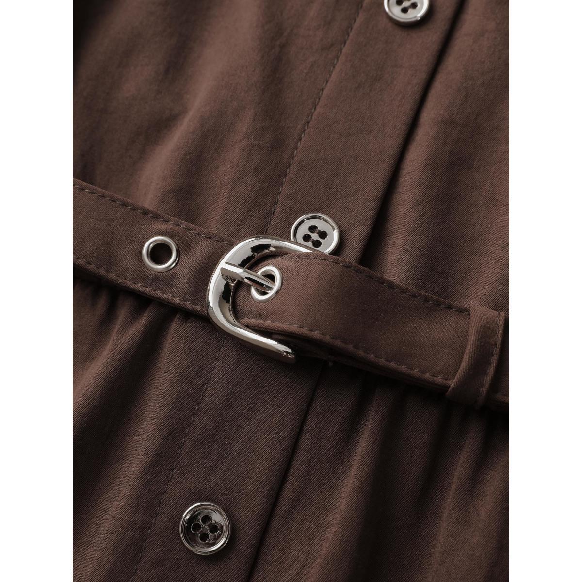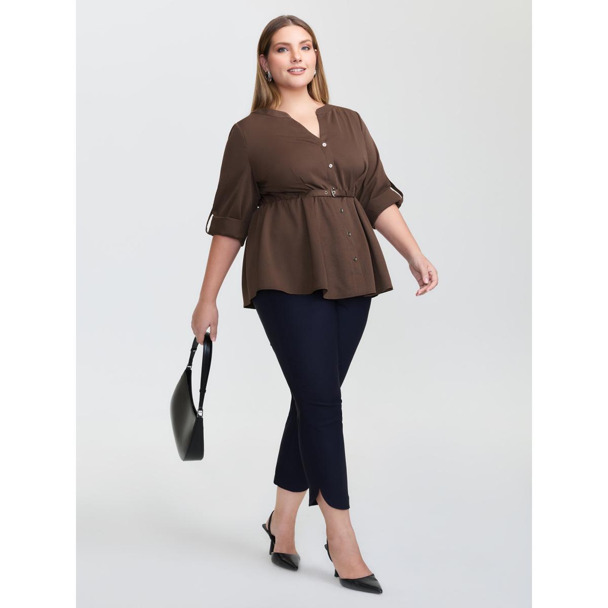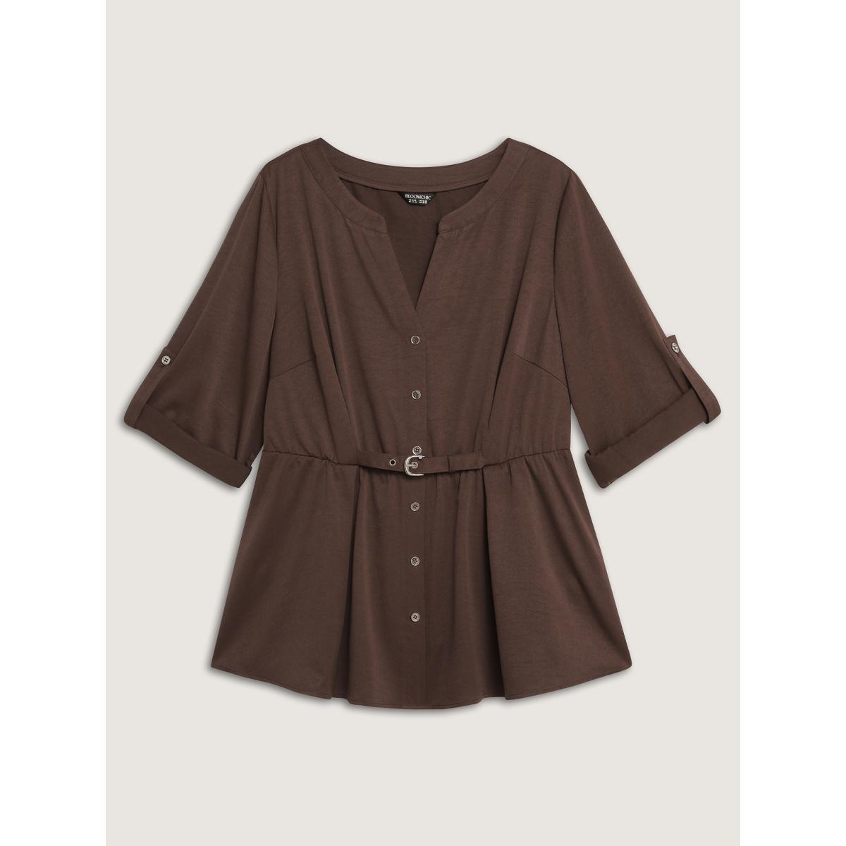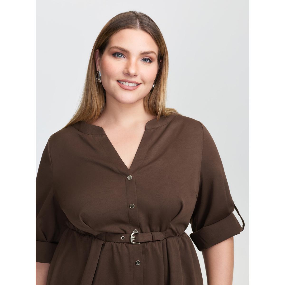 Plus Size Browncoffeecolor Waist Defining Tab Sleeve Blouse Women Office Elbow-length sleeve Notched collar Office Blouses BloomChic 26/4X