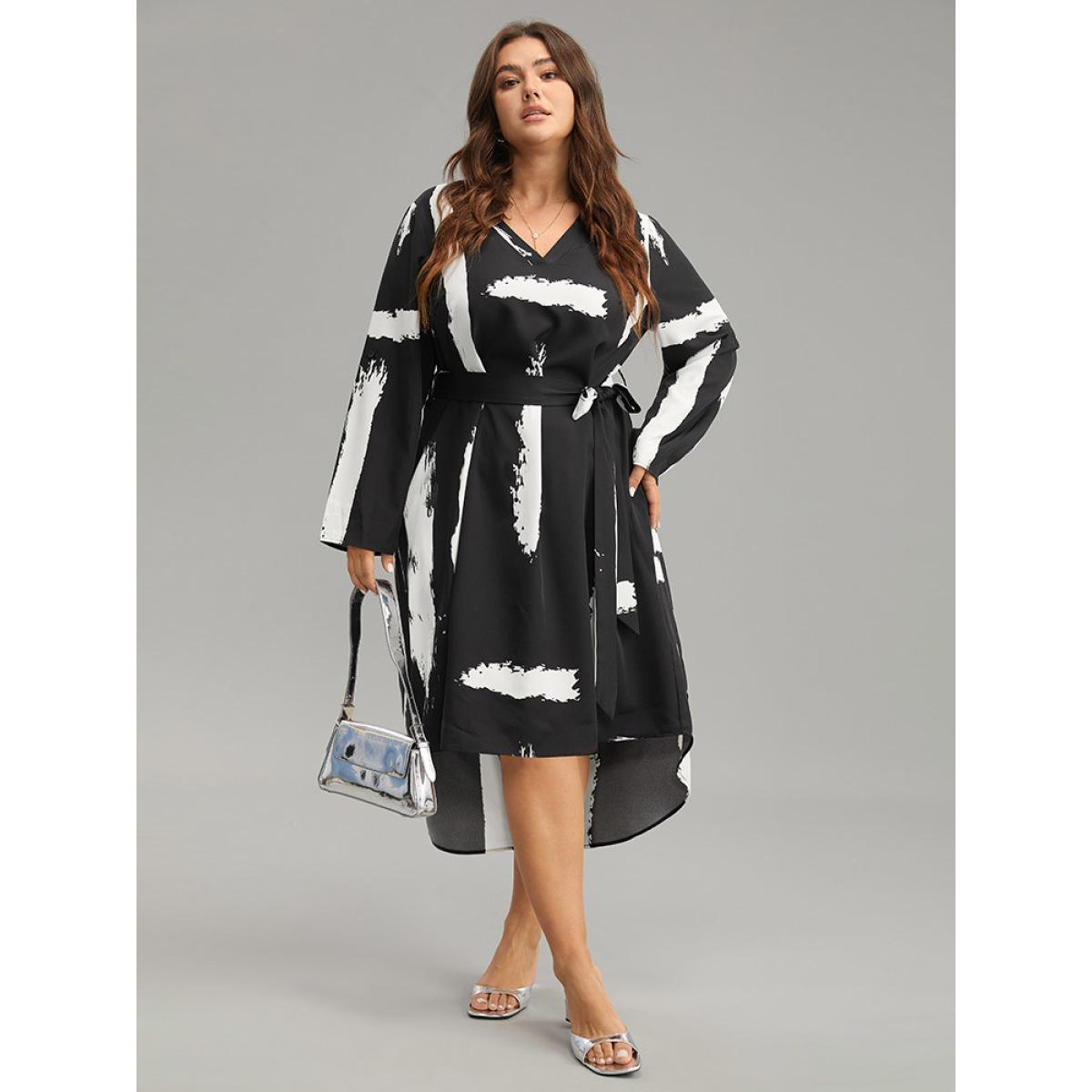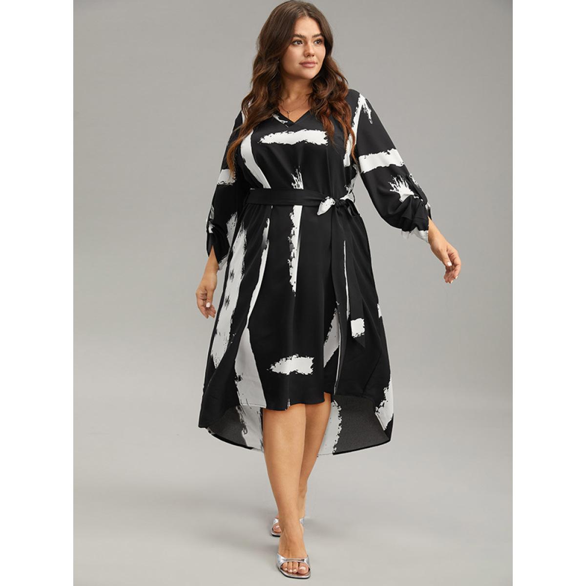 Plus Size Brush Print V Neck Belted Tab Sleeve Dress BlackFlower Women Office Belted V-neck Long Sleeve Curvy Knee Dress BloomChic 28/5X