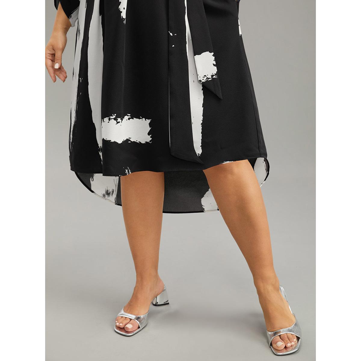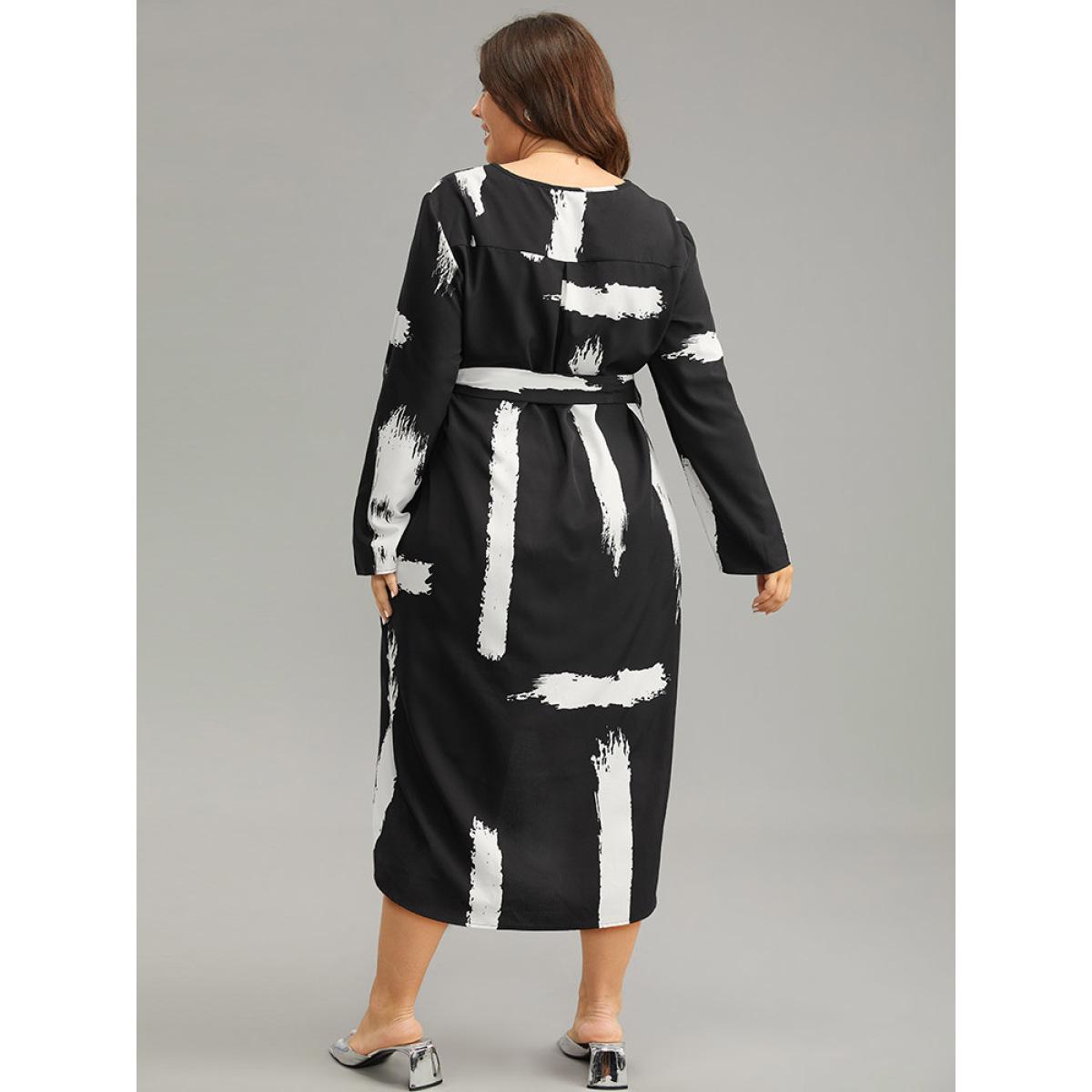 Plus Size Brush Print V Neck Belted Tab Sleeve Dress BlackFlower Women Office Belted V-neck Long Sleeve Curvy Knee Dress BloomChic 28/5X Product Image