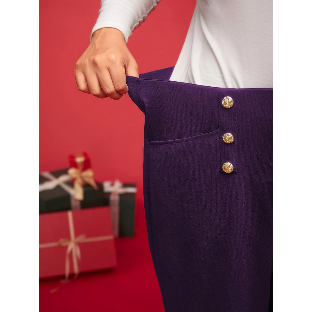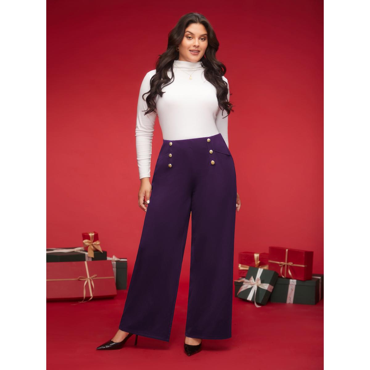 Plus Size Buckle Detail Wide-Leg Pants Women Eggplant Formal Wide Leg High Rise Party Pants BloomChic 22-24/3X
