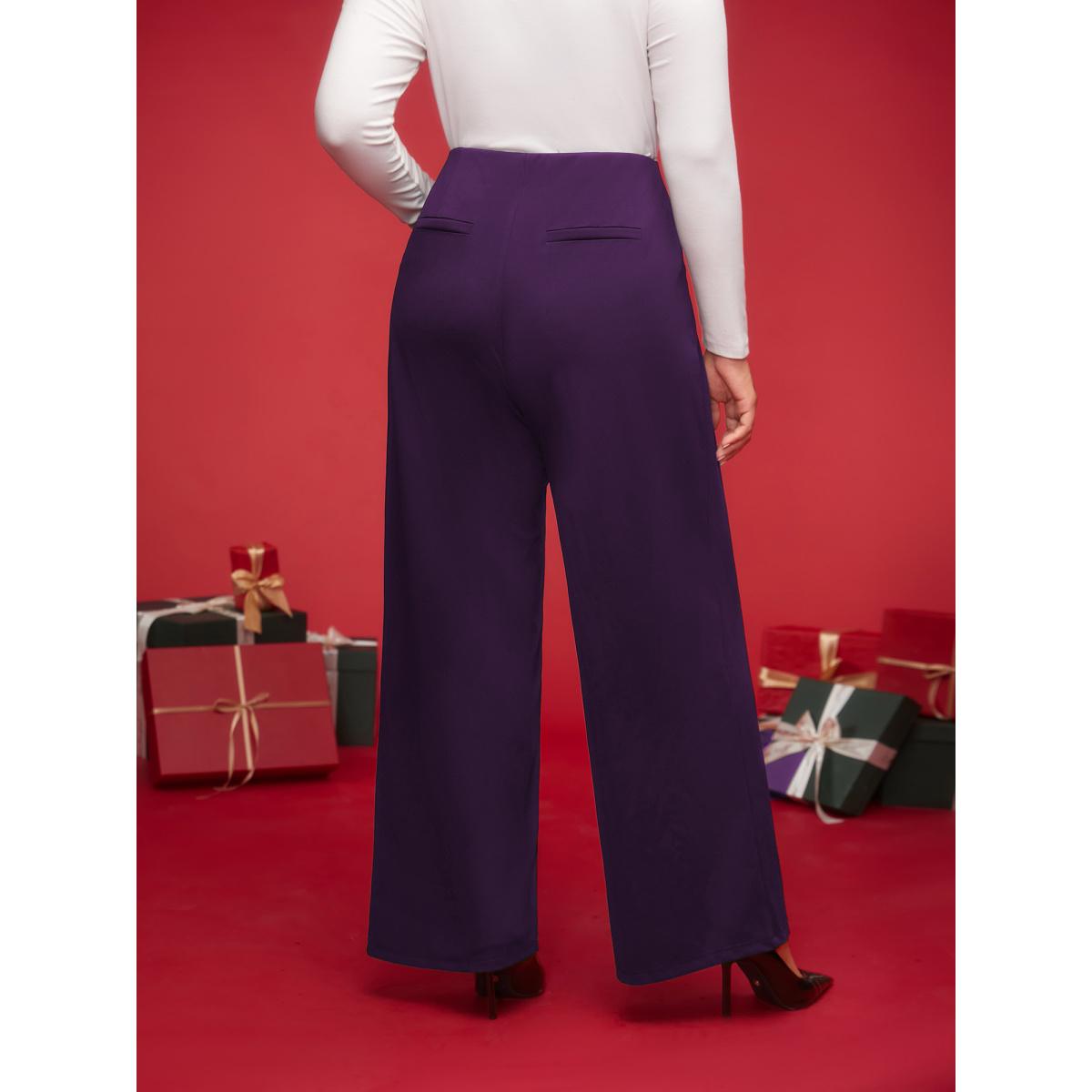Plus Size Solid Flap Pocket Buckle Belt Wide Leg Pants Women Eggplant Office Straight Leg High Rise Office Pants BloomChic 30/6X