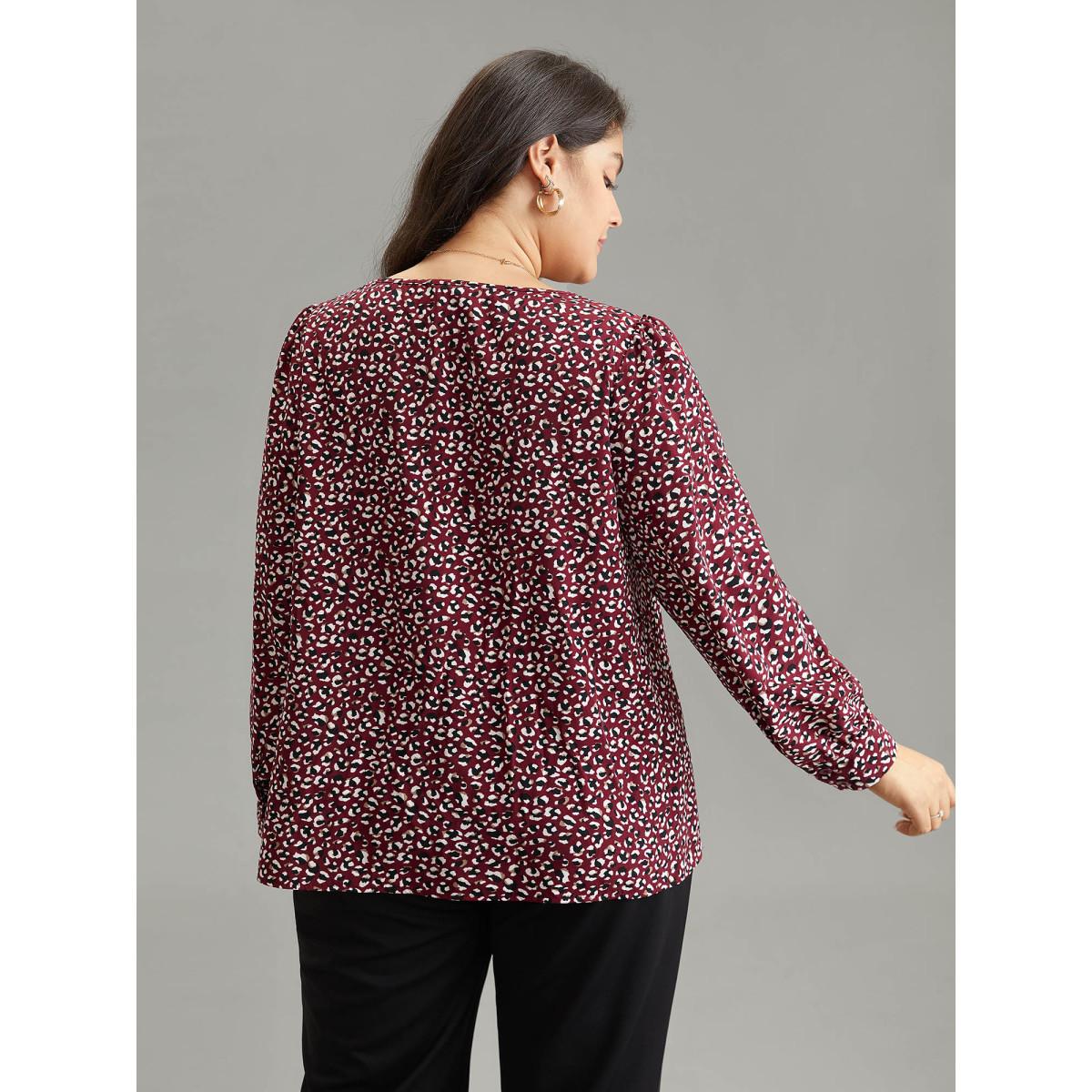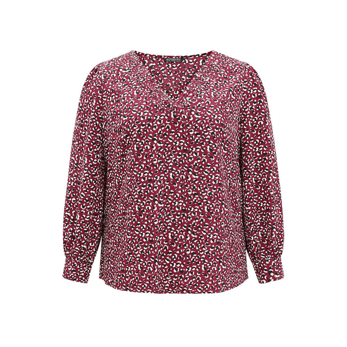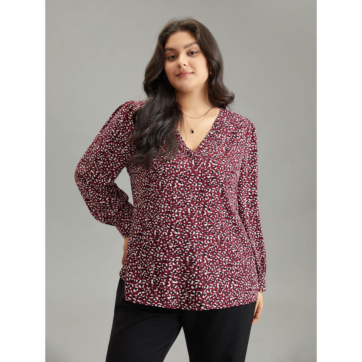 Plus Size Burgundy Allover Print V Neck Pleated Blouse Women Office Long Sleeve V-neck Office Blouses BloomChic 14-16/1X
