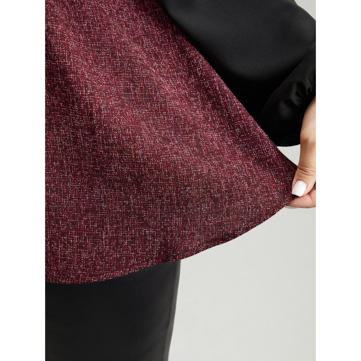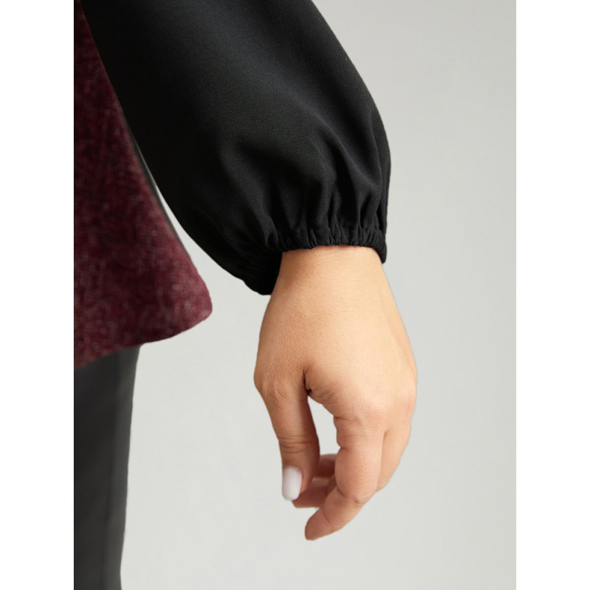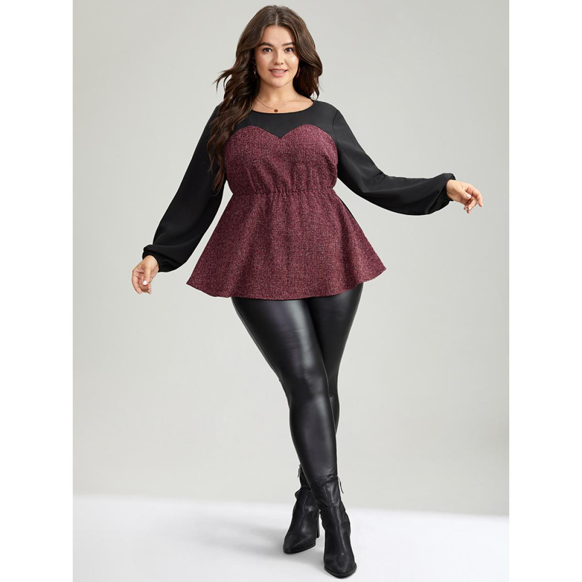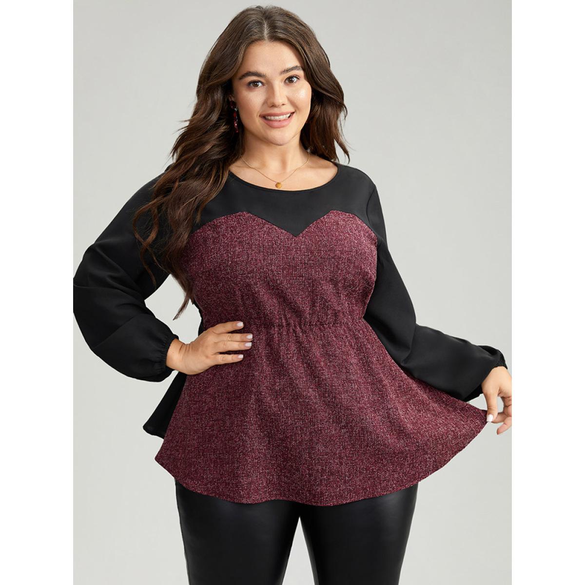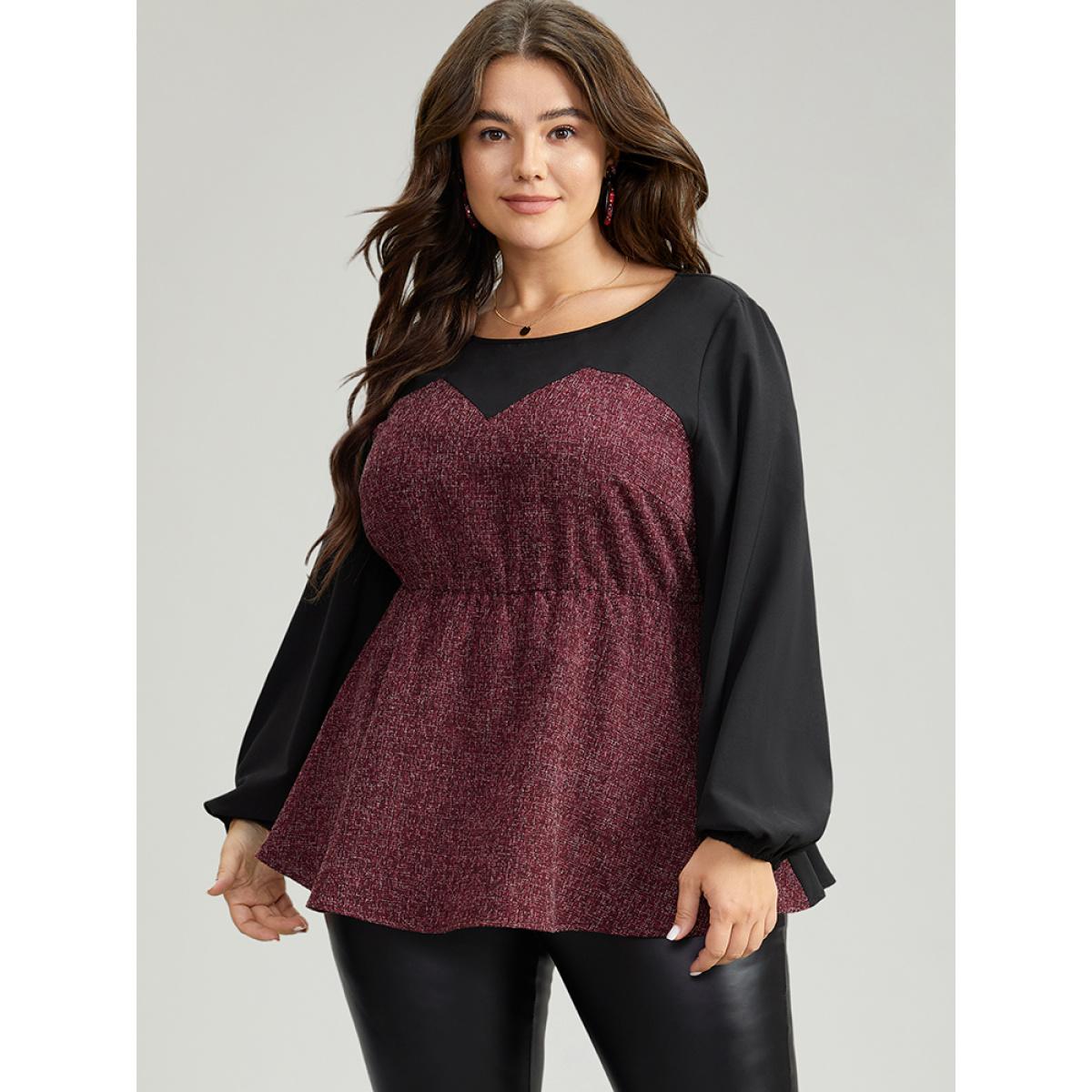 Plus Size Burgundy Contrast Patchwork Lantern Sleeve Elastic Waist Blouse Women Elegant Long Sleeve Round Neck Festival-Christmas Blouses BloomChic 18-20/2X