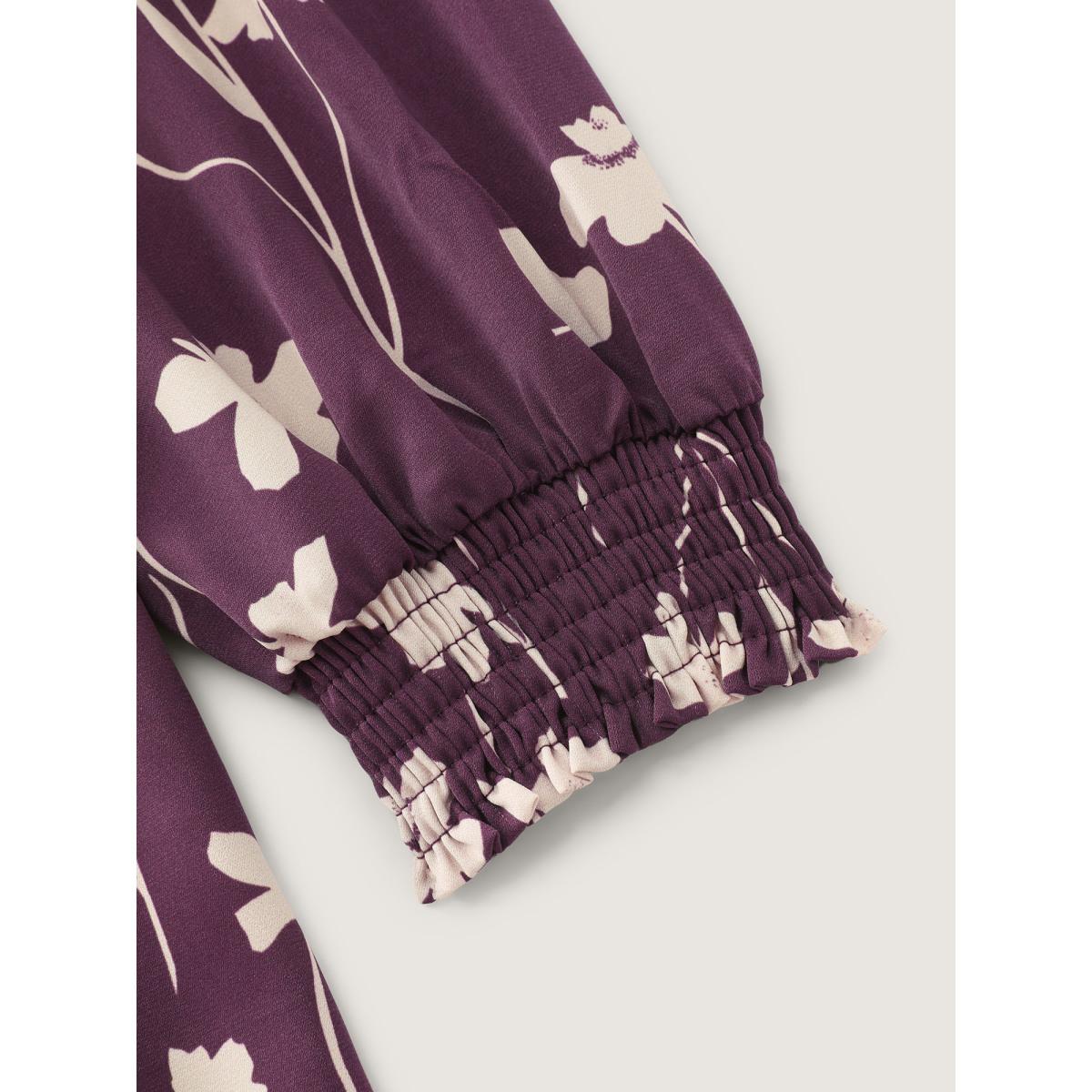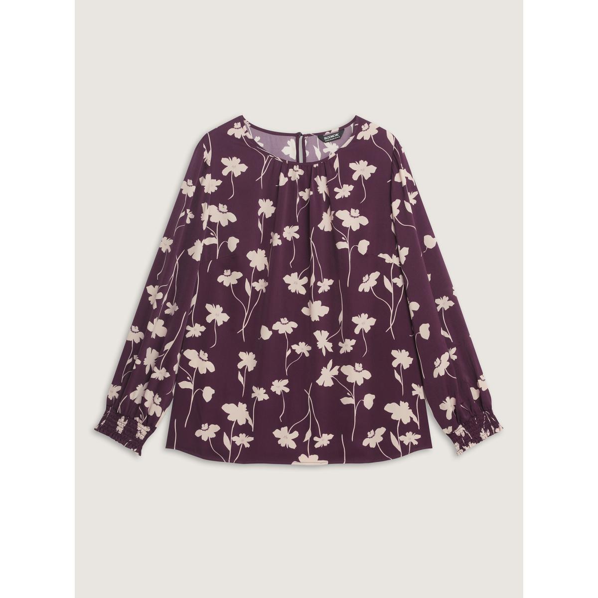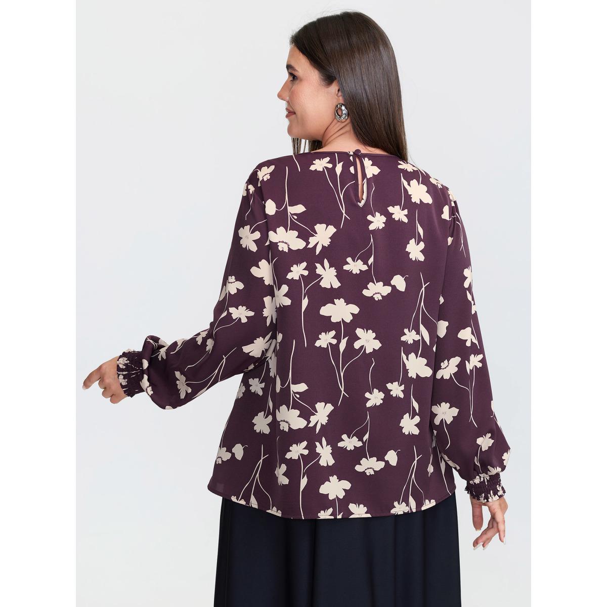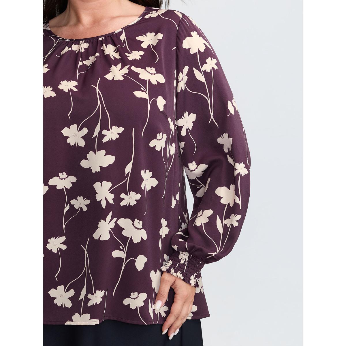 Plus Size Burgundy Floral Print Shirred Cuff Sleeve Blouse Women Office Long Sleeve Round Neck Office Blouses BloomChic 28/5X Product Image
