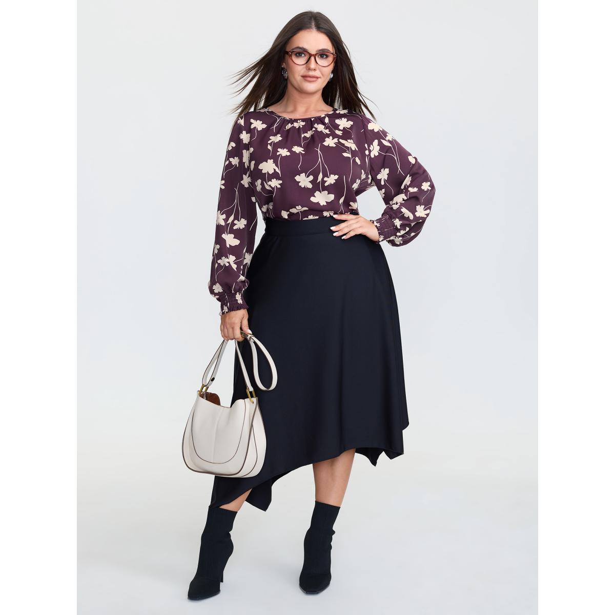 Plus Size Burgundy Floral Print Shirred Cuff Sleeve Blouse Women Office Long Sleeve Round Neck Office Blouses BloomChic 28/5X