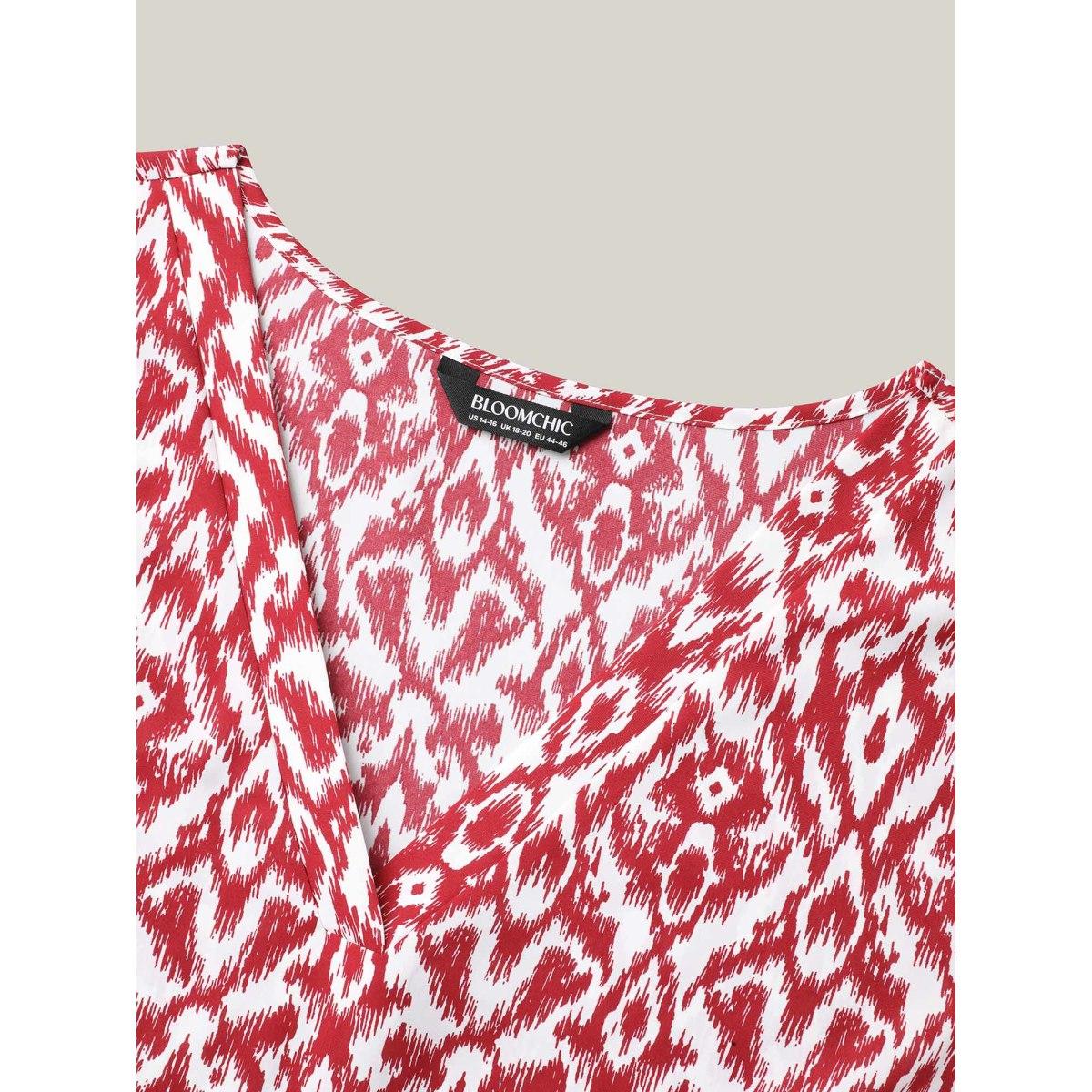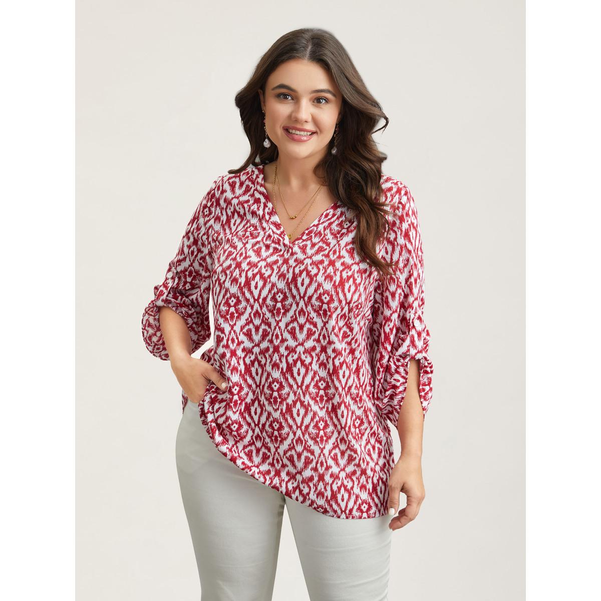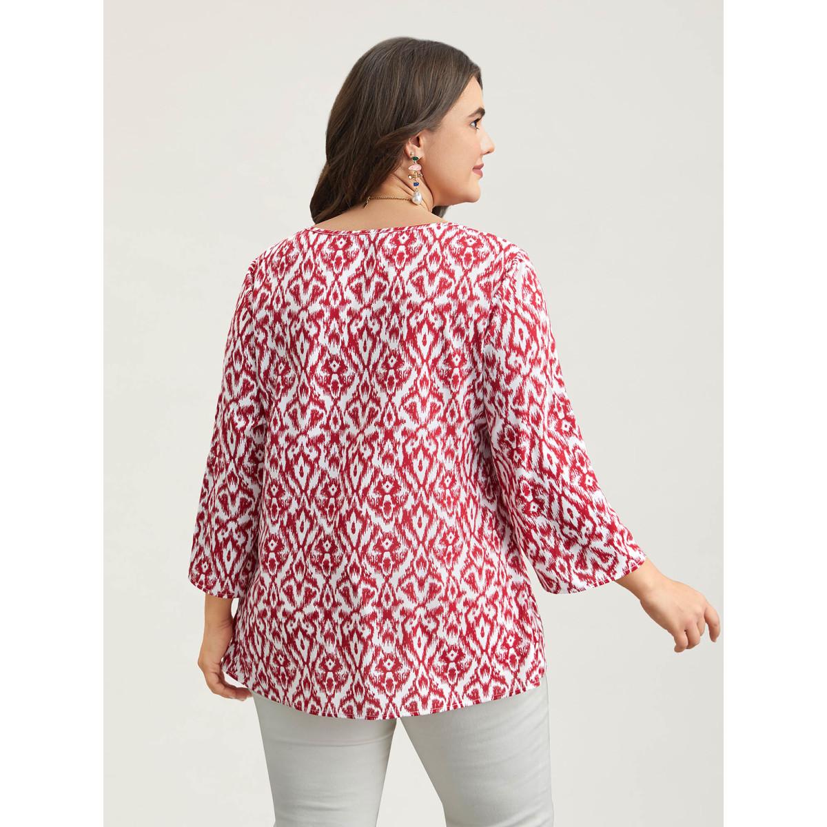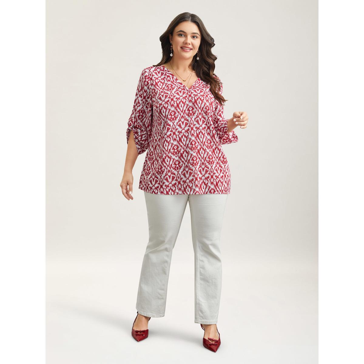 Plus Size Burgundy Geometric Print Gathered Sleeve Shirt Women Boho Elbow-length sleeve Notched collar Vacation Blouses BloomChic 14-16/1X