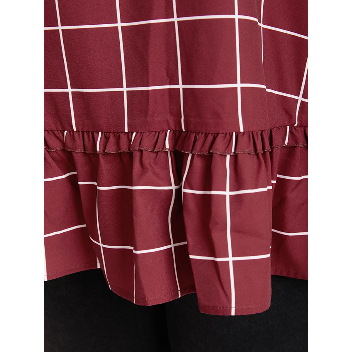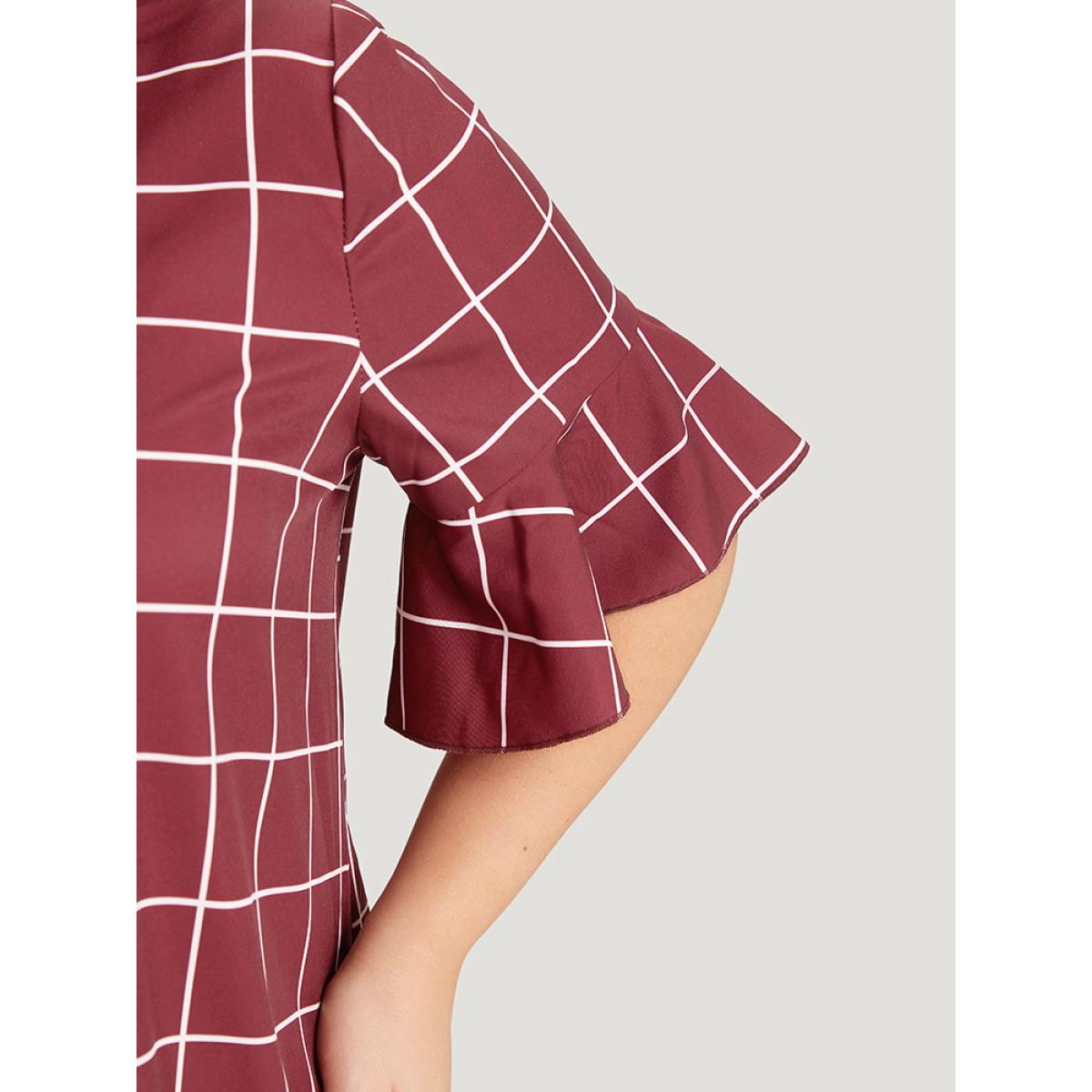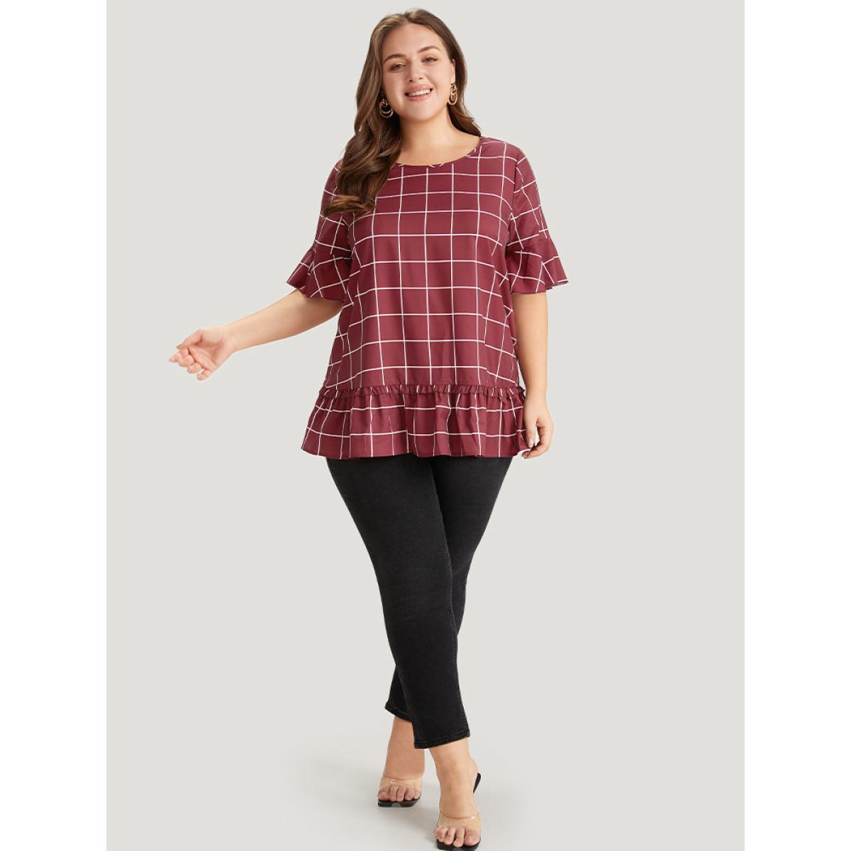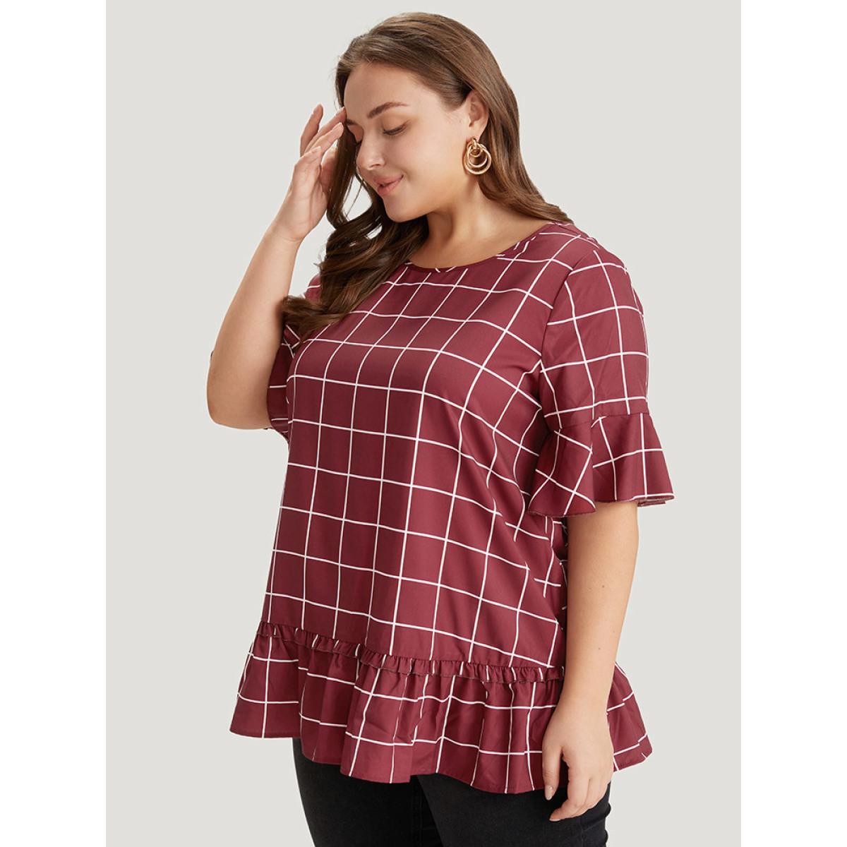 Plus Size Burgundy Plaid Frill Trim Bell Sleeve Flutter Hem Blouse Women Elegant Half Sleeve Round Neck Dailywear Blouses BloomChic 22-24/3X
