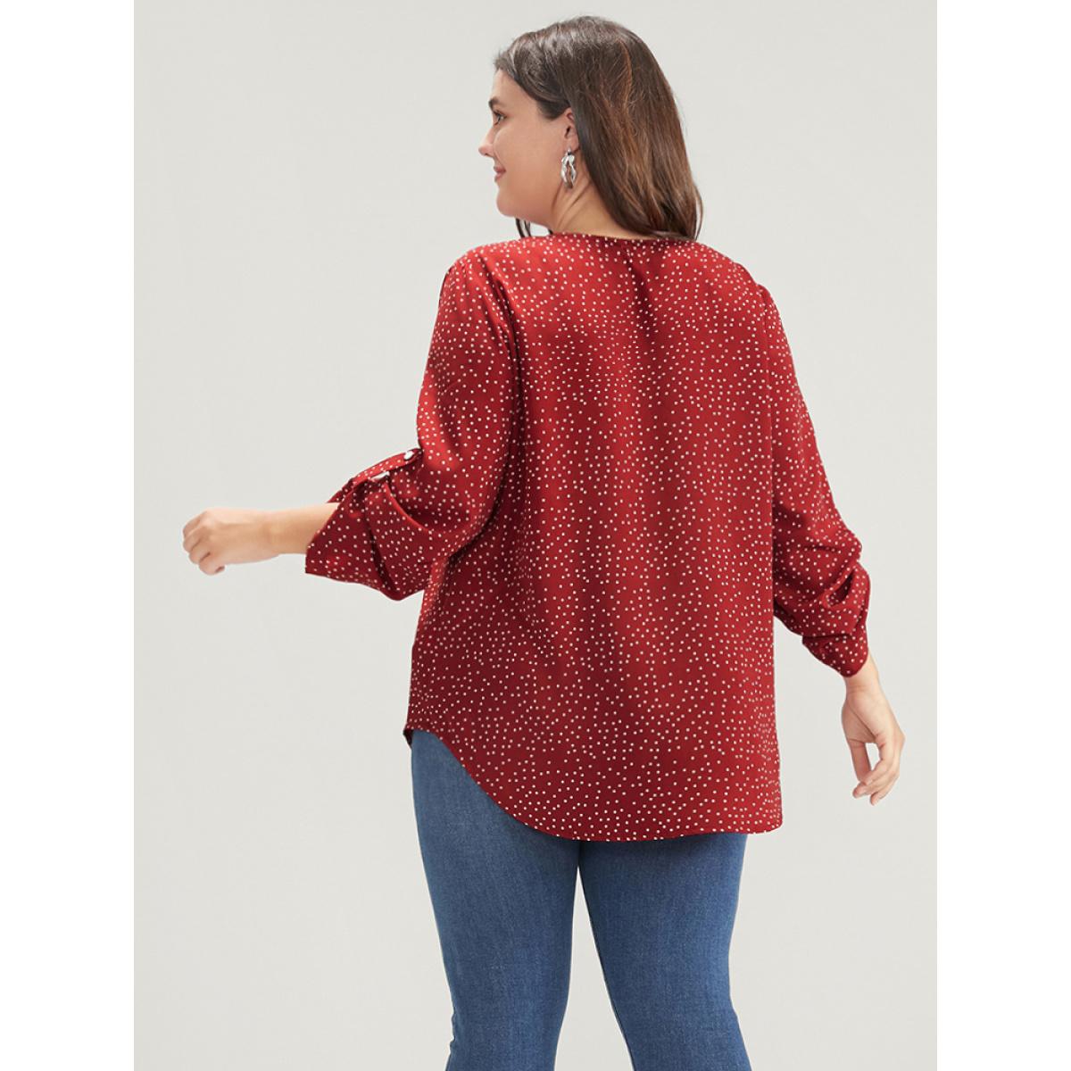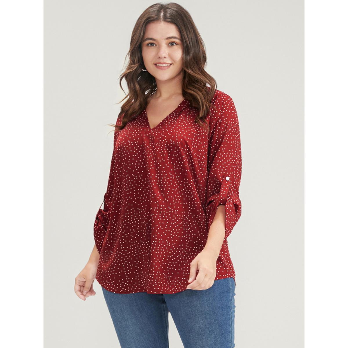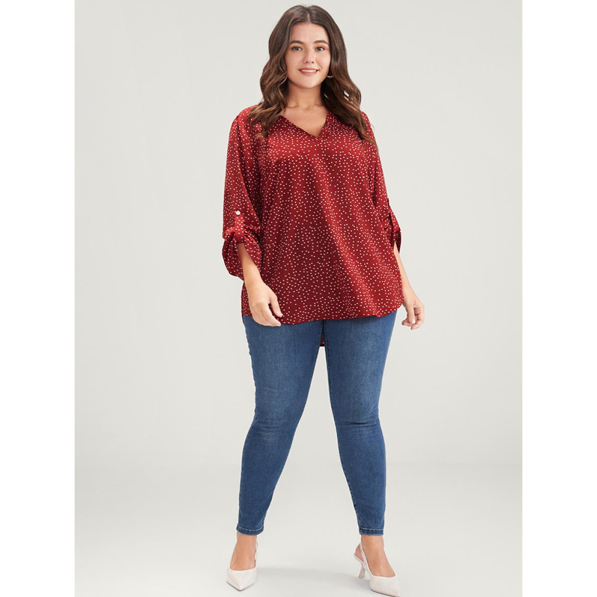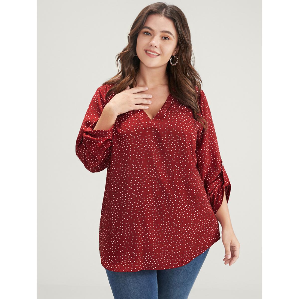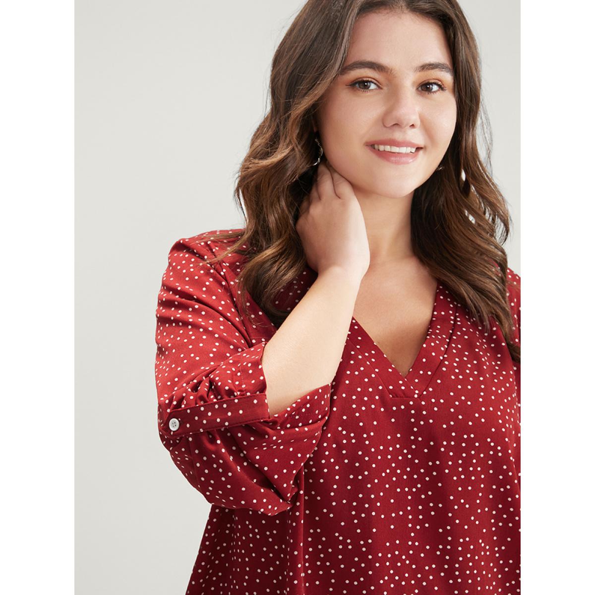 Plus Size Burgundy Polka Dot Roll Sleeve V Neck Blouse Women Elegant Elbow-length sleeve V-neck Dailywear Blouses BloomChic 28/5X
