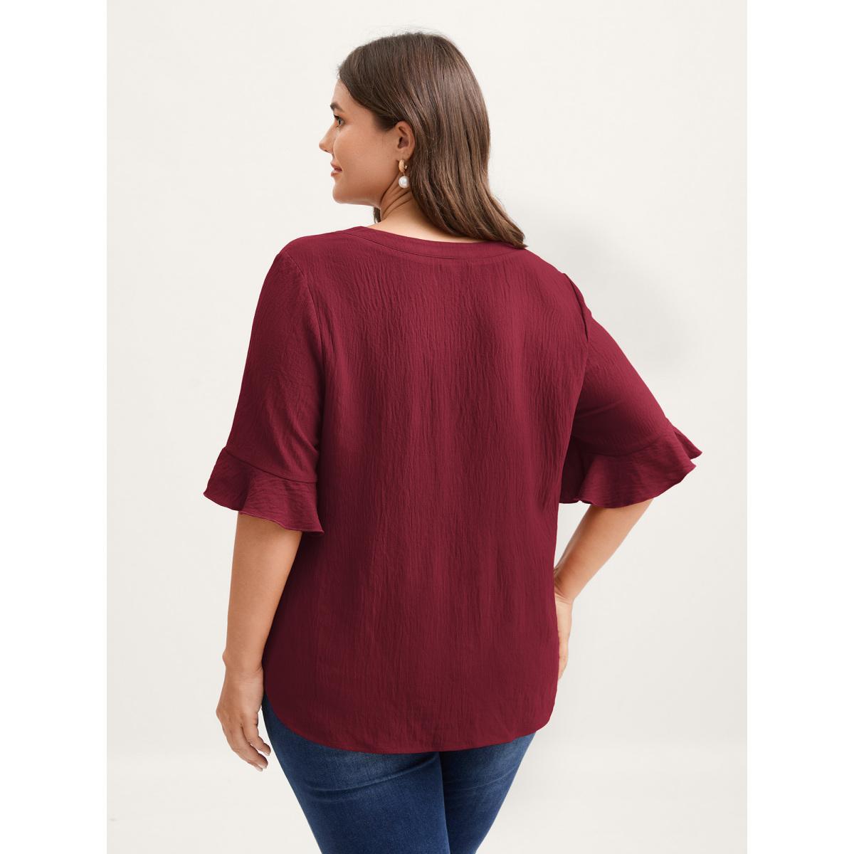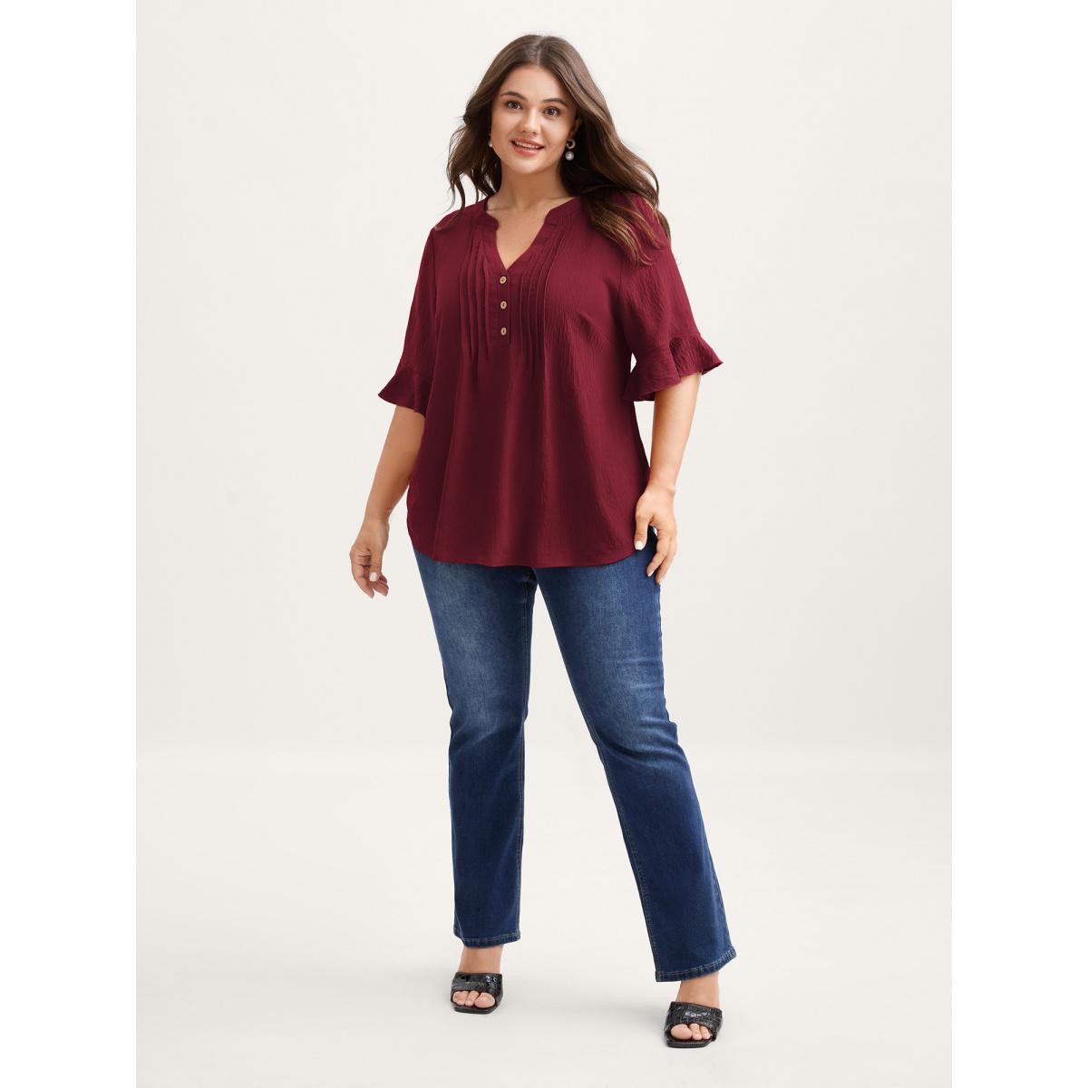 Plus Size Burgundy Toothpick Pleats Ruffled Sleeve Solid Blouse Women Timeless Half Sleeve Flat collar with V-notch Elegant Blouses BloomChic 22-24/3X