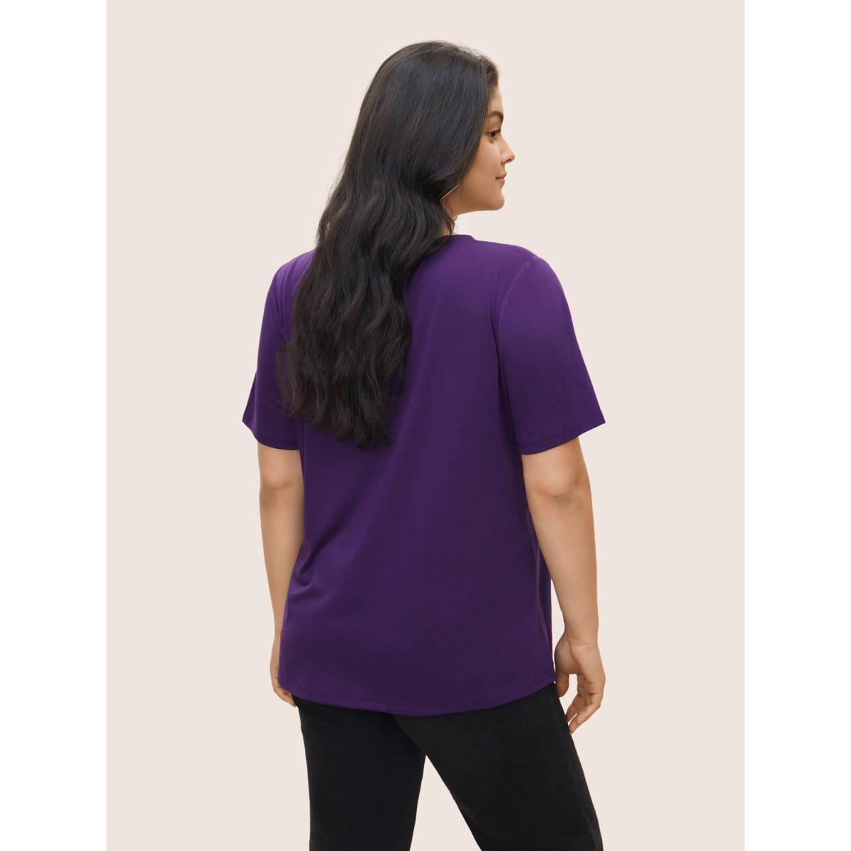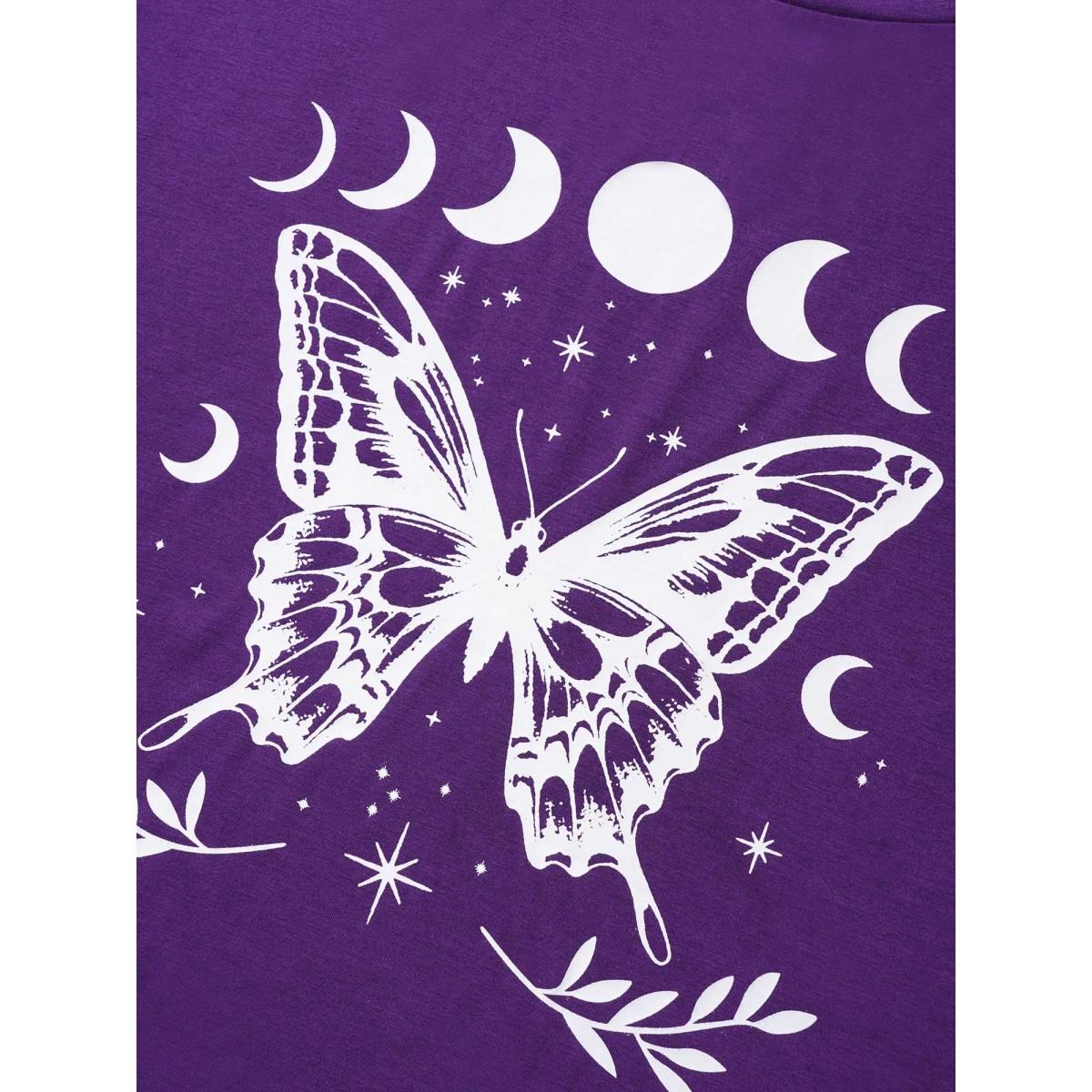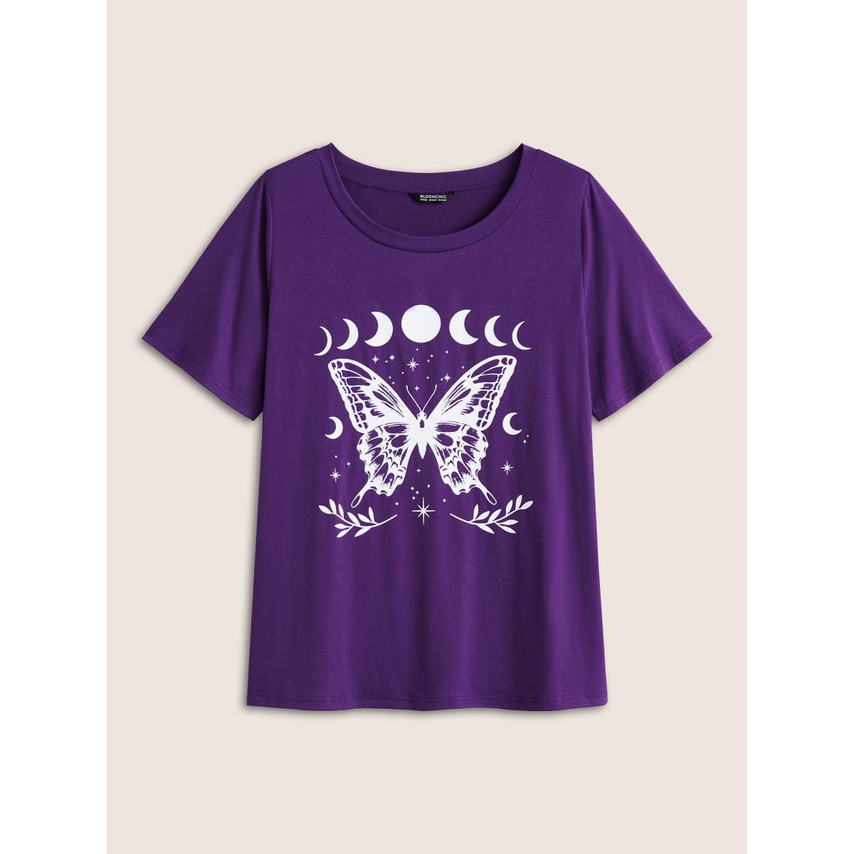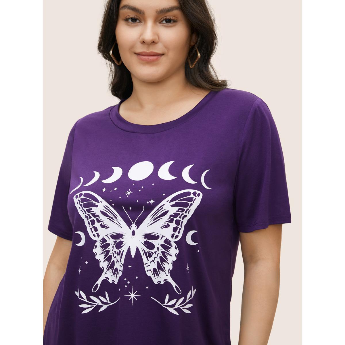 Plus Size Butterfly & Moon Print Round Neck T-shirt Eggplant Women Casual Non Star and moon Everyday T-shirts BloomChic 10/M