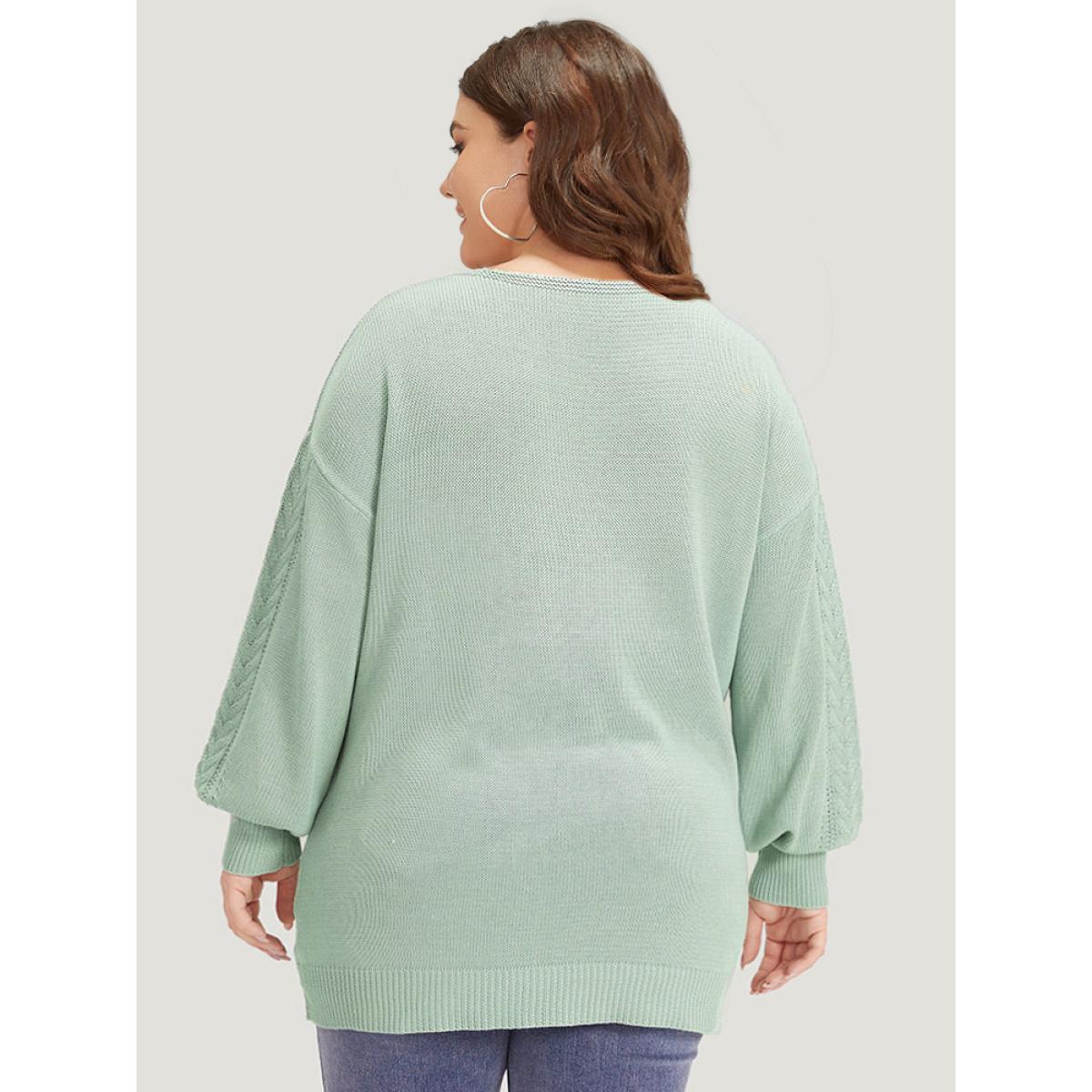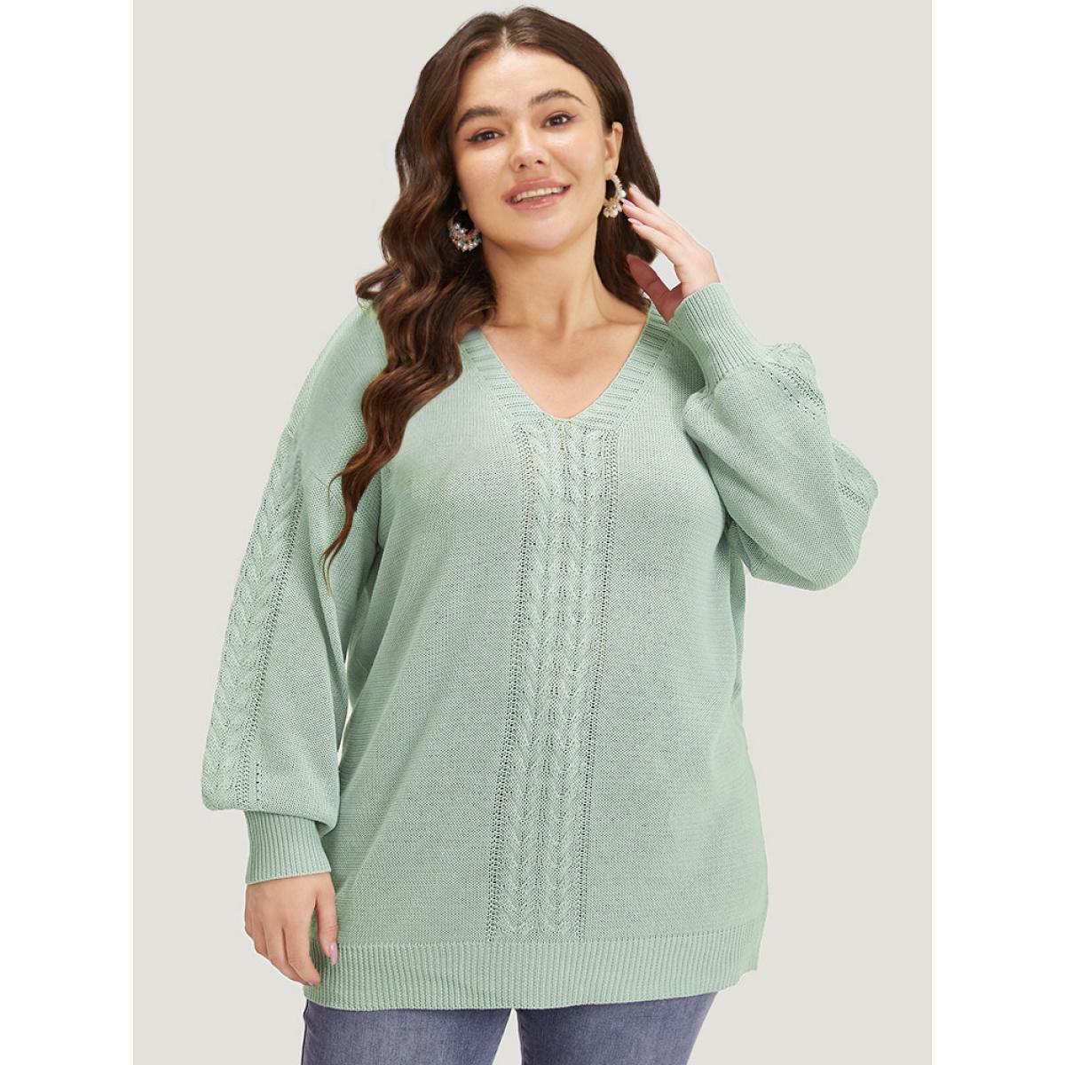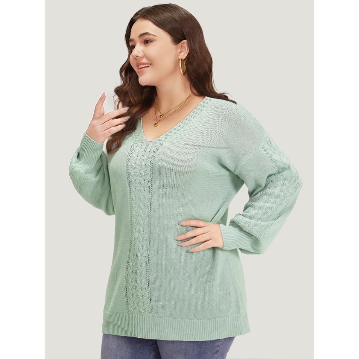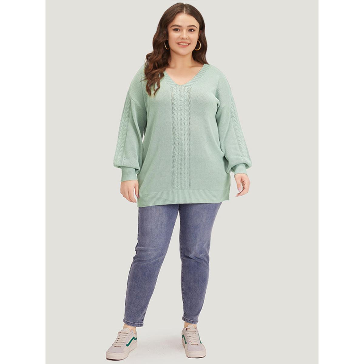 Plus Size Cable Knit Lantern Sleeve Drop Shoulder Pullover Mint Women Casual Loose Long Sleeve V-neck Dailywear Pullovers BloomChic 30/6X