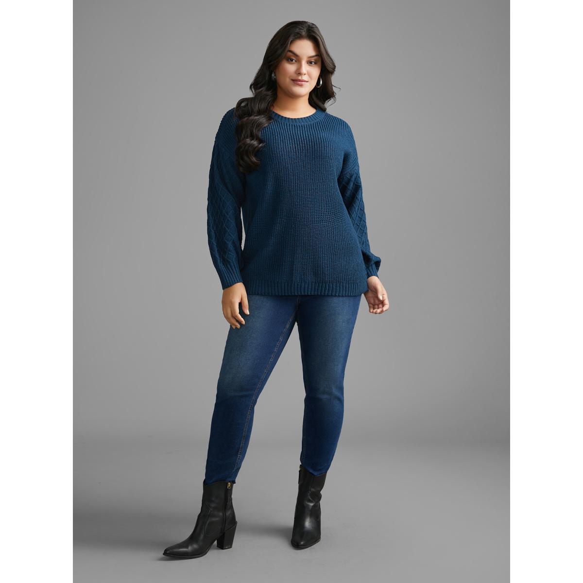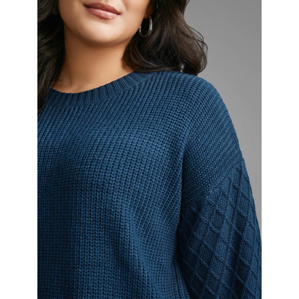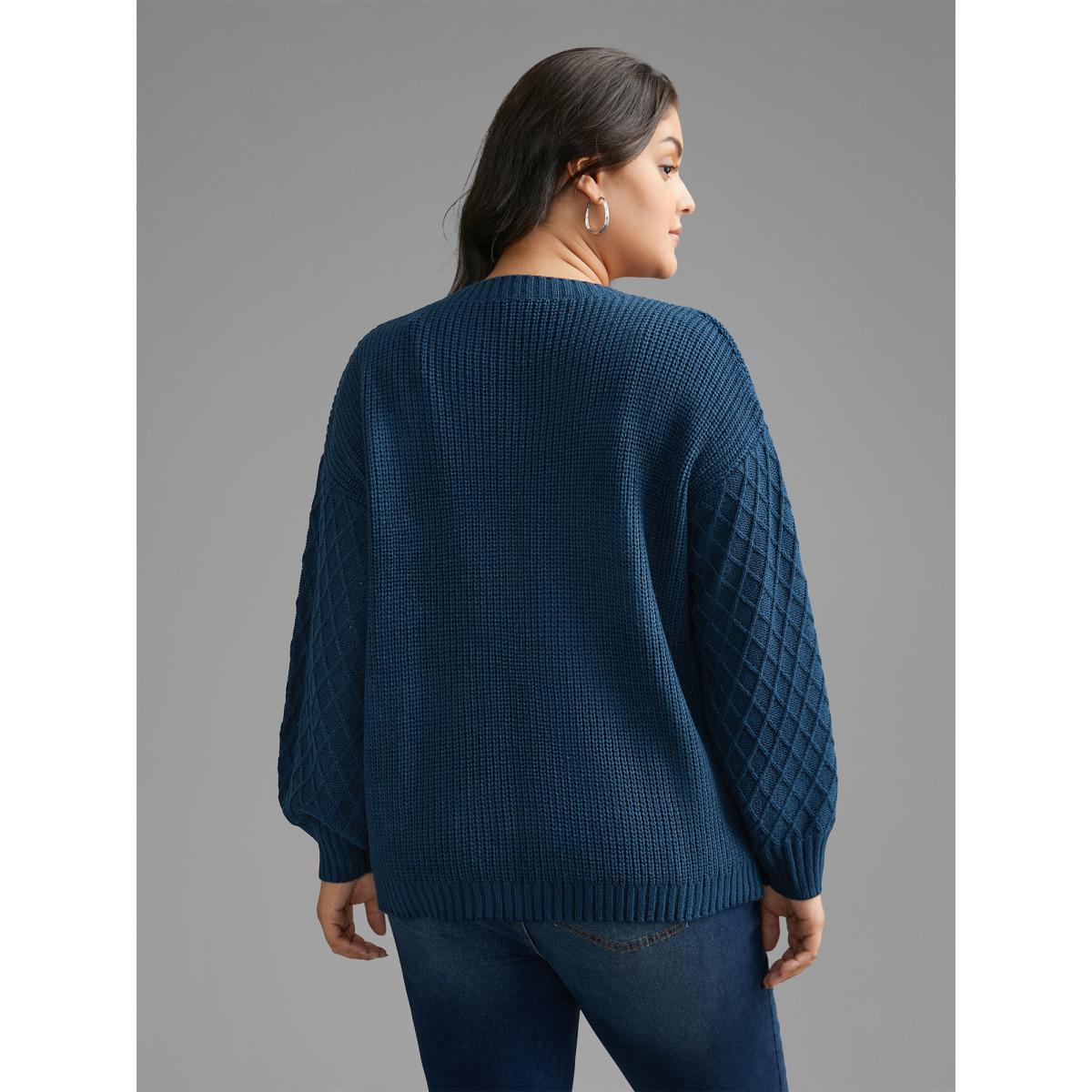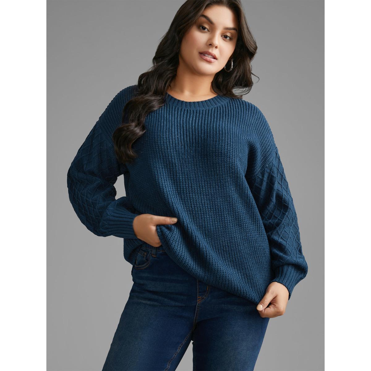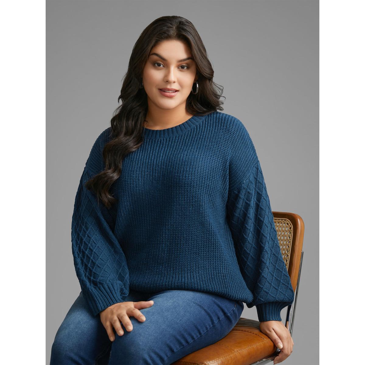 Plus Size Cable Knit Texture Lantern Sleeve Pullover Aegean Women Casual Loose Long Sleeve Round Neck Everyday Pullovers BloomChic 18-20/2X