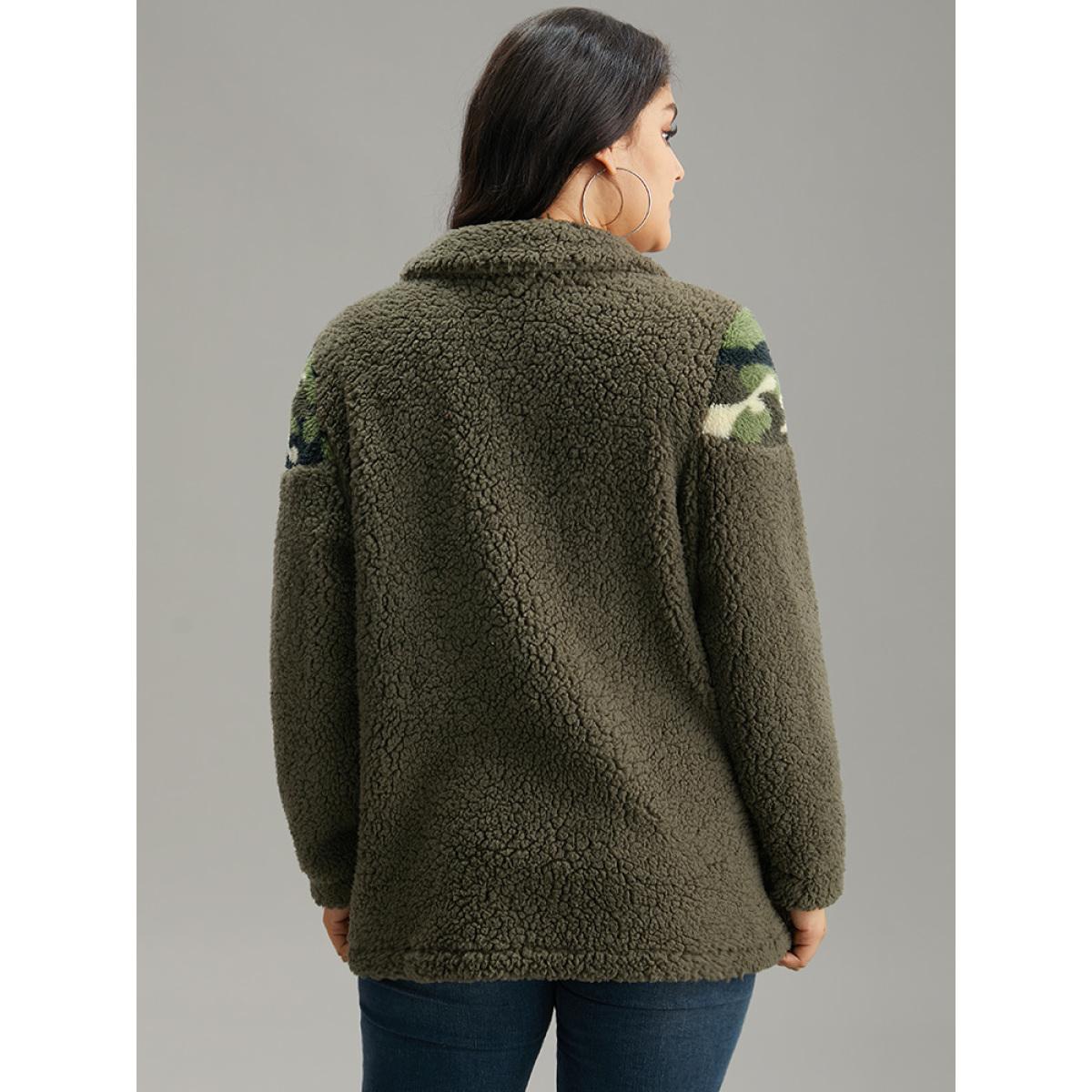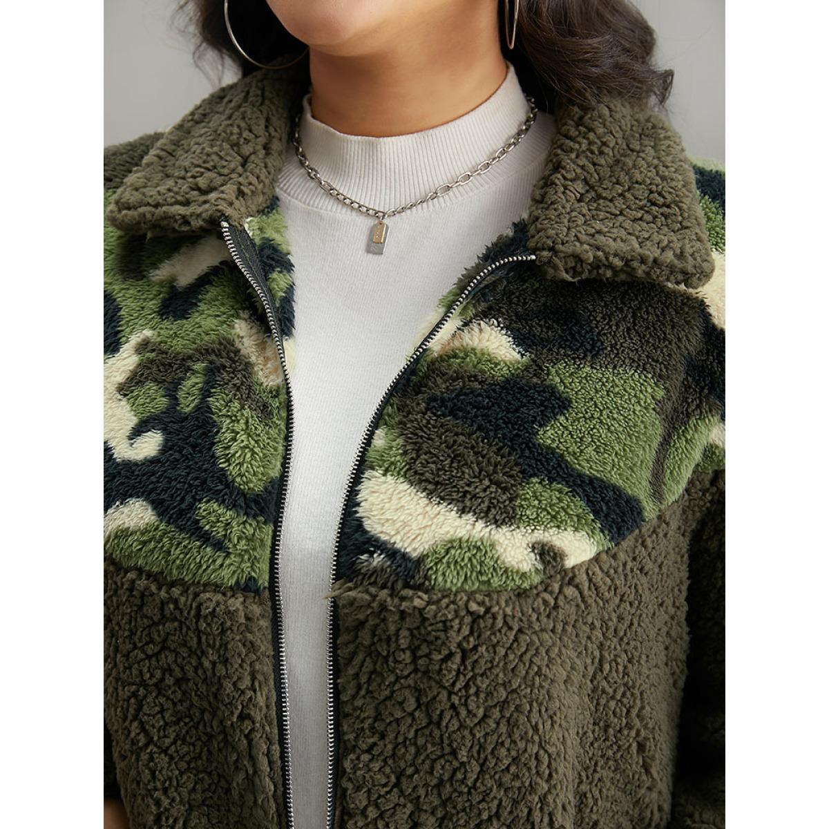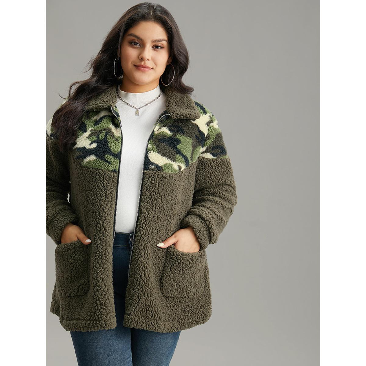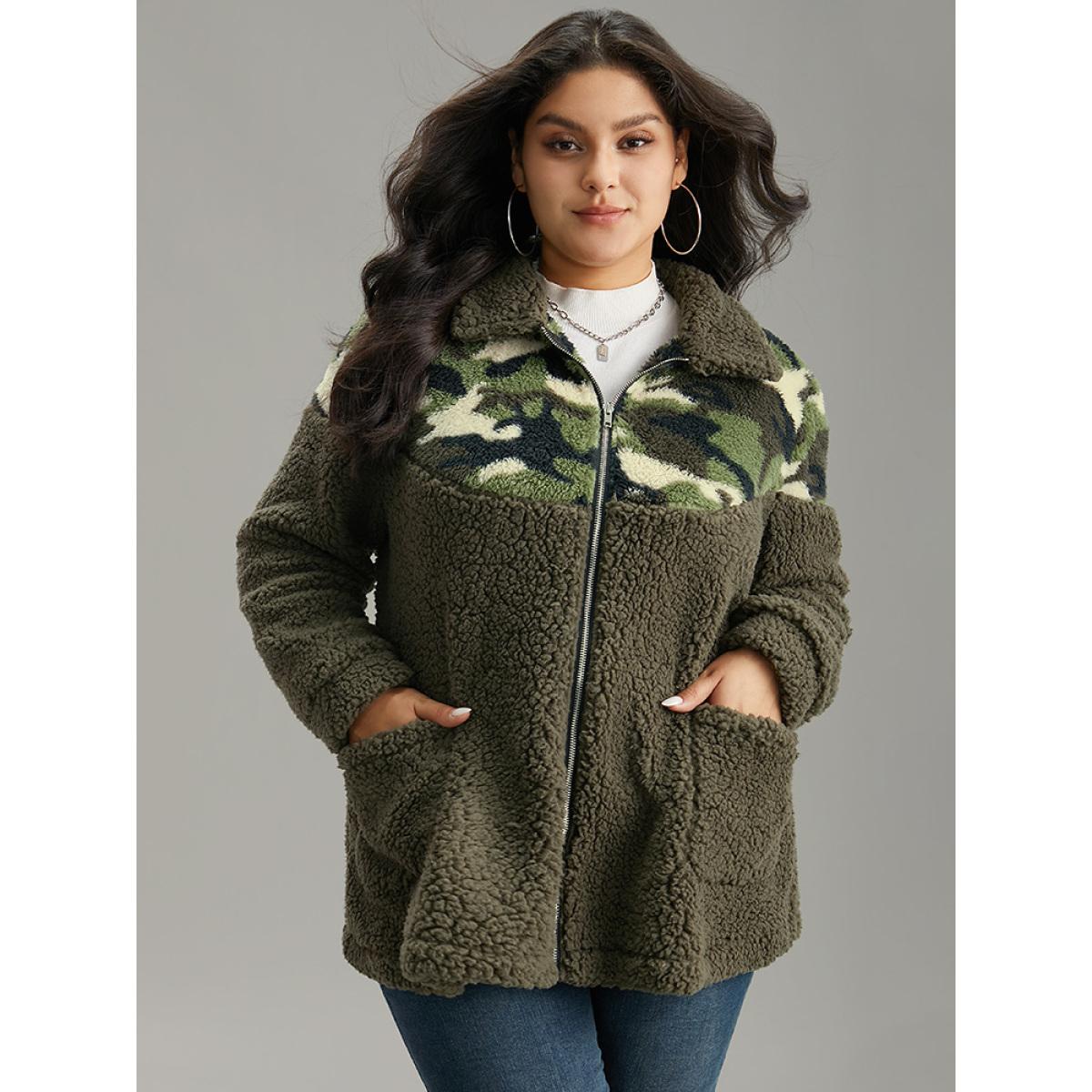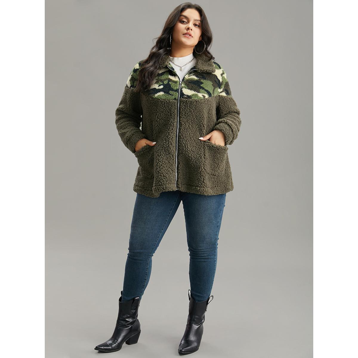 Plus Size Camo Patchwork Zipper Pocket Teddy Jacket Women ArmyGreen Contrast Pocket Dailywear Jackets BloomChic 14-16/1X