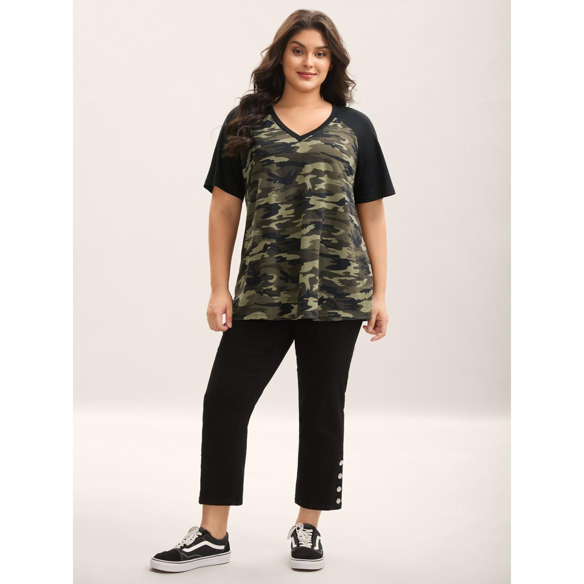 Plus Size Camouflage Print Raglan Sleeve T-Shirt Black Women Leisure Contrast V-neck Casual T-shirts BloomChic 26/4X