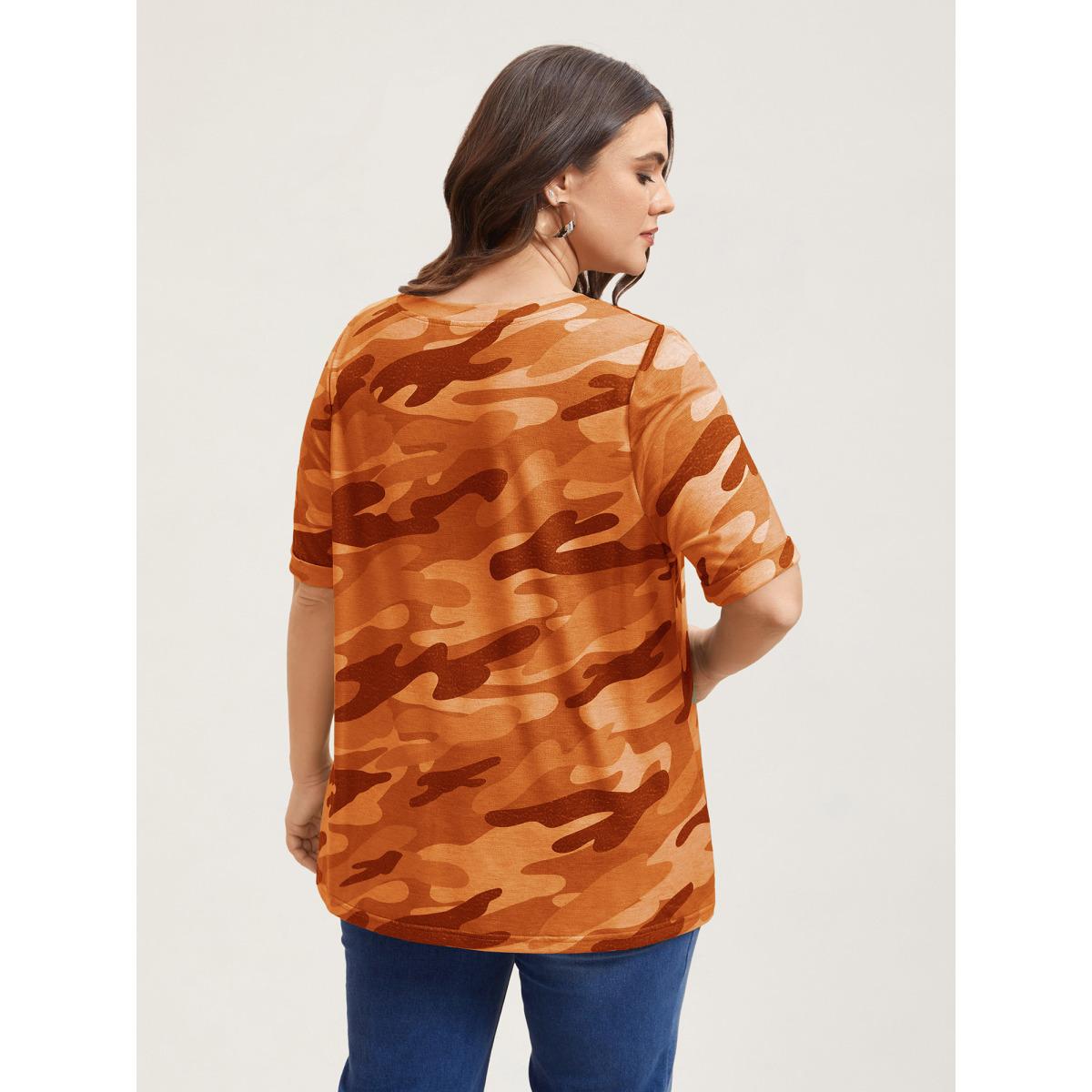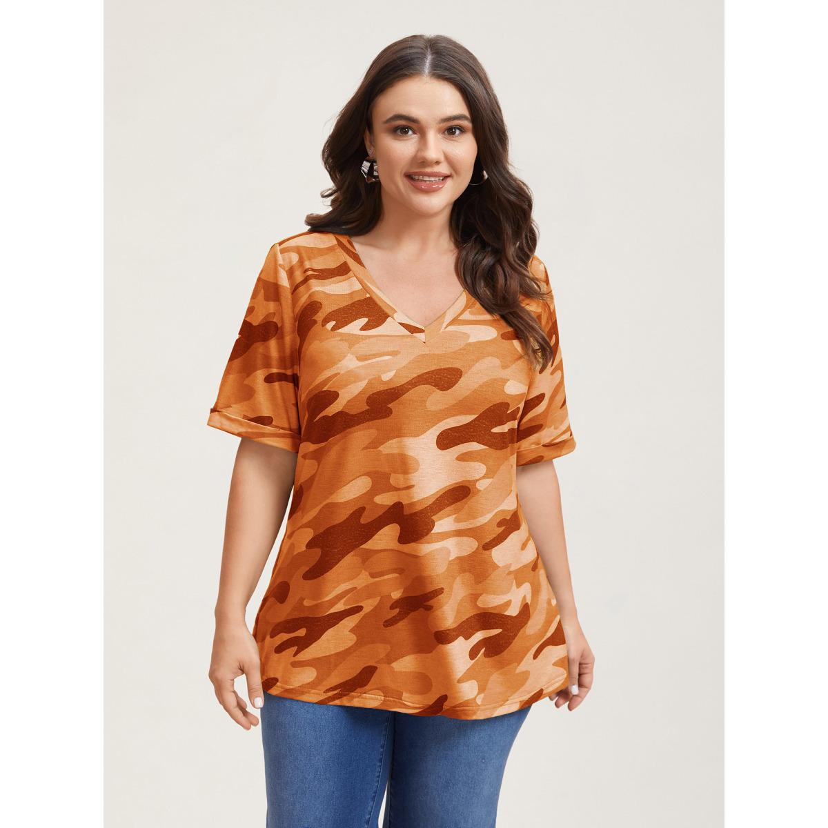 Plus Size Camouflage Print V-Neck Curvy T-Shirt Coral Women Leisure Roll Hem V-neck Casual T-shirts BloomChic 26/4X Product Image
