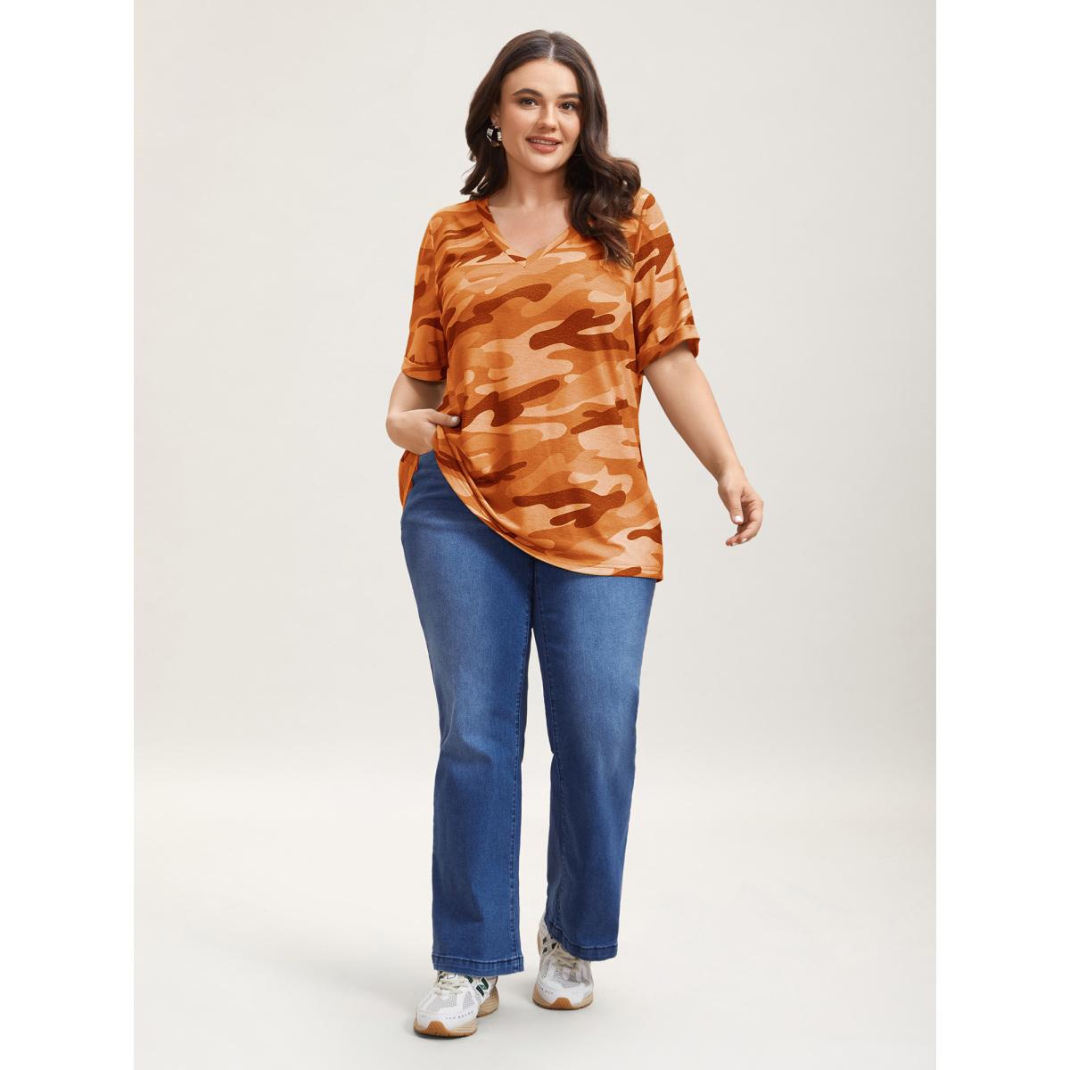 Plus Size Camouflage Print V-Neck Curvy T-Shirt Coral Women Leisure Roll Hem V-neck Casual T-shirts BloomChic 26/4X